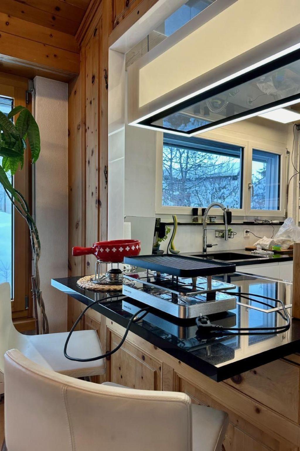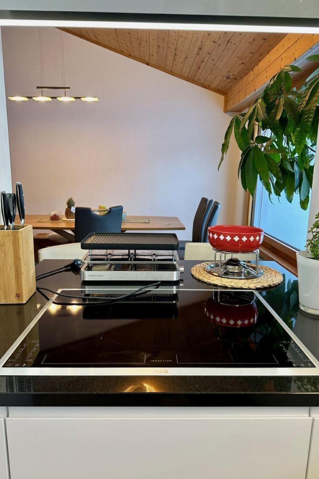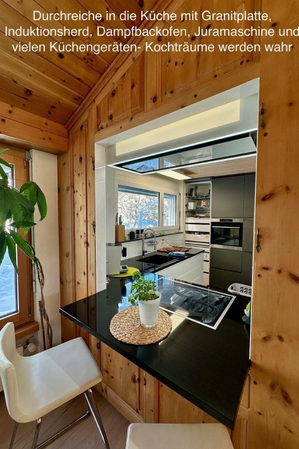 Sonstige Kücheneinrichtung (Küche1): Neu eingebaute Küche in den Farben antrazit und weiss, mit einigen speziellen Designelementen wie einen höhenverstellbaren Dunstabzug und einer kleinen Sitzbar, durchlaufende Granitplatte mit offener Durchreiche zum Esszimmer, abgetrennte und doch offene Küche mit Blick in den Garten, übergrosses Induktionsfeld mit Flexinduktion und großem Spülbecken, Geschirrspüler Big Size, Kühlschrank mit Gefrierfach, Dampfbackofen. Diverse Vorräte des träglichen Gebrauchs werden immer frisch aufgefüllt. Der Kaffee kommt aus dem Jura Vollautomat oder diversen French Presses, ganz nach Wahl. Die Ausstattung wird dich begeistern und Kochliebhabern schlägt das Herz höher: Im Eigentumsstandard eingerichtet mit vielen Elektrogeräten wie Raclette, Fondue, Küchenmaschine, Waffeleisen, Schokofondue, heissem Stein....hier findest du (fast) alles.