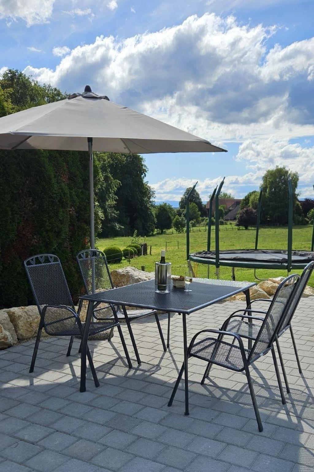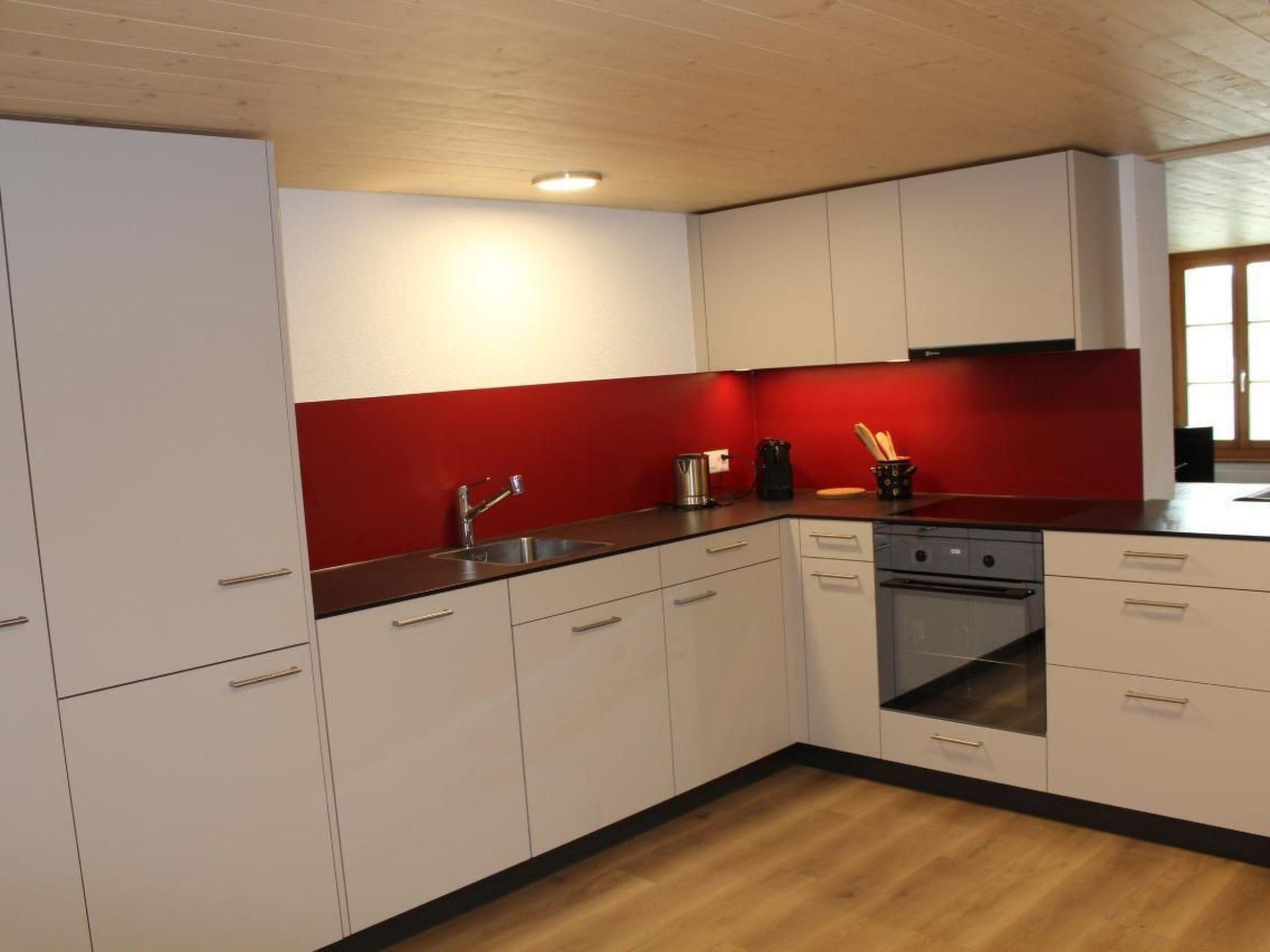 Küche mit Abwaschmaschine, Mikrowelle, Kühlschrank mit separaten Gefrierfächern, Backofen und Kochherd, Wohnzimmer mit Esstisch, Couch und TV. Badezimmer mit begehbarer Dusche und WC. WLAN steht gratis zur Verfügung. Der zur Wohnung gehörende Sitzplatz wurde im Frühling 2024 neu erstellt und befindet sich unmittelbar beim Kinderspielplatz. Für die Kinder gibt es ein Trampolin, eine Rutschbahn und mehrere Kinderschaukeln. Unseren neuen Pool dürfen Sie natürlich auch gerne mitbenutzen. Vom Sitzplatz aus geniessen Sie einen wunderschönen Blick Richtung Jura und können unseren Angus-Rindern beim Weiden zusehen.