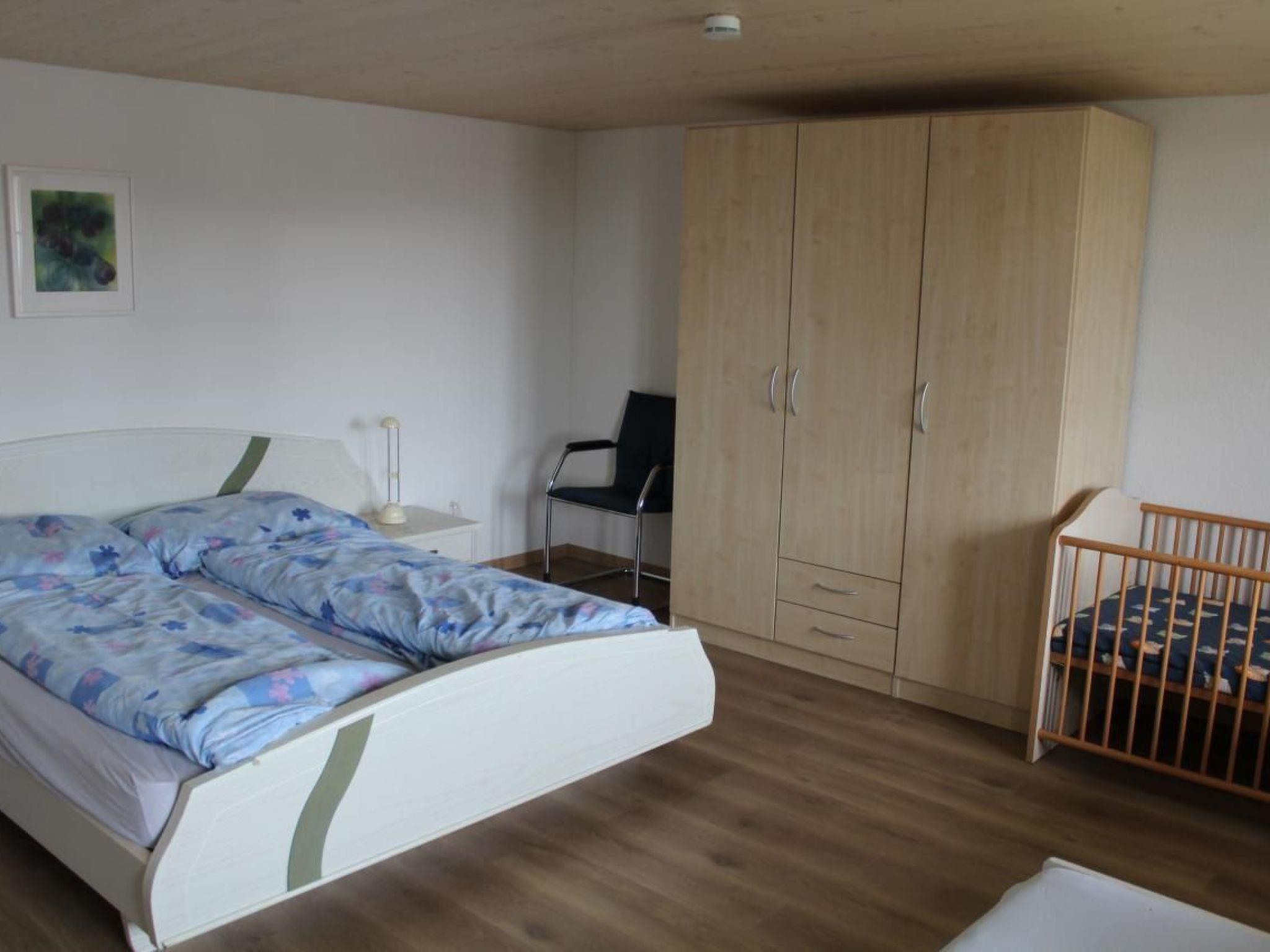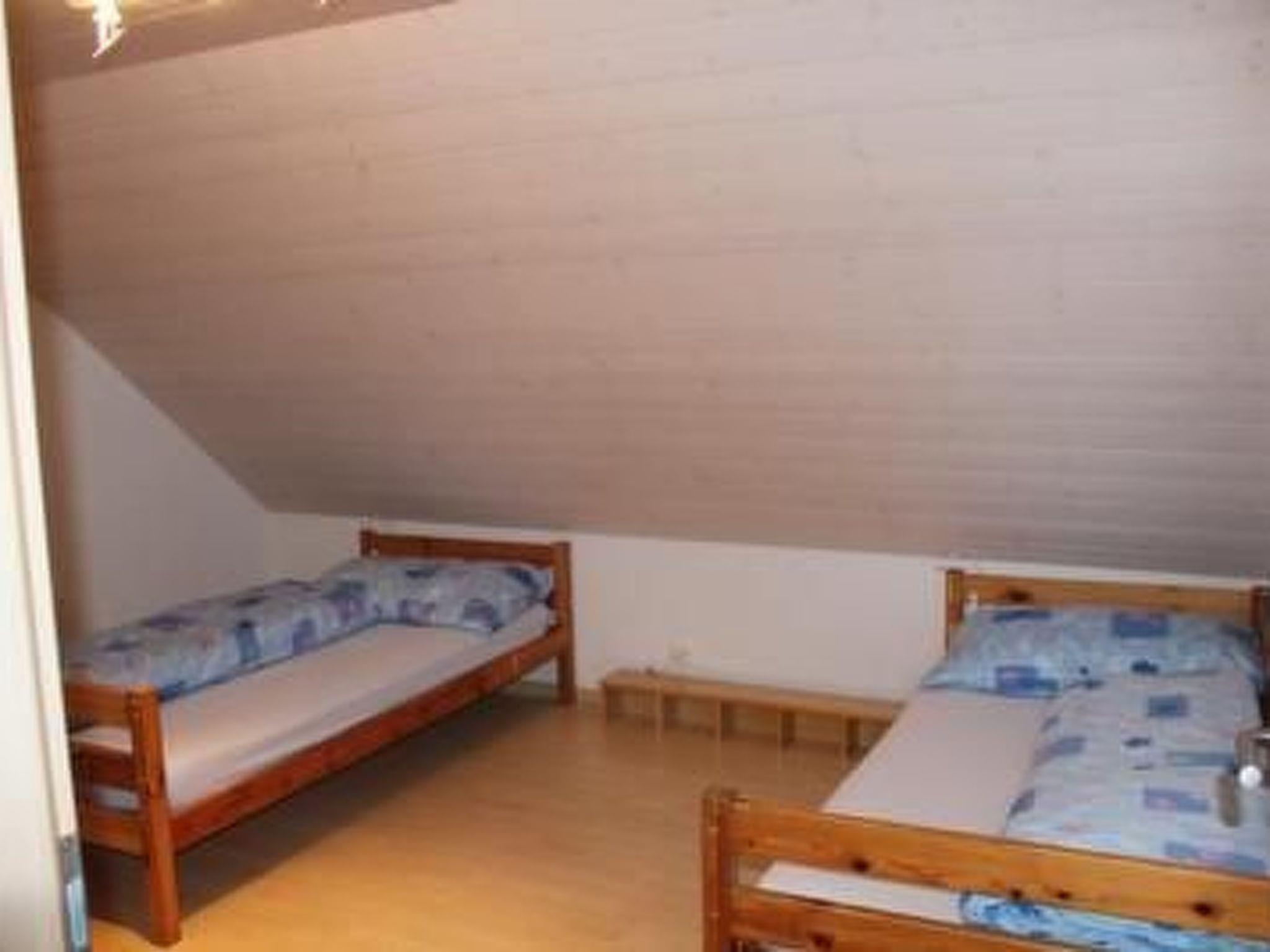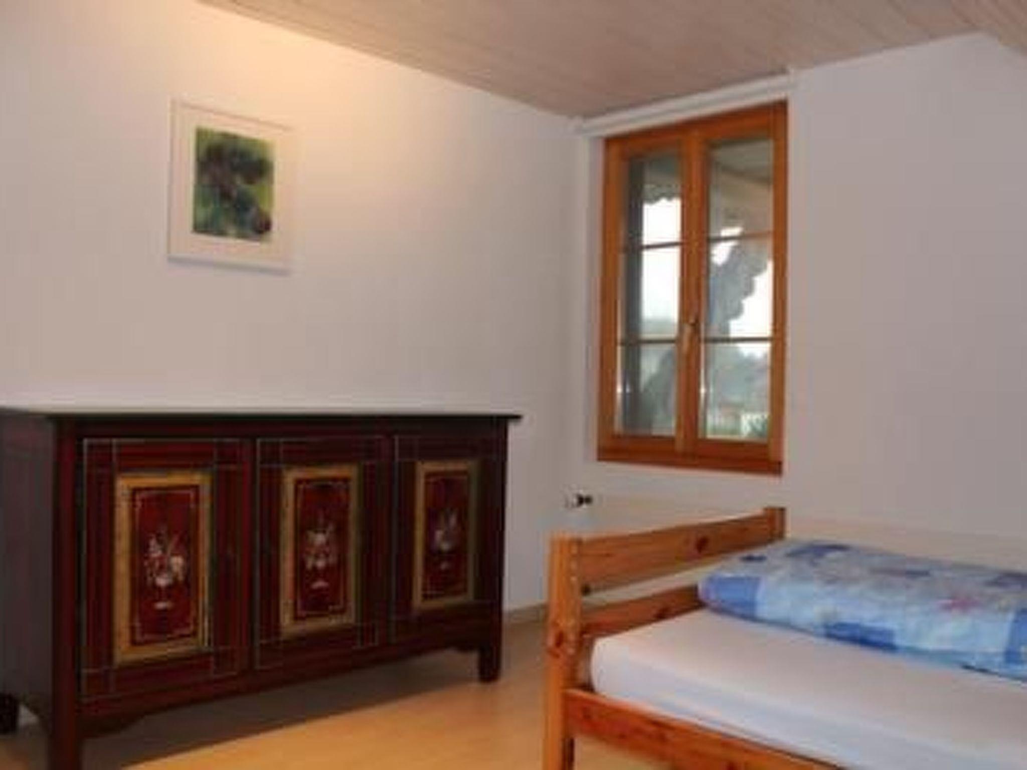Grosses Schlafzimmer mit 1 Doppelbett, 1 Kleinkinderbett (für Kinder bis ca. 2 Jahren geeignet) und einem Zusatzbett nur für Kinder bis ca. 12 Jahren (+ Fr. 10.00 pro Nacht), Kinderzimmer mit zwei Einzelbetten.