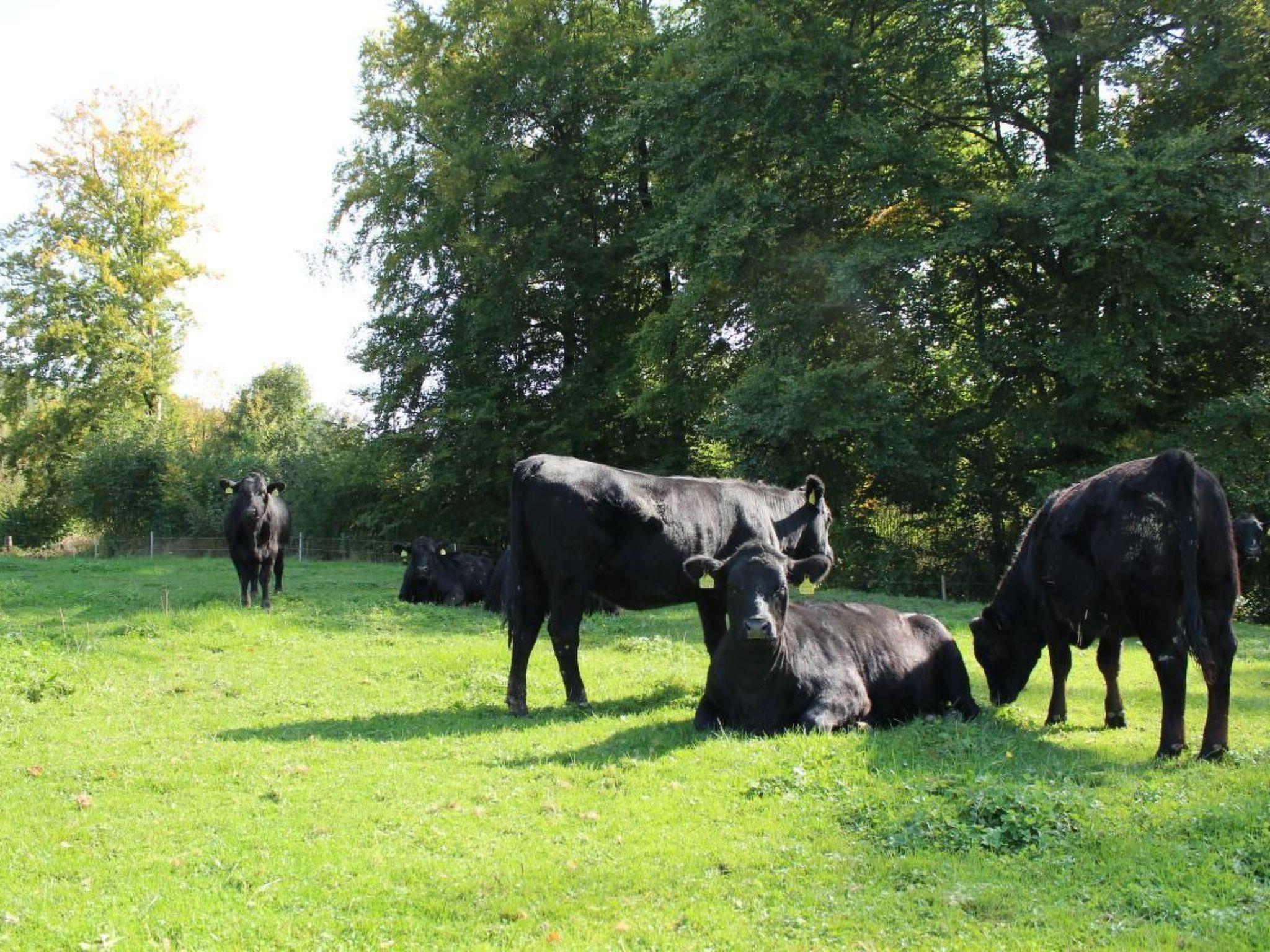 Auf unserem Hof halten wir Angus-Rinder und Schweine. Unser Kater Leo nimmt gerne Streicheleinheiten entgegen.