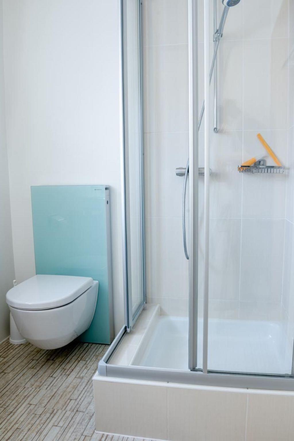 Dusche/WC sind komplett neu gestaltet. Im Eingangsbereich ist eine Garderobe mit angrenzendem Putzschrank.