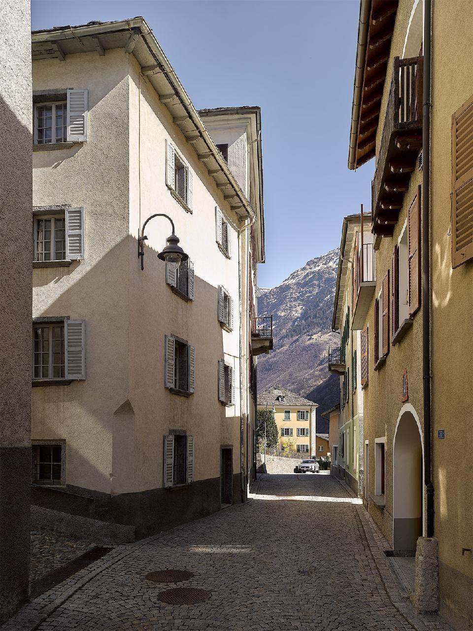 Haus liegt an der engen Dorfgasse mitten im Zentrum. Wie in den Dörfern der Südschweiz üblich, stehen die Häuser eng beieinander oder sind aneinander gebaut. Man begrüsst sich hier unter Nachbarn von Fenster zu Fenster und hält auf diese Weise einen kleinen Schwatz. Beim Eingang bietet ein winziges Plätzchen die Möglichkeit einen kleinen Gartentisch mit ein paar Stühlen aufzustellen.