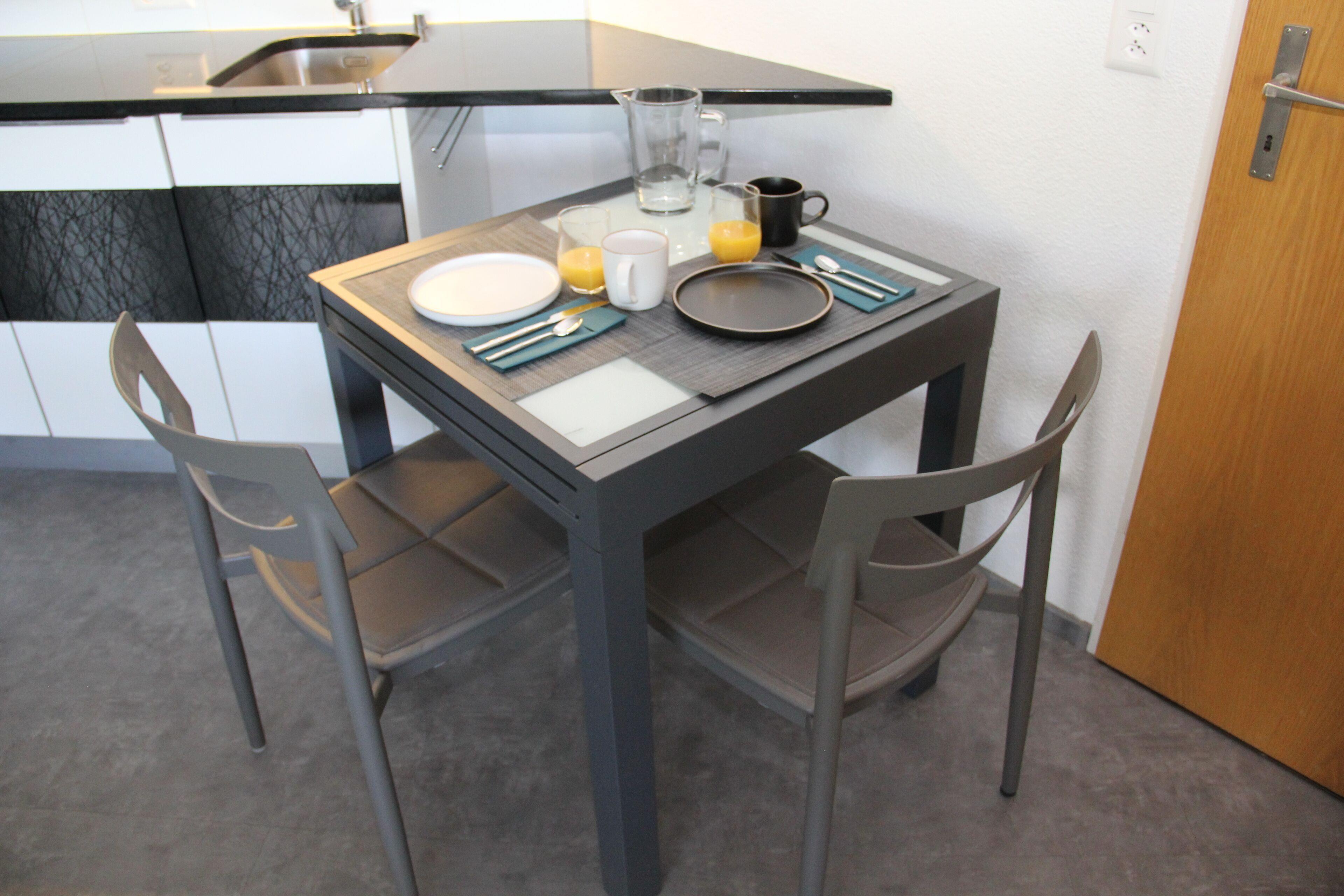 Offene Küche mit Geschirrspüler, Kühlschrank, Glaskeramikherd, Backofen, Mikrowelle und Kaffeemaschine
