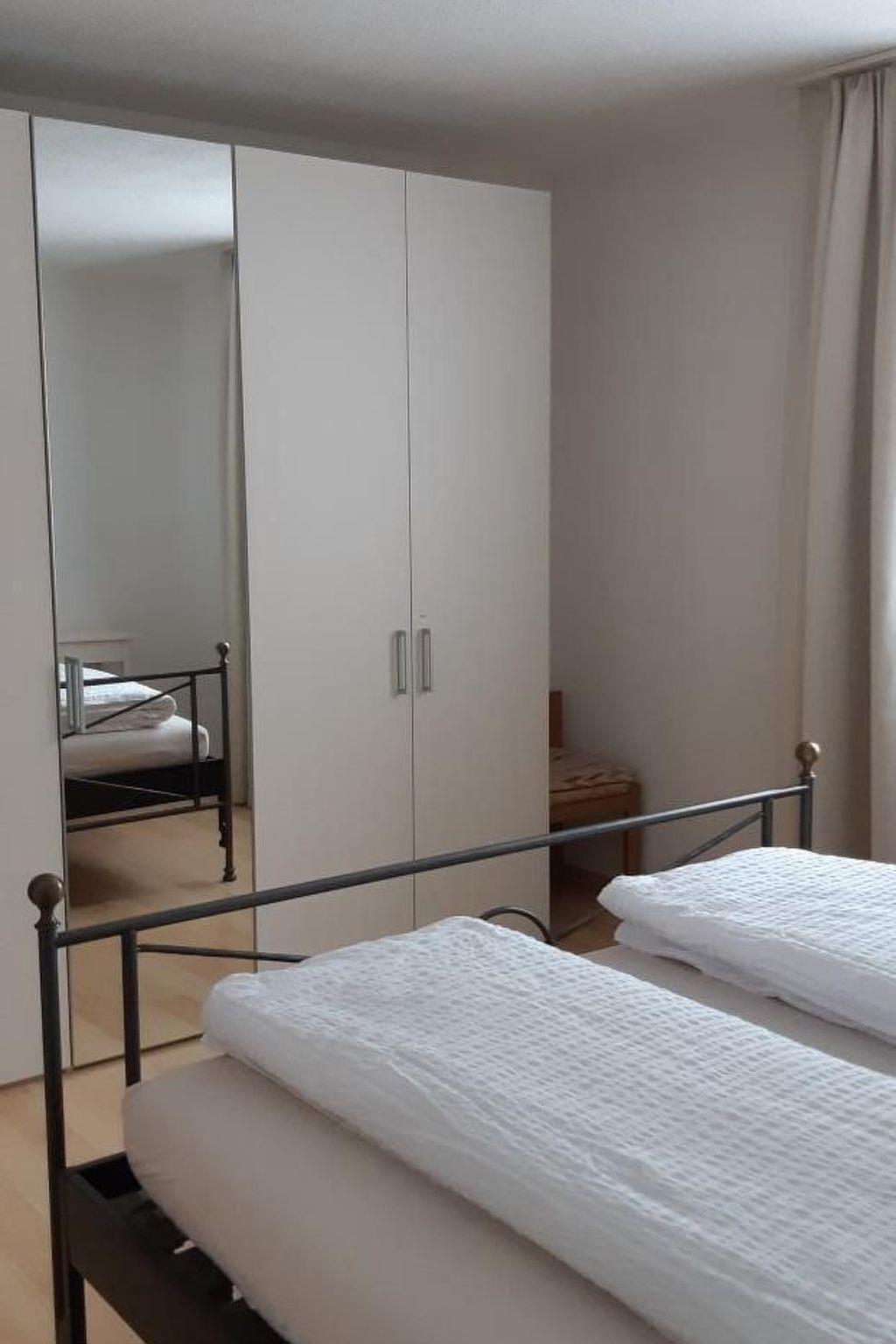 Schlafzimmer 1: Das Schlafzimmer verfügt über ein Doppelbett (160cm), einen geräumigen 3-türigen Schrank und ein integriertes Badezimmer mit Lavabo, Badewanne mit Duschvorhang, WC, Bidet und ein Fenster.