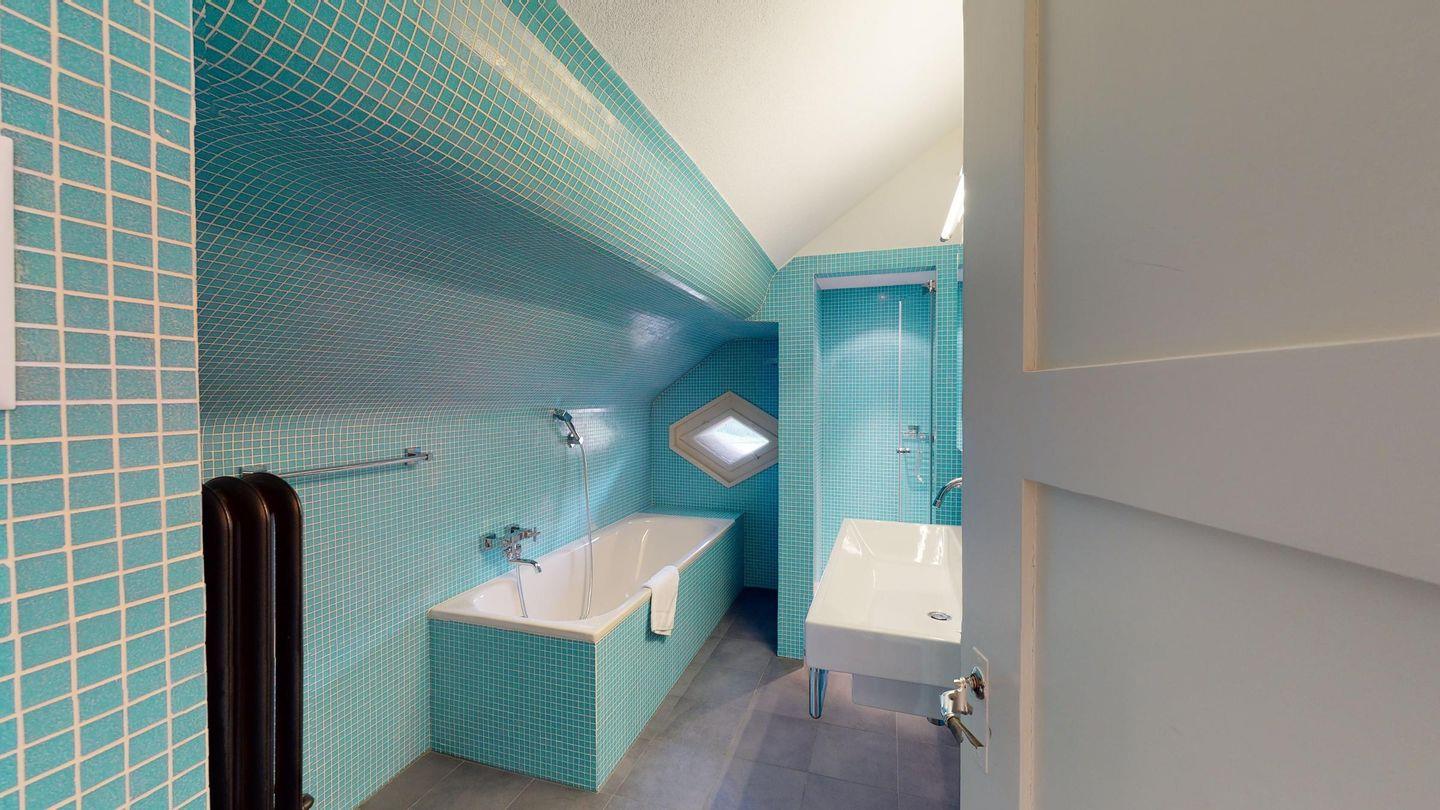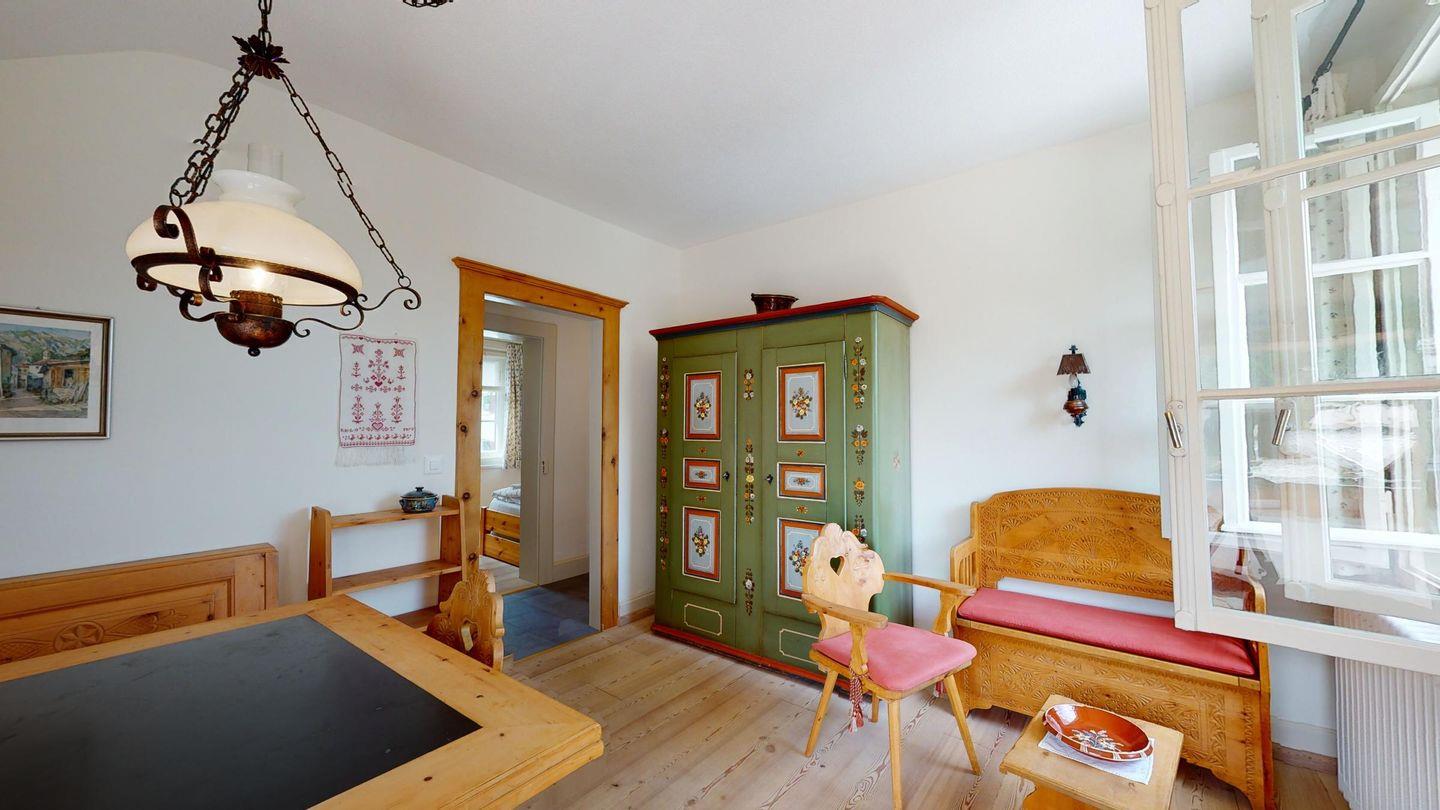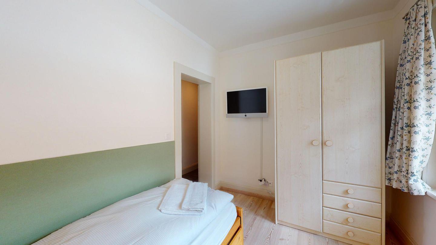 3-Zimmer-Wohnung im Dachgeschoss für 4 Personen. Eingang mit Garderobe, Wohnzimmer mit Wohn- und Essbereich und Ausgang zum Dachbalkon. Geschlossene Küche mit Ofen und Geschirrspüler, Chicco d'Oro Kaffeemaschine, Raclette und Fondue Sets. Ein Doppelschlafzimmer mit TV. Ein Schlafzimmer mit zwei Einzelbetten und TV. Badezimmer mit Bad, Dusche, WC und Lavabo. 1 Parkplatz. Gemeinsame Waschküche und Skiraum. Haustiere sind nicht erlaubt.