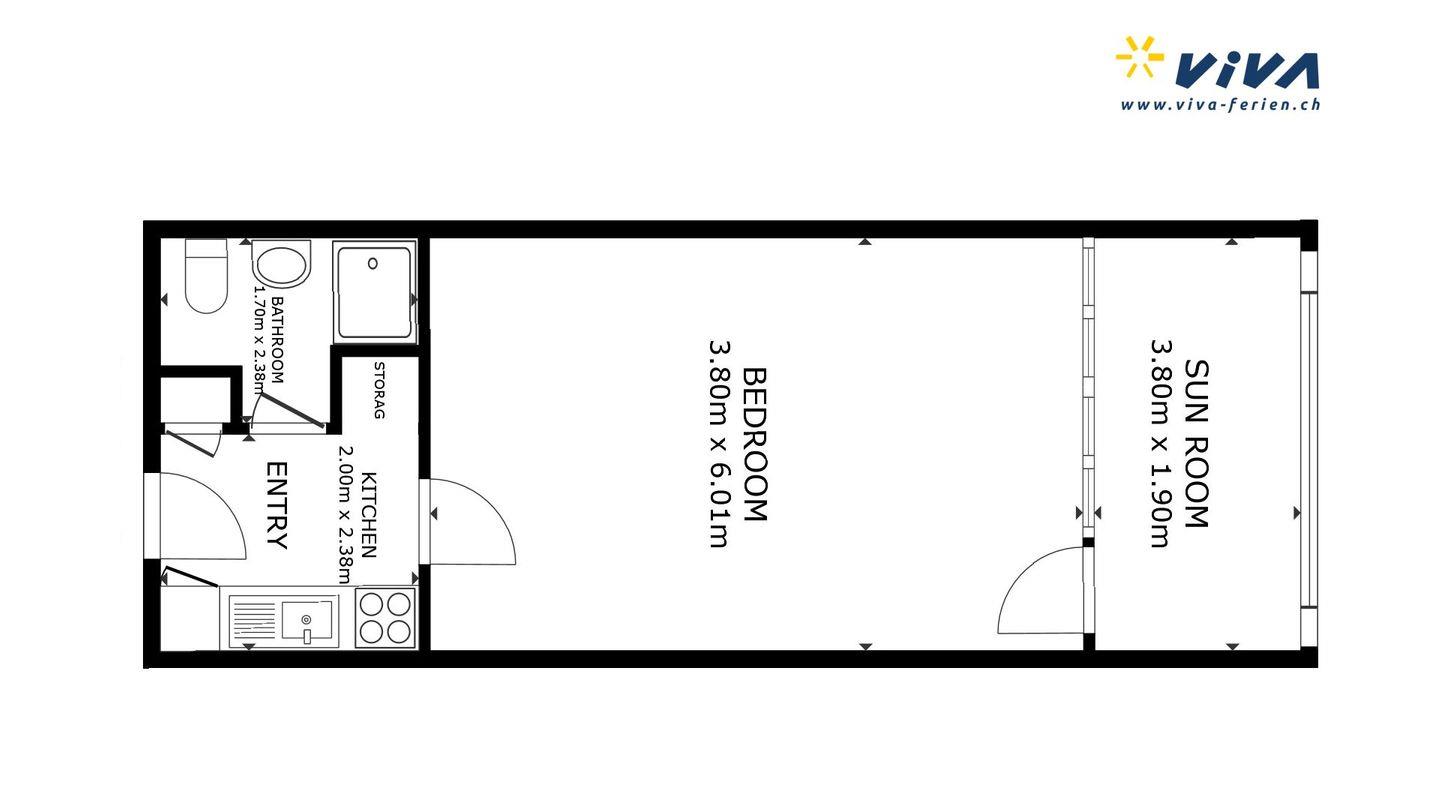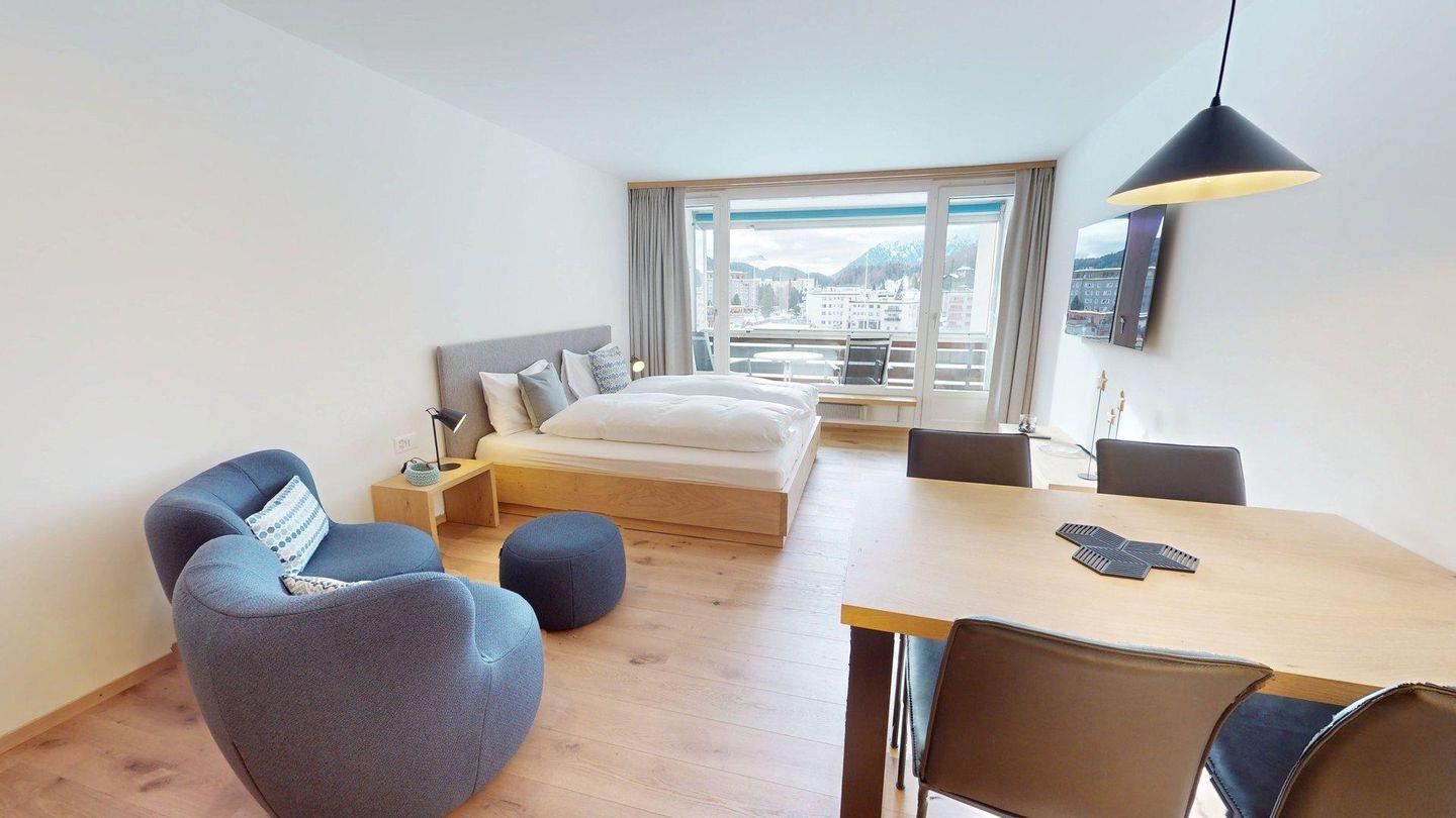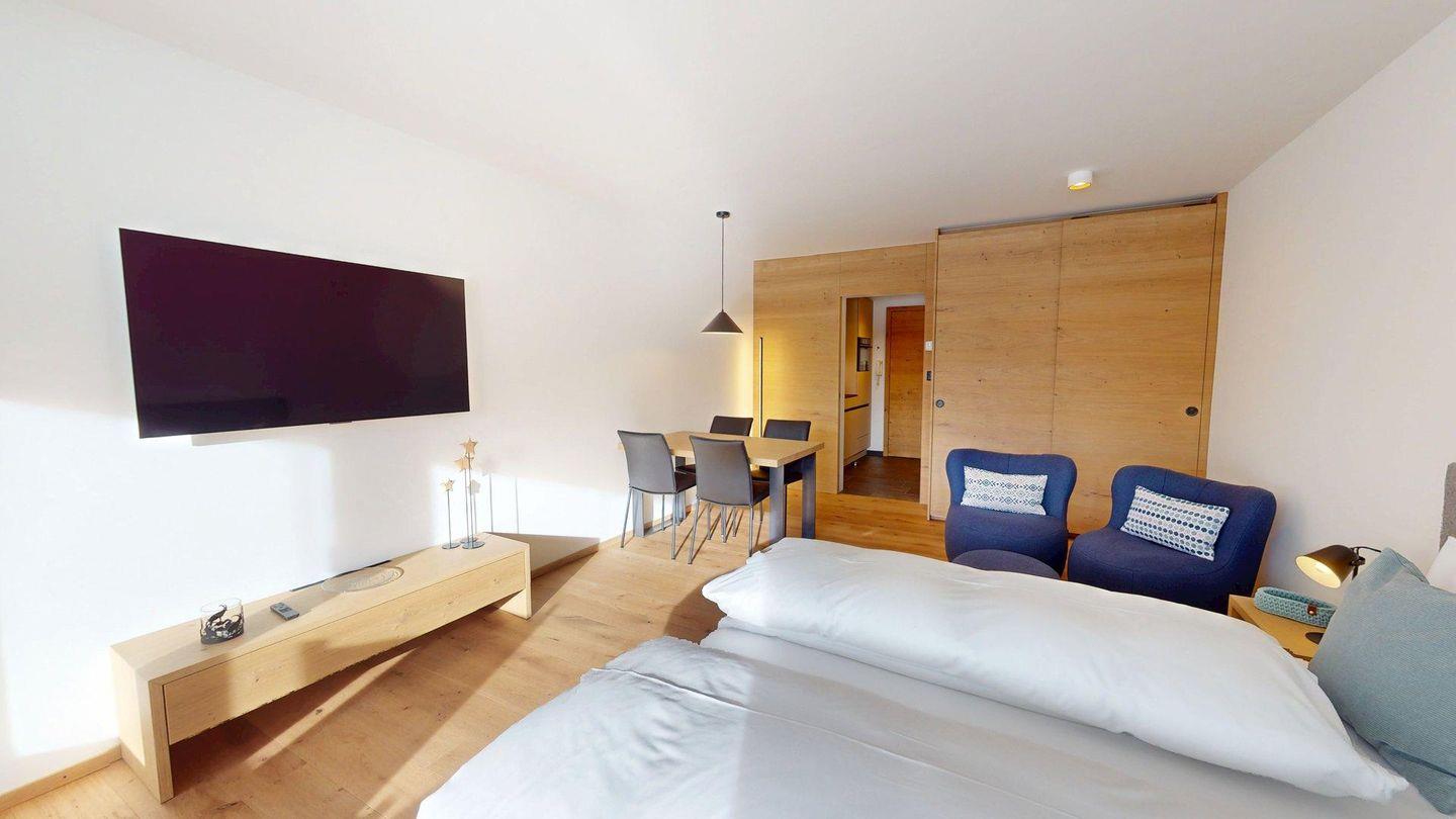 Gemütliche 1-Zimmer-Ferienwohnung im 4. Obergeschoss, eingerichtet im traditionellen Engadiner Stil. Wohn- /Esszimmer mit 2 integrierten Schrankbetten 80 x 200. Überdachter Balkon mit Aussicht. Kleine Küche. Bad mit Dusche. Beschränkte Anzahl Aussenparkplätze (max. 1 Auto/Wohnung, nicht reserviert). Fitnessraum zur öffentlichen Nutzung befindet sich im Ferien-Wohnhaus.