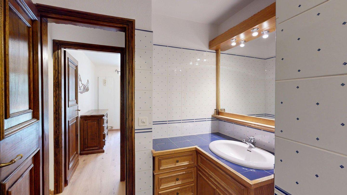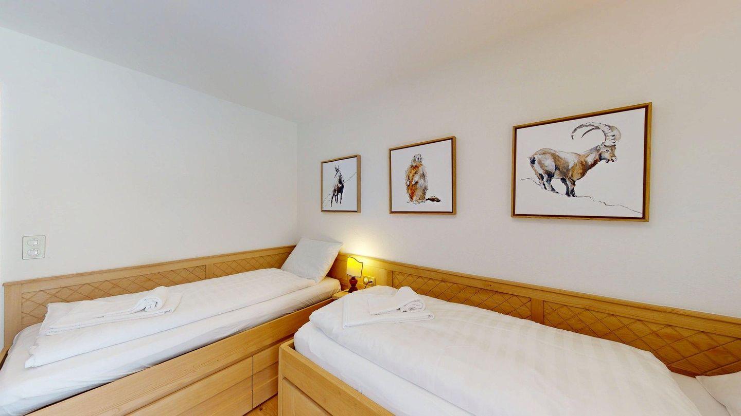Praktische 3 - Zimmer - Duplex Ferienwohnung im 1. Stock. Ca 105 m2. Eingang mit Gäste-WC. Wohn-/Esszimmer mit Kamin, Balkon, offene Küche. Unterer Stock: Schlafzimmer mit 2 separaten Betten plus 1 Ausziehbett, 1 DU/WC. Doppelschlafzimmer mit Bad/DU/WC. Terrasse. Lift. Garage Nr. 25.