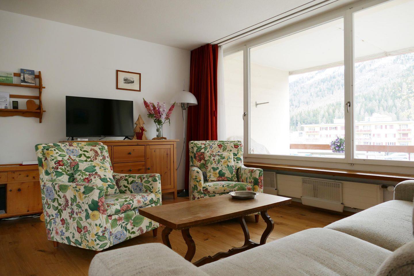 Zweckmässige 2-Zimmer Ferienwohnung im 1. Stock. Ca. 54 m2. Wohn-/ Esszimmer mit Sofabett. Doppelschlafzimmer. Balkon Süd. Separate Küche mit Geschirrspüler, Bad/Dusche, WC. Lift.