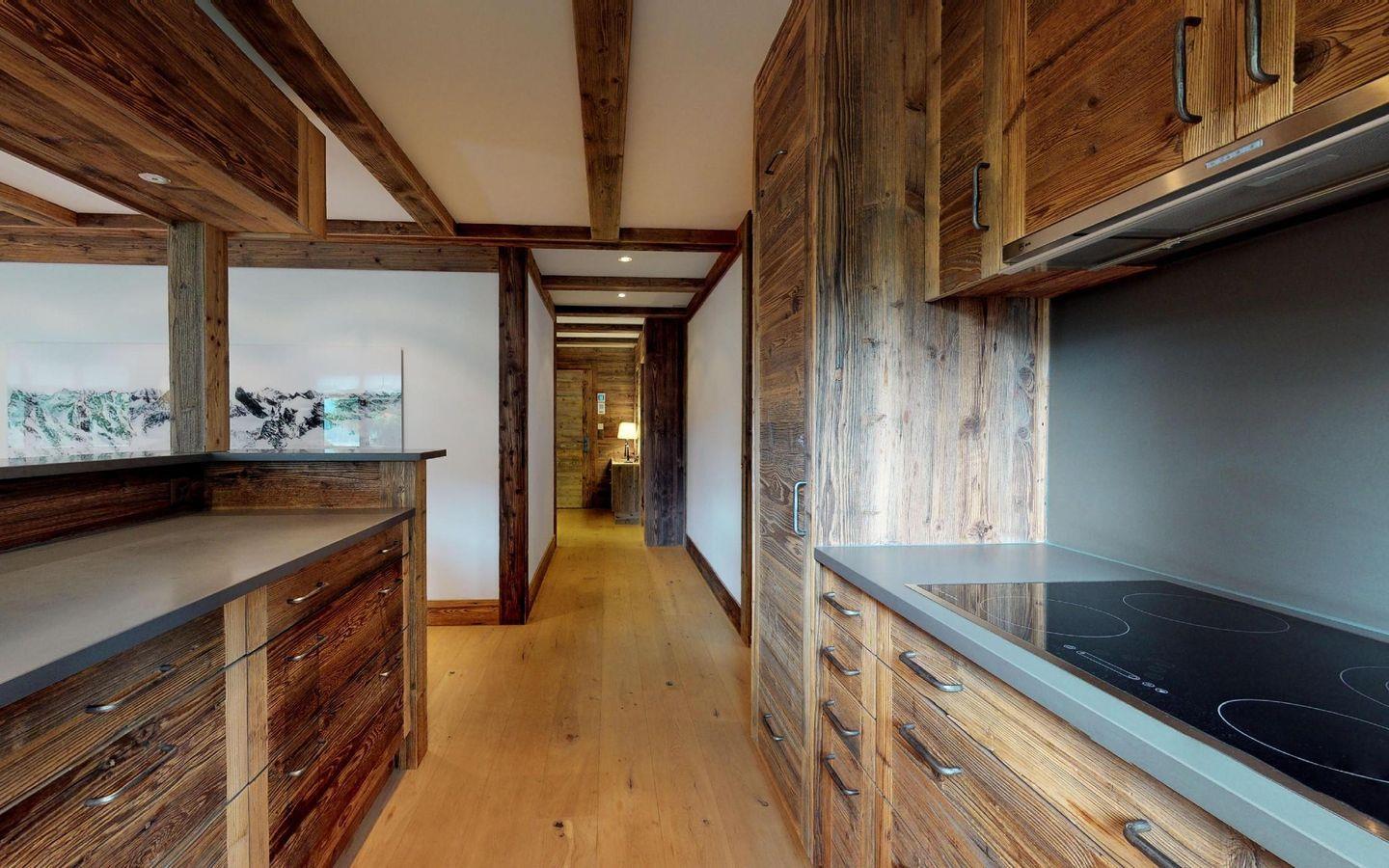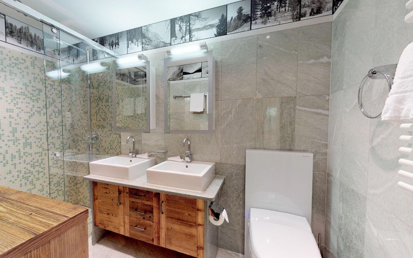 Luxuriöses Design im 'mountainstyle' widerspiegelt diese super attraktive 3-Zimmer Ferienwohnung im 2. Stock. Grosszügiges Wohn- /Esszimmer mit offener Küche, Kamin-Cheminee und Balkon. Grosses Elternschlafzimmer mit Ankleide und TV. 1 kleines Doppelschlafzimmer mit Doppelbett. 2 separate Duschen. Lift. Eigene Garage.