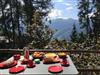 Aus der zur Küche und zum Wohnbereich offene Essecke für 4 Personen kannst du das Feuer im offenen Kamin und den Ausblick auf das Bergpanorama genießen. Schließlich gibt es noch einen Wohnbereich mit Kamin, Sofa und Schreibtisch und den Zugang zum Balkon mit gemütlichen Sesseln und einem Esstisch für 4 Personen.