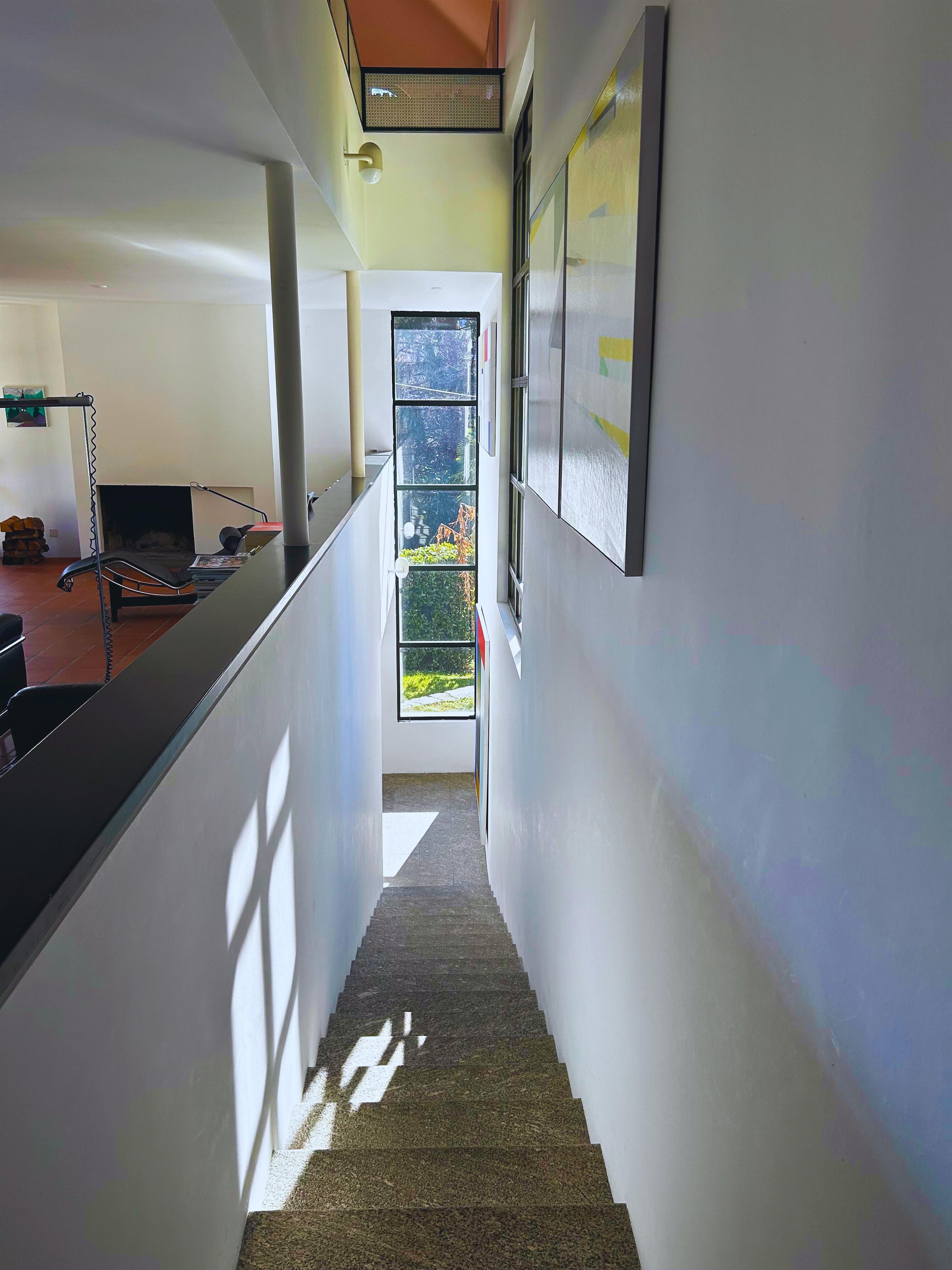 Daher ist auch die Villa Cavalli äußerst ästhetisch in die Umgebung eingebettet. Das 1976 erbaute Meisterwerk schmiegt sich an einen ehemaligen Rebberg und liegt in herrlicher Stille nur 100 Meter vom Dorfkern entfernt. Der aus dem "Zentrum" herausführende, von einer pittoresken Steinmauer gesäumte Fußweg "Caraa du Vanign" scheint direkt in das Haus hineinzulaufen und setzt sich im Inneren als "Promenade architecturale" mit einer lichtvollen Granittreppe fort, deren Luftraum bis ins Dach reicht.