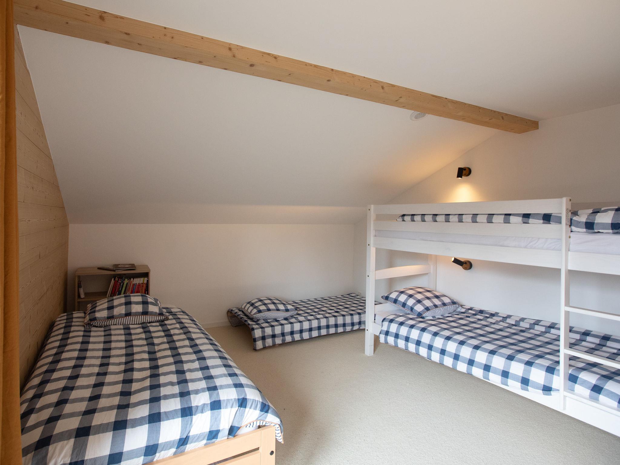 "Chalet Shambala", 7-Zimmer-Chalet 200 m2 auf 3 Stockwerken, Südlage. Modern und geschmackvoll eingerichtet: grosses Wohn-/Esszimmer mit offenem Kamin und Esstisch. Ausgang zur Terrasse, Richtung Süden und Richtung Westen. Kleines Büro. Offene Küche (Backofen, Geschirrspüler, 4 Induktionskochplatten, Toaster, Wasserkocher, Mikrowelle, Tiefkühler, elektrische Kaffeemaschine, Kapseln für die Kaffeemaschine (Nespresso) extra, Racletteofen, Fondue Set (Käse)). Sep. WC. Unteres Geschoss: 1 Doppelzimmer mit 1 franz. Bett (180 cm, Länge 200 cm). Spielzimmer mit TV. Dusche/WC. Obergeschoss: 1 Doppelzimmer mit 1 franz. Bett (1 x 160 cm, Länge 200 cm), Dusche/WC. Ausgang zum Balkon, Richtung Süden. 1 Kinderzimmer mit 1 x 2 Etagenbetten (90 cm, Länge 200 cm), 1 Ausziehbett (2 Pers. 2 x 90 cm, Länge 200 cm). Ausgang zum Balkon, Richtung Süden. 1 Doppelzimmer mit 2 Betten (80 cm, Länge 200 cm). Bad/WC. Balkon, Südlage Terrasse, Südlage und Westlage. Terrassenmöbel. Sehr schöne Panoramasicht auf die Berge. Zur Verfügung: Waschmaschine, Wäschetrockner, Babybett, Haartrockner. Internet (Wireless LAN, gratis). Parkplatz (2 Autos). Bitte beachten: Nichtraucher-Haus.