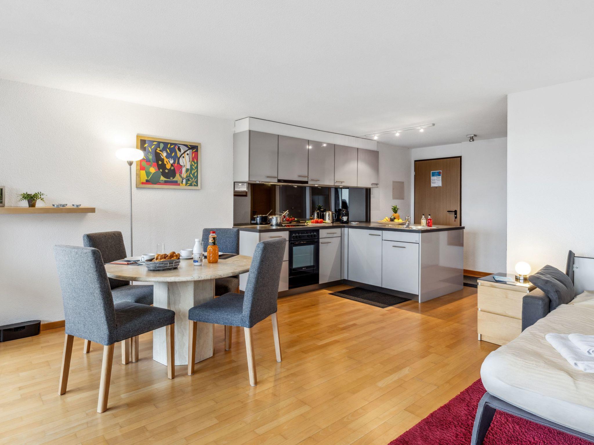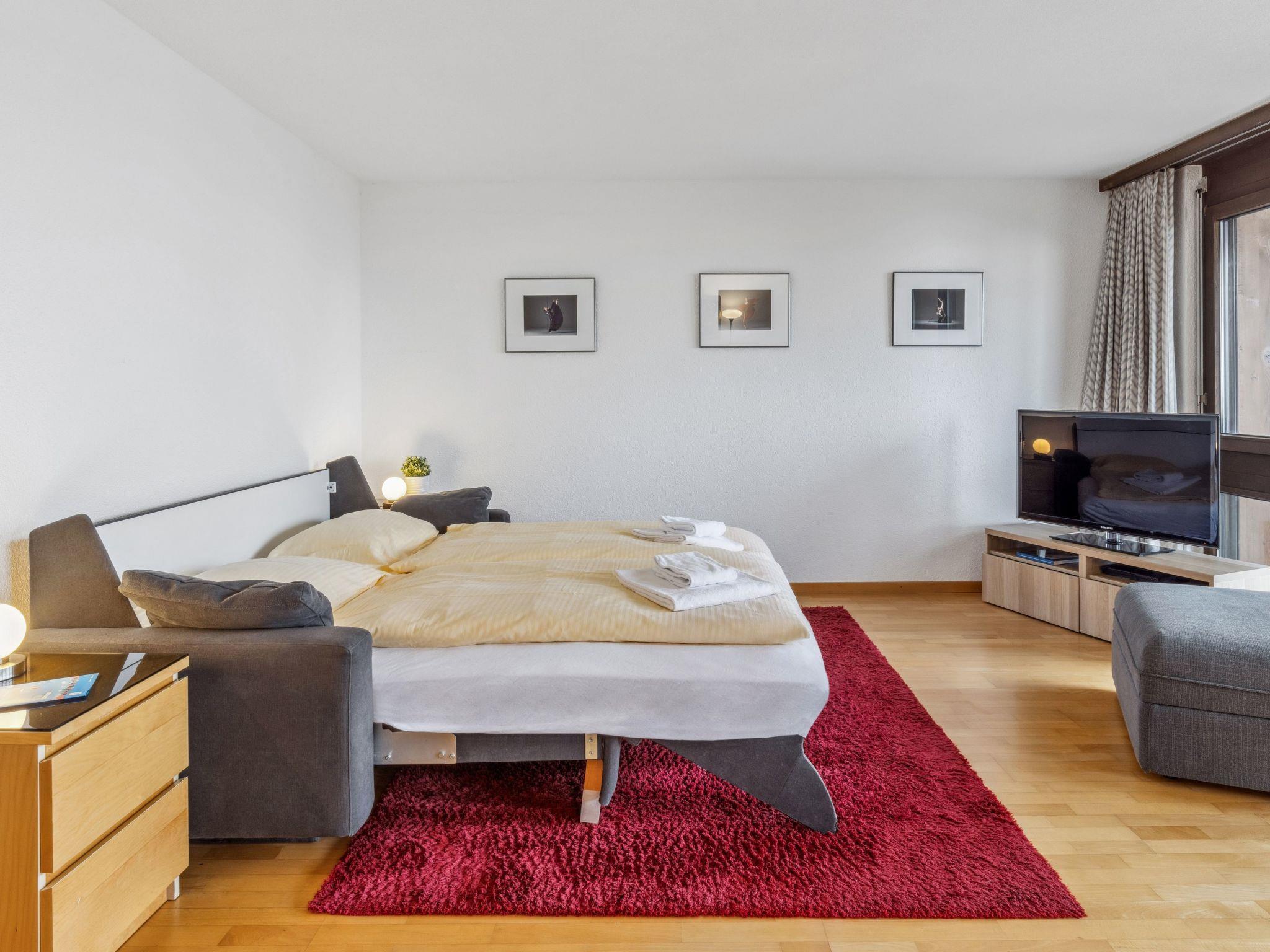 "Krokus Apt.T", 1-Zimmer-Studio 42 m2, unteres Geschoss. Hell, modern und geschmackvoll eingerichtet: Wohn-/Esszimmer mit 1 Doppeldiwanbett (160 cm, Länge 180 cm), Esstisch, TV und DVD. Küche (Backofen, 4 Glaskeramikplatten, Toaster, Wasserkocher, elektrische Kaffeemaschine, Kapseln für die Kaffeemaschine (Nespresso) extra, Racletteofen, Fondue Set (Käse)). Dusche/WC. Terrasse. Terrassenmöbel. Schöne Sicht auf die Berge. Zur Verfügung: Haartrockner. Internet (WLAN, gratis). Bitte beachten: Nichtraucher-Unterkunft.