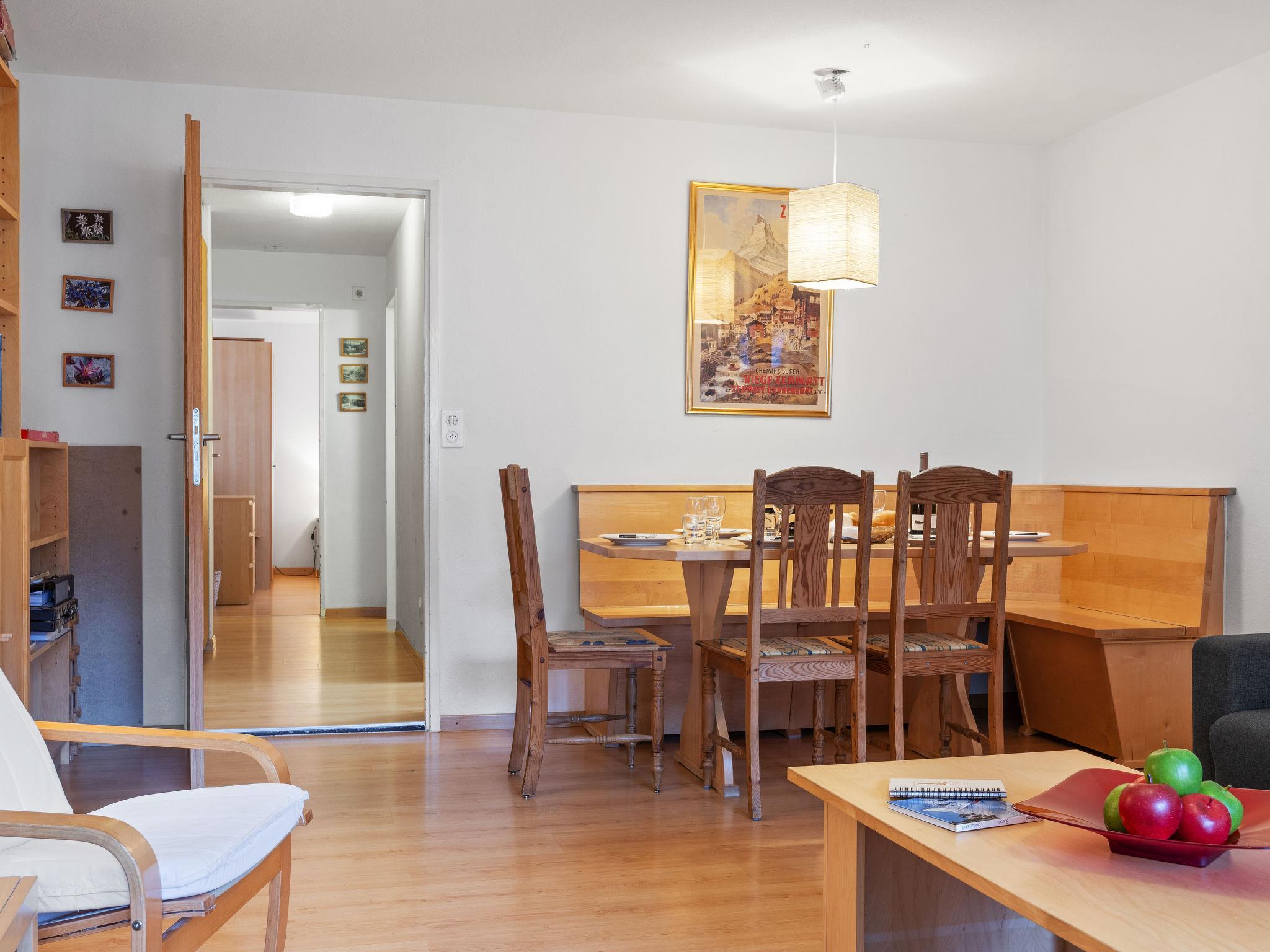 2-Zimmer-Wohnung 68 m2 im 1. Stock, Südlage. Schön und gemütlich eingerichtet: Wohn-/Schlafzimmer mit 1 Doppeldiwanbett (140 cm, Länge 200 cm), Esstisch, Kabel-TV und Radio. Ausgang zum Balkon. 1 Zimmer mit 1 x 2 Etagenbetten (90 cm, Länge 200 cm), 1 Doppelbett (2 x 90 cm, Länge 200 cm). Kleine Küche (Backofen, 4 Glaskeramikplatten, Toaster, Wasserkocher, Tiefkühler, elektrische Kaffeemaschine, Fondue Set (Käse)). Dusche/WC. Balkon. Balkonmöbel. Sehr schöne Sicht auf Matterhorn. Zur Verfügung: Haartrockner. Internet (Wireless LAN, gratis). Bitte beachten: Nichtraucher-Unterkunft.