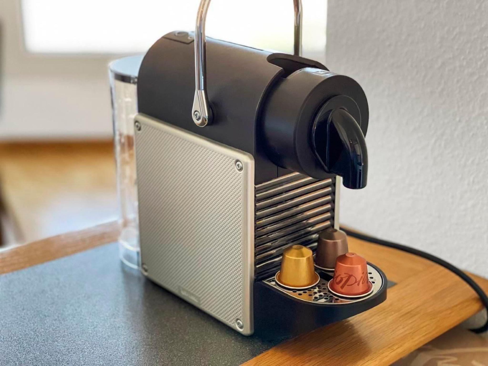 Die Küche ist voll ausgestattet mit Geschirr für 4 Personen, einem Elektroherd, Backofen, Mikrowelle, Wasserkocher, Geschirrspüler, Kühlschrank mit Gefrierfach und einer De'Longhi Nespresso-Maschine.