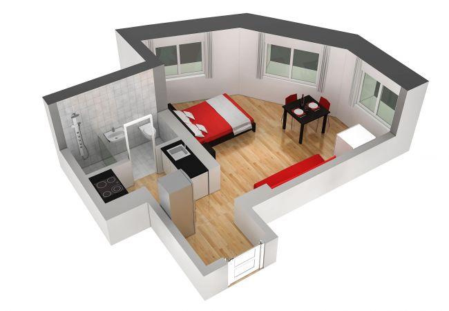 Das geräumige Wohn-/Schlafzimmer ist ausgestattet mit einem Doppelbett und einer gemütlichen Sitzecke zum Essen. In der Küche können Sie Ihre eigenen Gerichte zubereiten. Sie ist ausgestattet mit Herdplatten, Kühlschrank, Kaffeemaschine und vielen weiteren Extras. Natürlich gibt es auch ein privates Badezimmer.