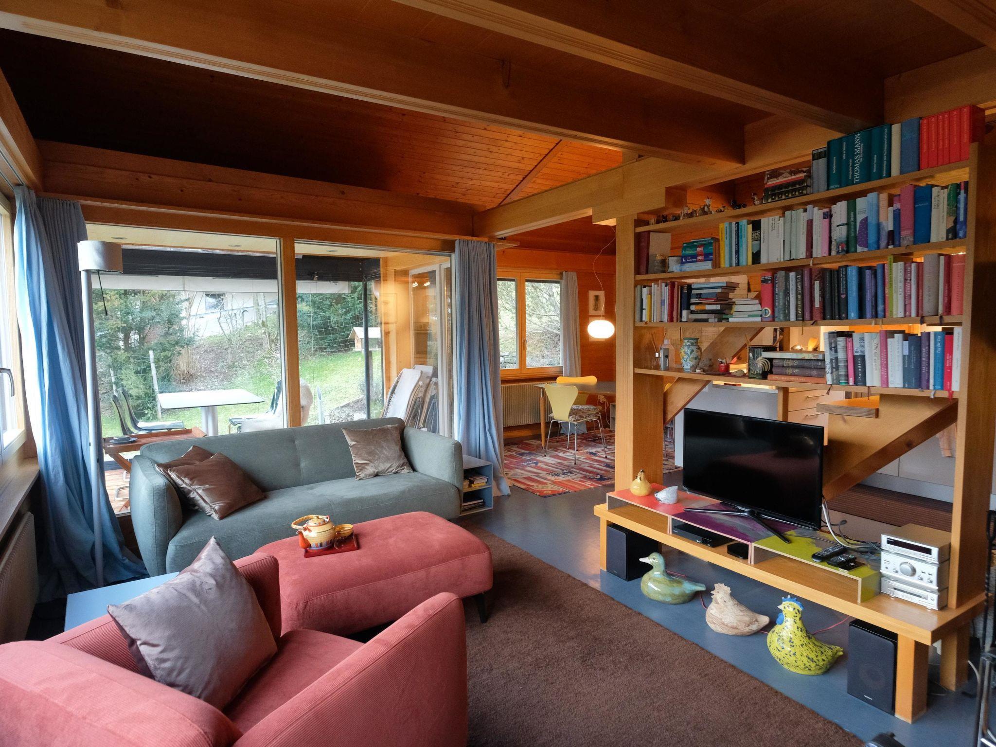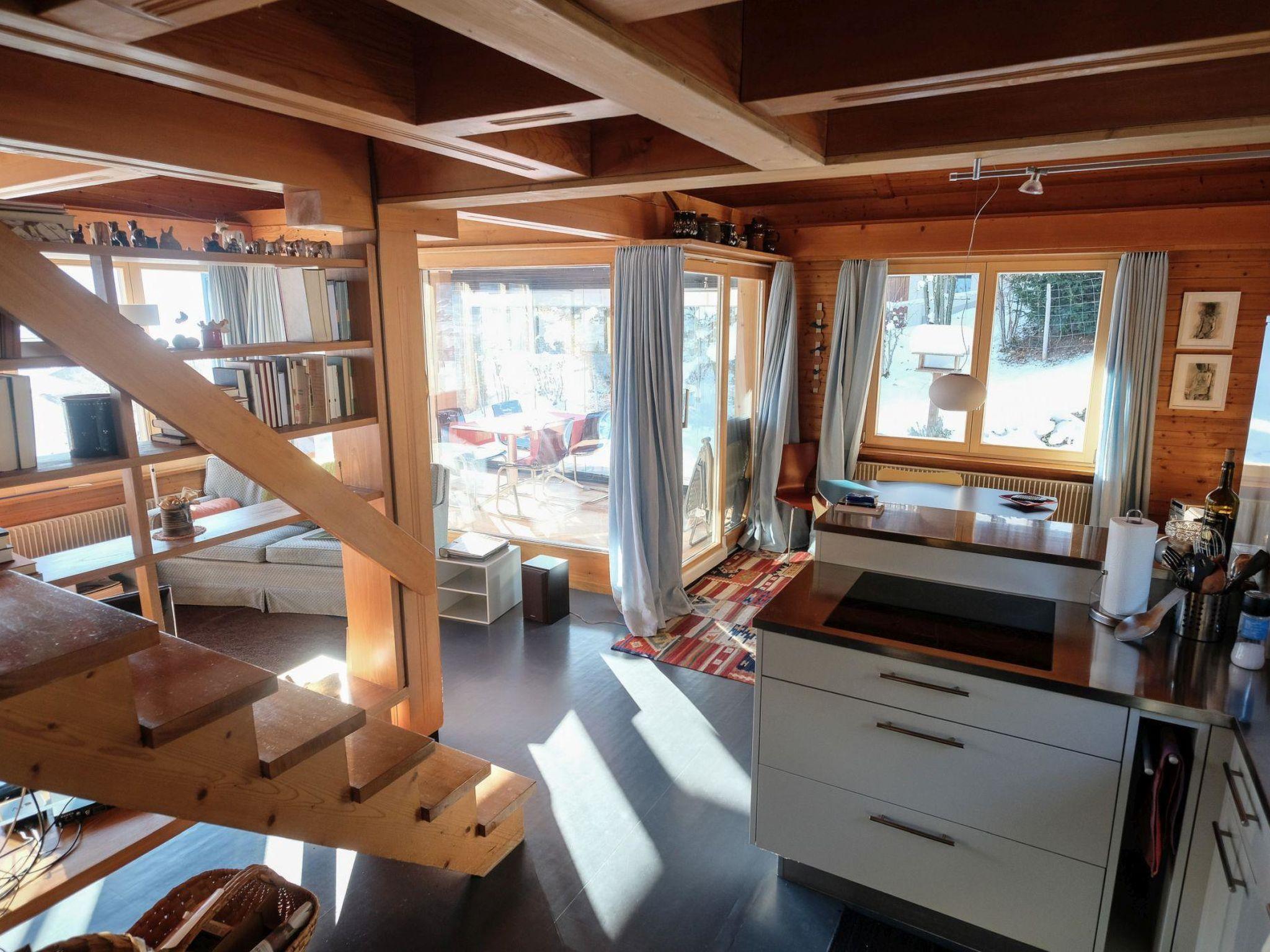 Hochparterre (Eingang): Grosses und helles Wohn-/Esszimmer mit Sofa, 2 Sesseln, TV, Teleboy mit über 250 Sendern, Apple TV und Netflix (eigenes Abo nötig), Essecke mit Esstisch. Offene Küche mit Geschirrspüler, Kapsel-Kaffeemaschine (Nespresso), Fondue- und Raclette-Set sowie diversen weiteren Küchengeräten. 1 Schlafzimmer mit Grand Lit (160x200cm). 1 Badezimmer mit Badewanne/WC. 1. Stock (Galerie): 1 separates Schlafzimmer mit 1 Grand Lit (140x200cm). 1 Grand Lit (140x200cm / automatisch verstellbares ergonomisches Bettsystem) auf der Galerie (kein abgeschlossener Raum). WiFi (1000MB/s).