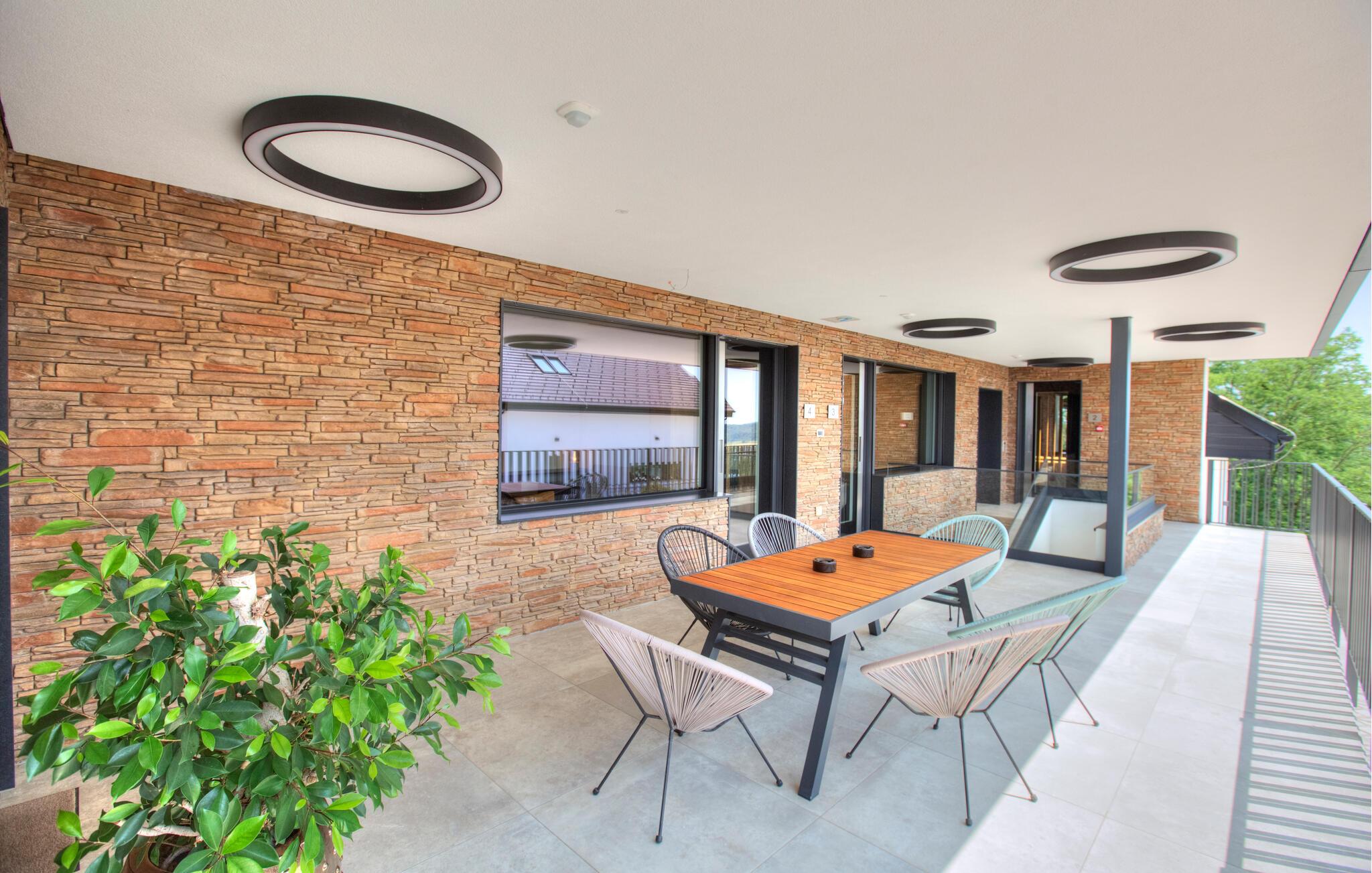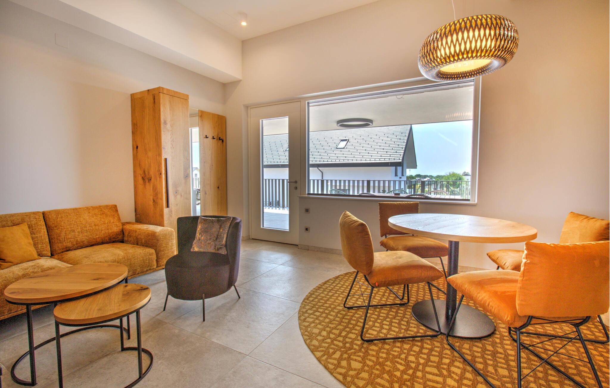Verbringen Sie entspannte Tage zu zweit in dieser eleganten Ferienwohnung im ersten Stock, die sich auf einem großzügigen Anwesen mitten in einer grünen Hügellandschaft befindet. Freuen Sie sich auf Erholung, Komfort und eine moderne Ausstattung inmitten ruhiger Natur. Richten Sie sich im hellen Wohn- und Essbereich und entspannen Sie sich auf dem gemütlichen Sofa. Neben einer wundervollen Aussicht bietet Ihnen Ihre Wohnung auch einen gemeinschaftlich zugänglichen Wellnessbereich mit Sauna, Indoorpool und Fitnessraum für eine erholsame Auszeit.