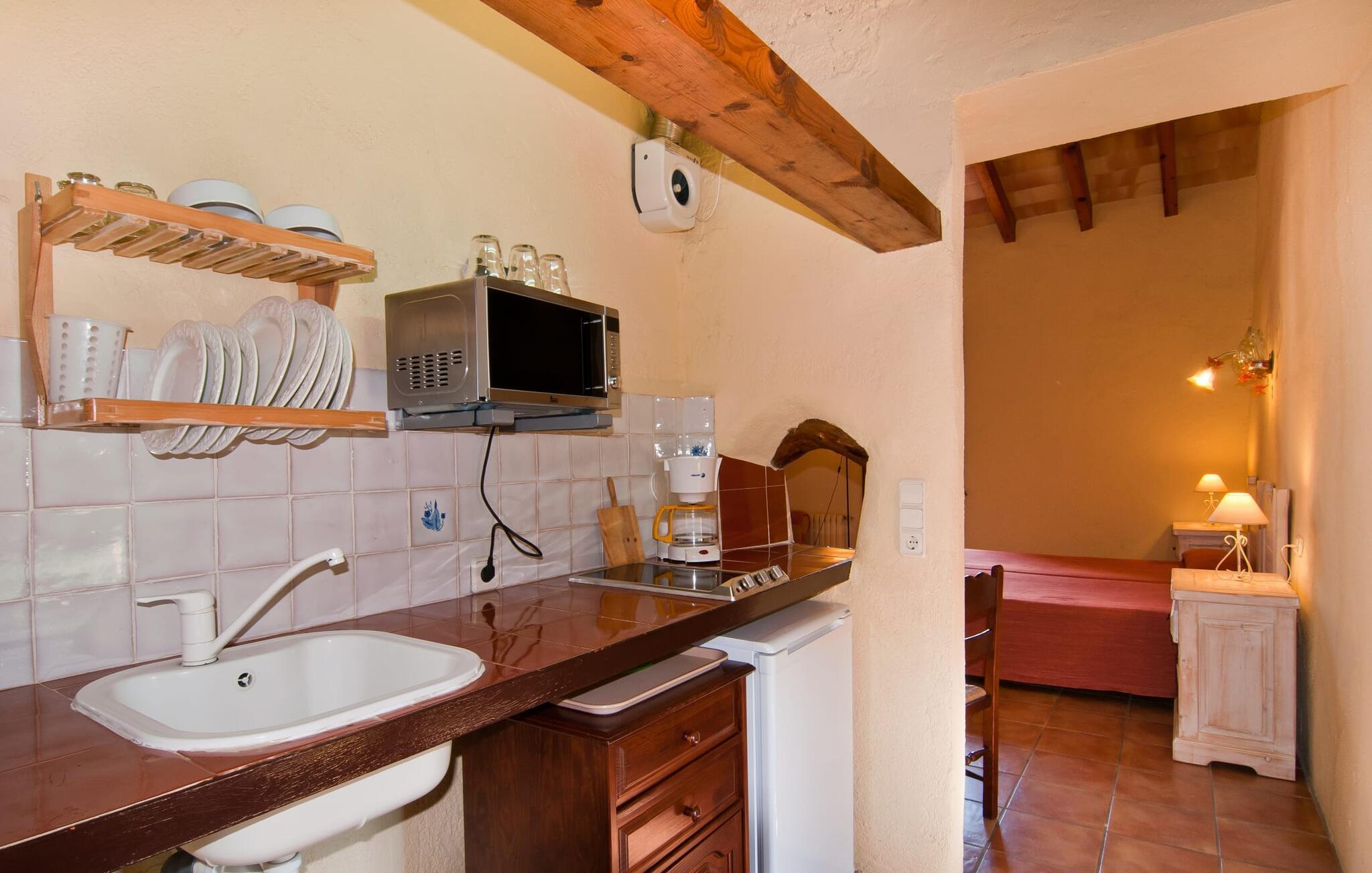 Vielleicht ist es „Sa Tabaquera“, das früher ein Trockenraum für Tabakblätter war. In Son Sureda gibt es nur noch eine einzige Tabakpflanze – vielleicht können Sie danach suchen? Ihr „Son Sureda“-Reich würde aus einem Schlafbereich mit zwei 0,9 x 2 m großen Betten, direktem Zugang zum Balkon und einem Sofa sowie einer praktischen Küchenzeile bestehen. An den Tagen, an denen Sie den ganzen Tag auf dem Anwesen bleiben möchten, können Sie in der Miniküche mit Kühlschrank, zwei Cerankochfeldern, einer Mikrowelle und einer Kaffeemaschine Snacks, Salate und kleine Mahlzeiten zubereiten. Vom Balkon (mit Tisch, Stühlen und Sonnenschirm) haben Sie eine tolle Aussicht. Gönnen Sie sich zwischendurch eine Verschnaufpause mit einem guten Buch. Und es gibt eine Reihe lohnenswerter Ziele: Stadtleben oder Meeresbrise? Von Ihrer Villa-Unterkunft aus können Sie bequem die verschiedenen Seiten der Insel erkunden. Gut 15 km entfernt warten die Strände auf Sonnenanbeter, Surfer und Familien. Das weitläufige Son Serra de Marina und der fast zwei Kilometer lange Sandstrand in Richtung Colònia de Sant Pere bieten genügend Platz, um mehr als nur ein Handtuch auszubreiten. Wenn Sie die Blautöne von oben genießen möchten, fahren Sie nach Betlem und erklimmen die 5 km zur kleinen Ermita. Selbstverständlich sind auch anspruchsvollere Routen für Wanderschuhe und Mountainbikes möglich. Die Ma-3322, die je nach Windrichtung teilweise hörbar ist, führt Sie in die Stadt Manacor für einen spontanen Ausflug in die historische Innenstadt oder zum Einkaufen auf dem Vitaminmarkt. Wenn Sie die Kathedrale in Palma besichtigen möchten, lassen Sie Ihr Auto einfach am Bahnhof stehen und nehmen Sie den Bus oder die Bahn. Ferienhaus im Grünen mit viel Natur für die Villengäste. Fühlen Sie sich wie zu Hause auf dem zwischen Schafweiden und Weinreben gelegenen Agroturismo-Anwesen „Son Sureda“, das über elf Selbstversorger-Apartments und Studios, einen großen U-förmigen Innenhof und mehrere Pools verfügt. Manacor, eine der Metropolen der Insel, ist nur 9 km entfernt. Es eignet sich ideal zum Einkaufen auf dem täglichen Obst- und Gemüsemarkt, für Ausflüge und ein entspanntes Abendessen in einem Restaurant. Und an der Badia d’Alcúdia, in Richtung Son Serra de Marina und Colònia de Sant Pere, findet man noch einige Strände, die noch nicht überfüllt sind.