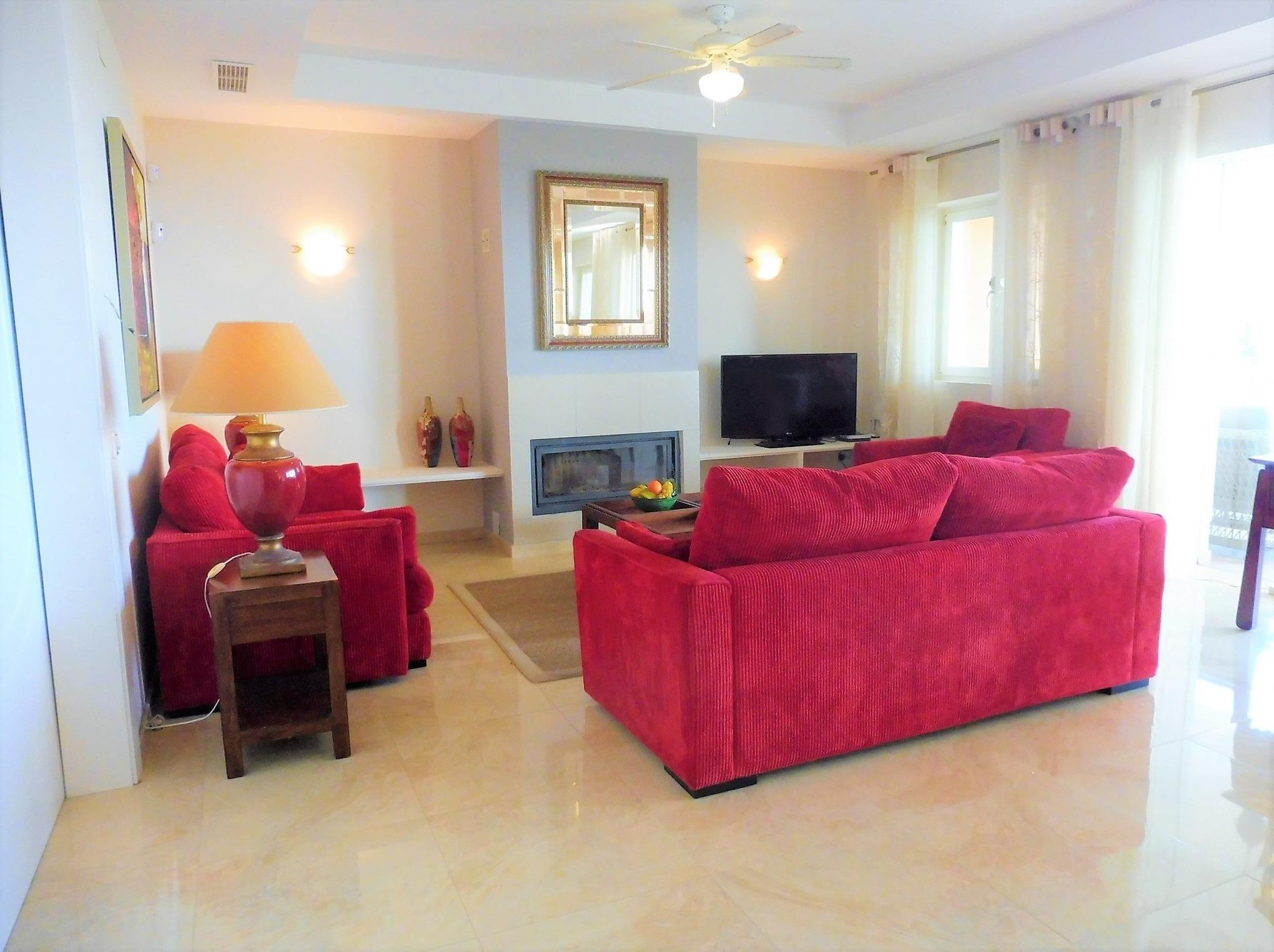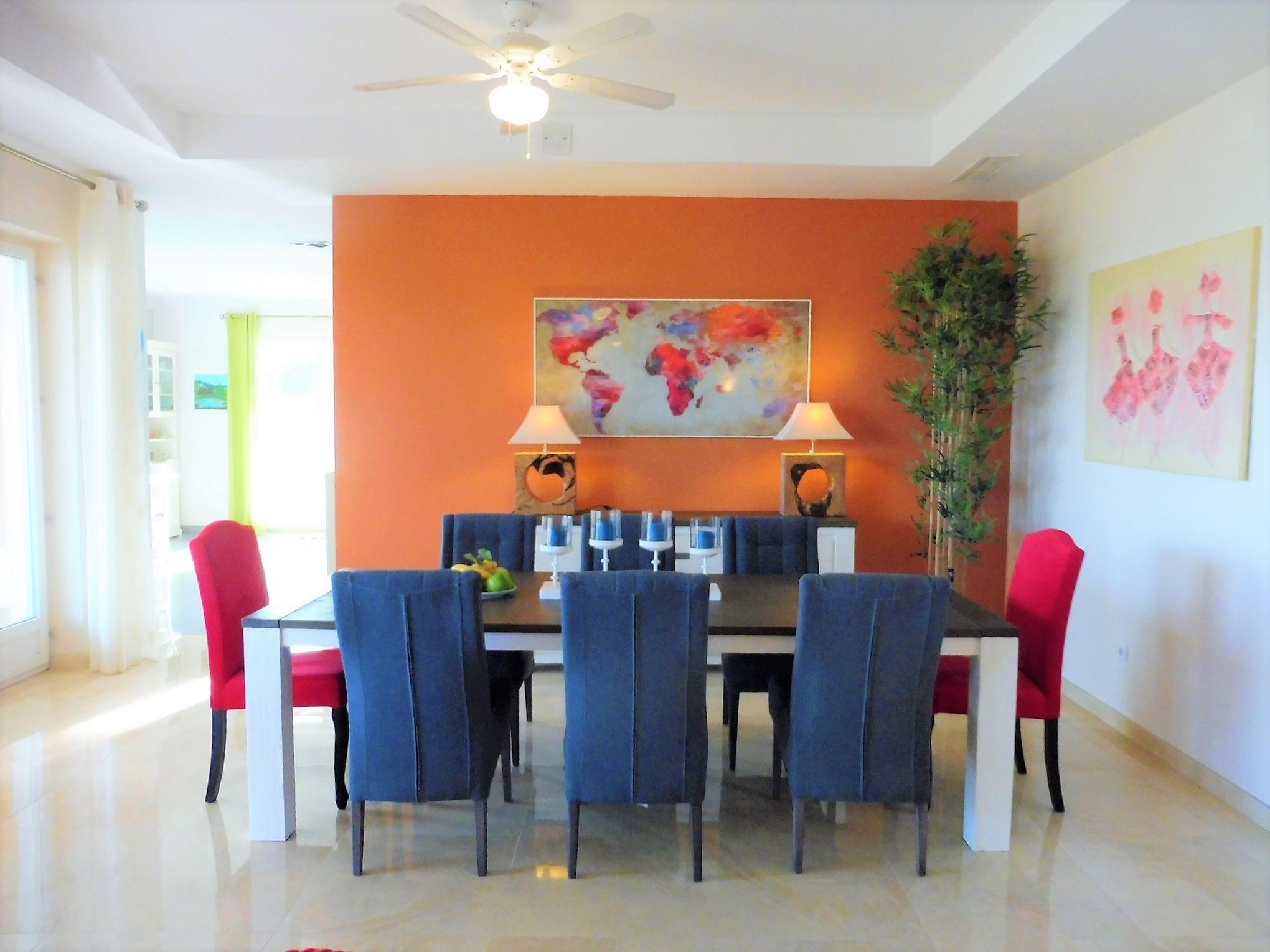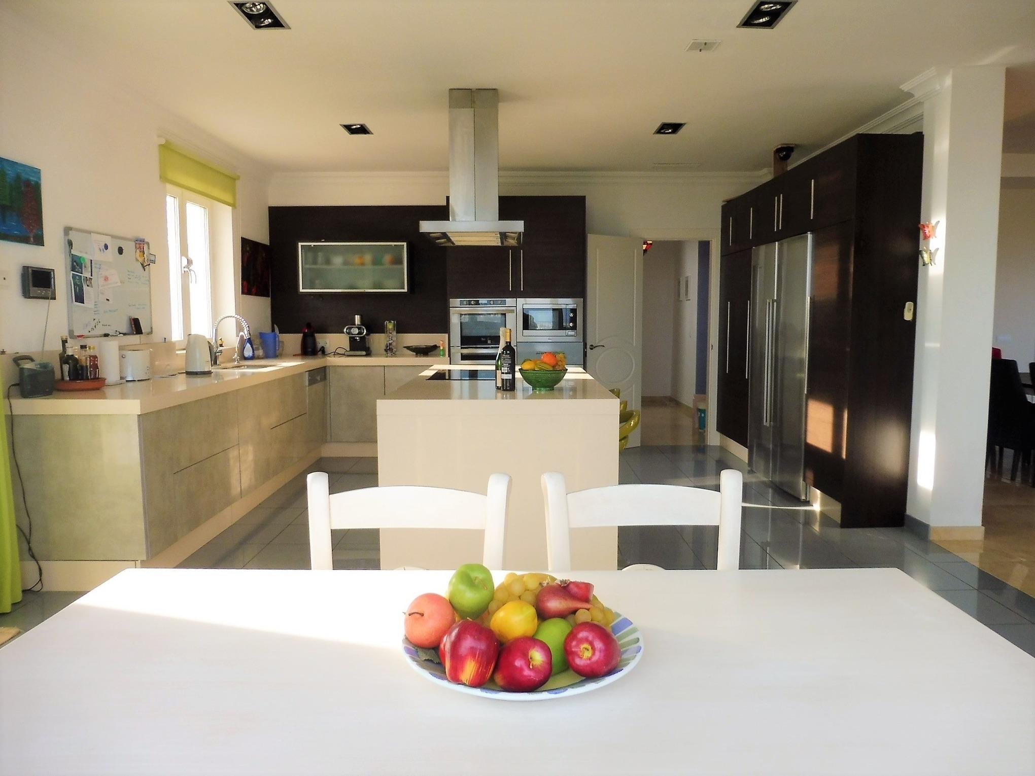 Die Villa wurde sehr grosszügig und luftig gebaut, alle Zimmer sind sehr gross und hell. Im Erdgeschoss befindet sich der Eingangsbereich, ein riesiges Wohn-Esszimmer mit Kamin und Ausblick über die gesamte nahe Küste, die komplett ausgestattete Küche mit zweitem Essbereich, ein Büro mit Gäste-WC und am anderen Ende des Ganges sind die zwei unteren Schlafzimmer: jedes mit eigenem en-Suite-Vollbad und eingebauten Wandschränken. Küche und Wohnzimmer haben direkten Zugang zur Hauptterrasse und somit zum Garten und Pool. Auf der Terrasse finden Sie bequeme Lounge-Garnitur und 2 Esstische.