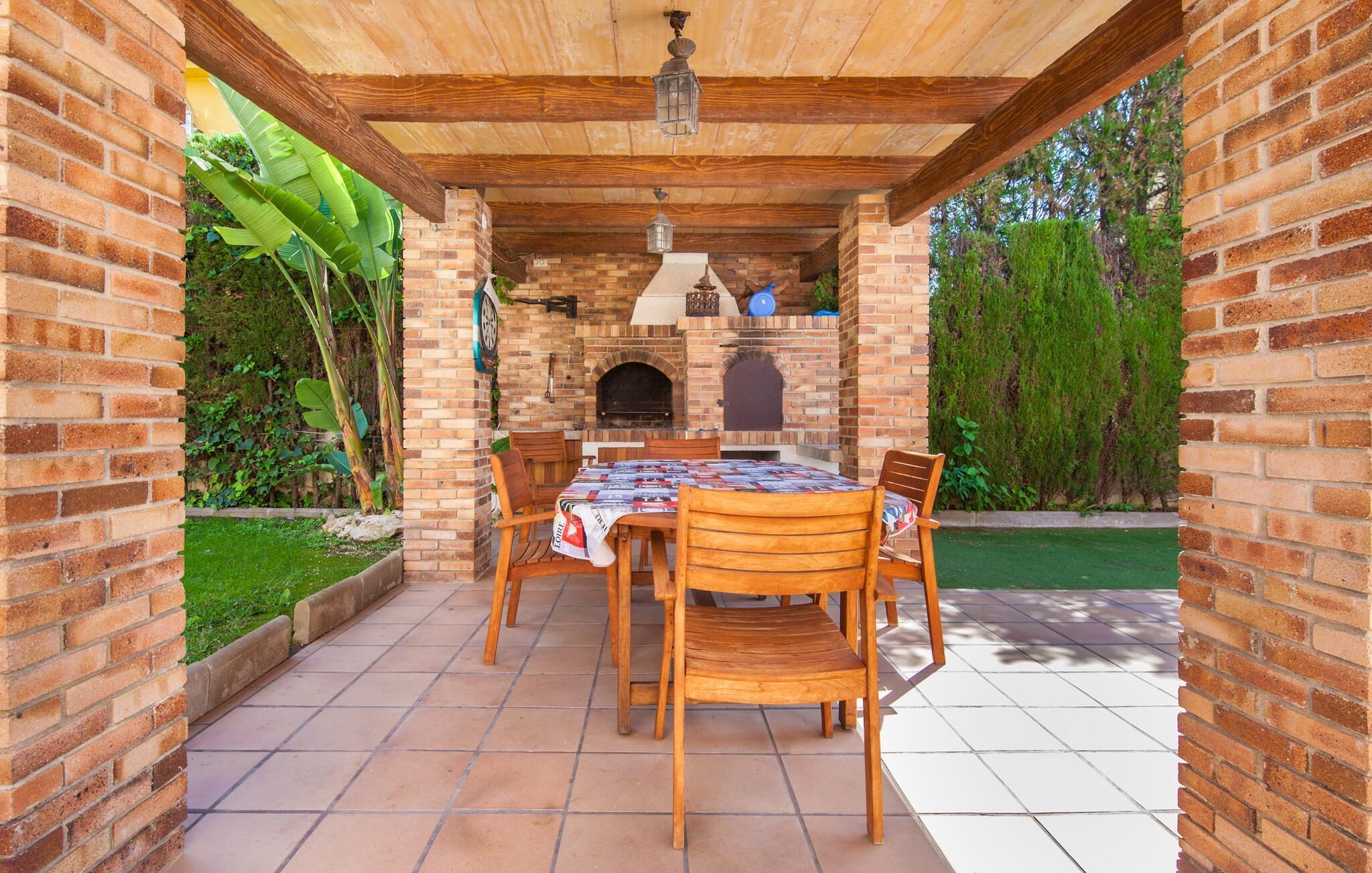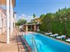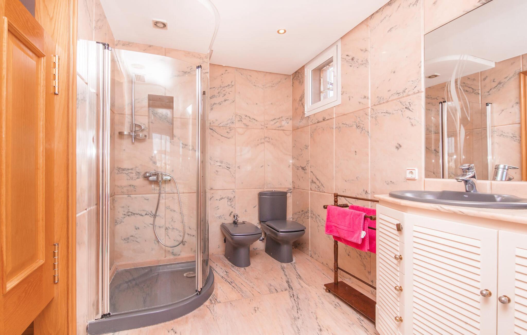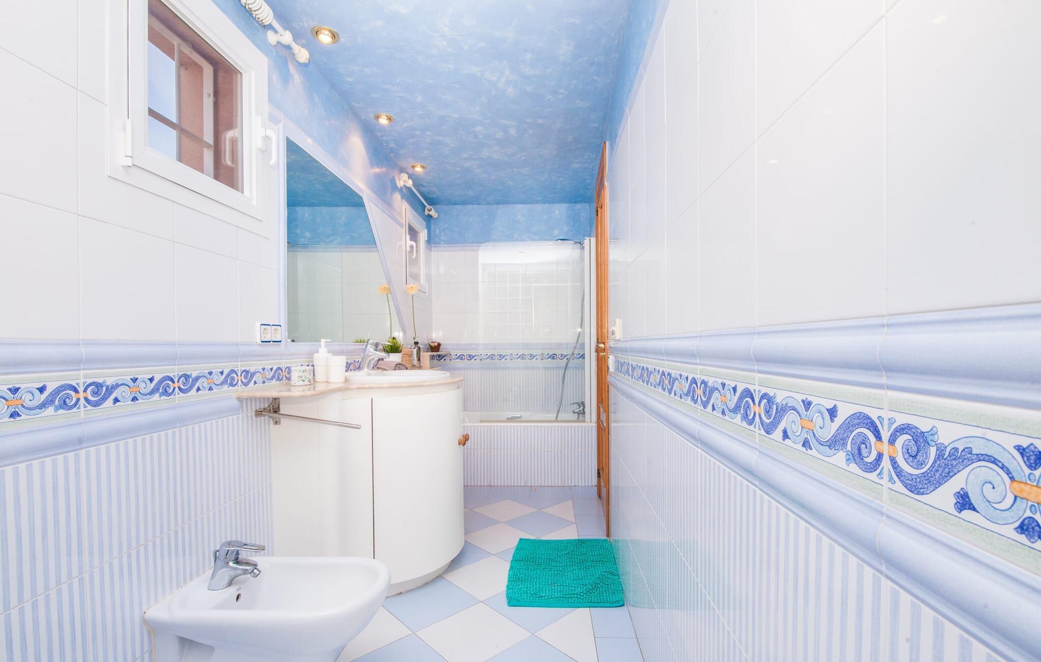 „Alfabia“ bietet den perfekten Rückzugsort nach einem langen Spaziergang durch Palmas geschäftige Straßen. Eine hohe Hecke, die Privatsphäre garantiert, ein großer Pool mit abgestuftem Bodenbelag, umgeben von gepflegtem Kunstrasen – hier dreht sich alles um Entspannung. Direkt neben dem Pool wartet eine gemütliche, überdachte Terrasse darauf, von Ihnen etwas Leben einzuhauchen. Während sich die Lust auf ein erfrischendes Bad noch in der Außendusche aufhält, können sich andere hungrige Besucher daran machen, den Grill anzuzünden. Frischer Fisch, dazu Wein – was braucht man mehr? Und wer noch Lust auf mehr Unterhaltung hat, probiert sich am Abend vielleicht mal bei einer Runde Darts. Oberhalb des Pools beherbergt die Villa eine weitere Dachterrasse mit herrlichem Blick auf die umliegenden Dächer und Berge in der Ferne. Eine kleine Theke, schicke Kunstrattanmöbel, viel Platz und eine tolle Aussicht – das ist eindeutig der perfekte Ort für ein Treffen im Freien. Eine asphaltierte Auffahrt führt direkt bis zur Villa, auf der Straße vor dem Haus sind ausreichend Parkplätze vorhanden.