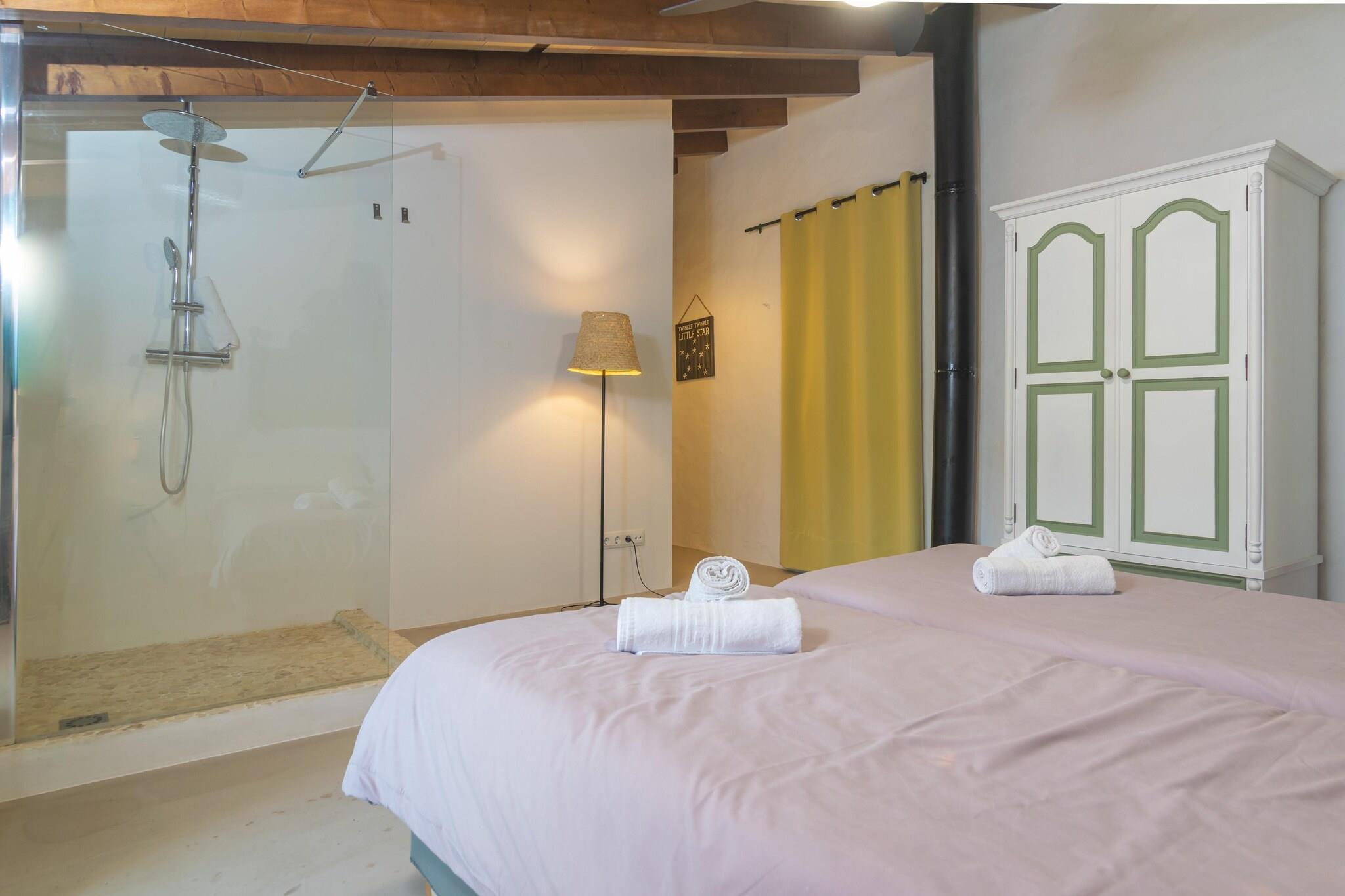 Der private Chlorpool, der 4,5 x 7,5 Meter misst und eine Tiefe zwischen 0,80 und 1,80 Metern hat, ist ideal um sich draußen abzukühlen . Der Aussenbereich bietet auch Sonnenliegen und Sonnenschirme, eine Sitzecke, einen Essbereich im Freien, einen mobilen Grill um leckeres Fleisch und Gemüse zu grillen, und einen Holzofen. Das Grundstück ist eingezäunt und bietet eine absolute Privatsphäre. Im Inneren, des zweistöckigen Hauses, finden Sie einen modernen Stil kombiniert mit traditionellen Elementen. Im Erdgeschoss ist das Wohnzimmer mit Sat-TV zu finden. Dieser führt zum Esszimmer, das mit der Küche verbunden ist und einen Gasherd bietet. In der Waschküche finden Sie die Waschmaschine, Bügeleisen und Bügelbrett. Es gibt 5 Schlafzimmer, alle mit zwei Einzelbetten und Klimaanlage. Drei davon befinden sich im Erdgeschoss und eines hat ein en-suite Badezimmer mit Dusche. Die beiden Schlafzimmer im ersten Stock verfügen auch über ein eigenes Badezimmer mit Dusche - eines davon mit Dusche im selben Raum. Es gibt ein weiteres Badezimmer mit Badewanne für die gesamte Unterkunft im Erdgeschoss und eine Toilette im Freien. Dazu gibt es noch 7 Deckenventilatoren sowie einem Kinderbett und Hochstuhl (auf Anfrage) , wenn Sie mit Ihrem Baby reisen. Das Haus liegt am Ortsrand von Algaida, in einer ruhigen und idyllischen Umgebung. Im Dorf finden Sie alle nötigen Dienstleistungen für einen unabhängigen Aufenthalt. Der nächste Strand ist Can Pastilla, etwa 20 km entfernt. Sie haben auch einen nahe gelegenen Golfplatz, Son Gual, etwa 13 km von der Unterkunft entfernt. Wir empfehlen, ein Auto zu mieten, um die Insel leichter erkunden zu können. Eventuelle Nebenkosten müssen beim Anbieter nachgefragt werden. Haustiere sind verboten. Partys oder ähnliche Veranstaltungen sind nicht gestattet. Es gibt Freiluftparkplätze für 6 Autos. Entfernungen Strand: 20.2 km - Can Pastilla Flughafen: 24.6 km - Son Sant Joan Golfplatz: 13.2 km - Golf Son Gual Ortsmitte: 1.3 km - Algaida Bahnhof: 24.5 km - Palma de Mallorca Bushaltestelle: 1.9 km - Algaida Fähre: 34.7 km - Palma de Mallorca Krankenhaus: 20.4 km - Hospital Son Llàtzer Touristen Lizenz: ETV/7688Einheitsregister: ESFCTU00000702500026474300000000000000000000ETV/76885Auf den Balearen gibt es eine Touristensteuer, die Ecotasa genannt wird. Diese Steuer muss vom Gast bezahlt werden. Der zu zahlende Betrag beträgt zwischen 0.55EURO pro Nacht und Gast in der Nebensaison und 2.2EURO pro Nacht und Gast in der Hochsaison. Ab dem 9. Tag reduziert sich die Steuer um die Hälfte. Personen unter 16 Jahren sind davon ausgenommen