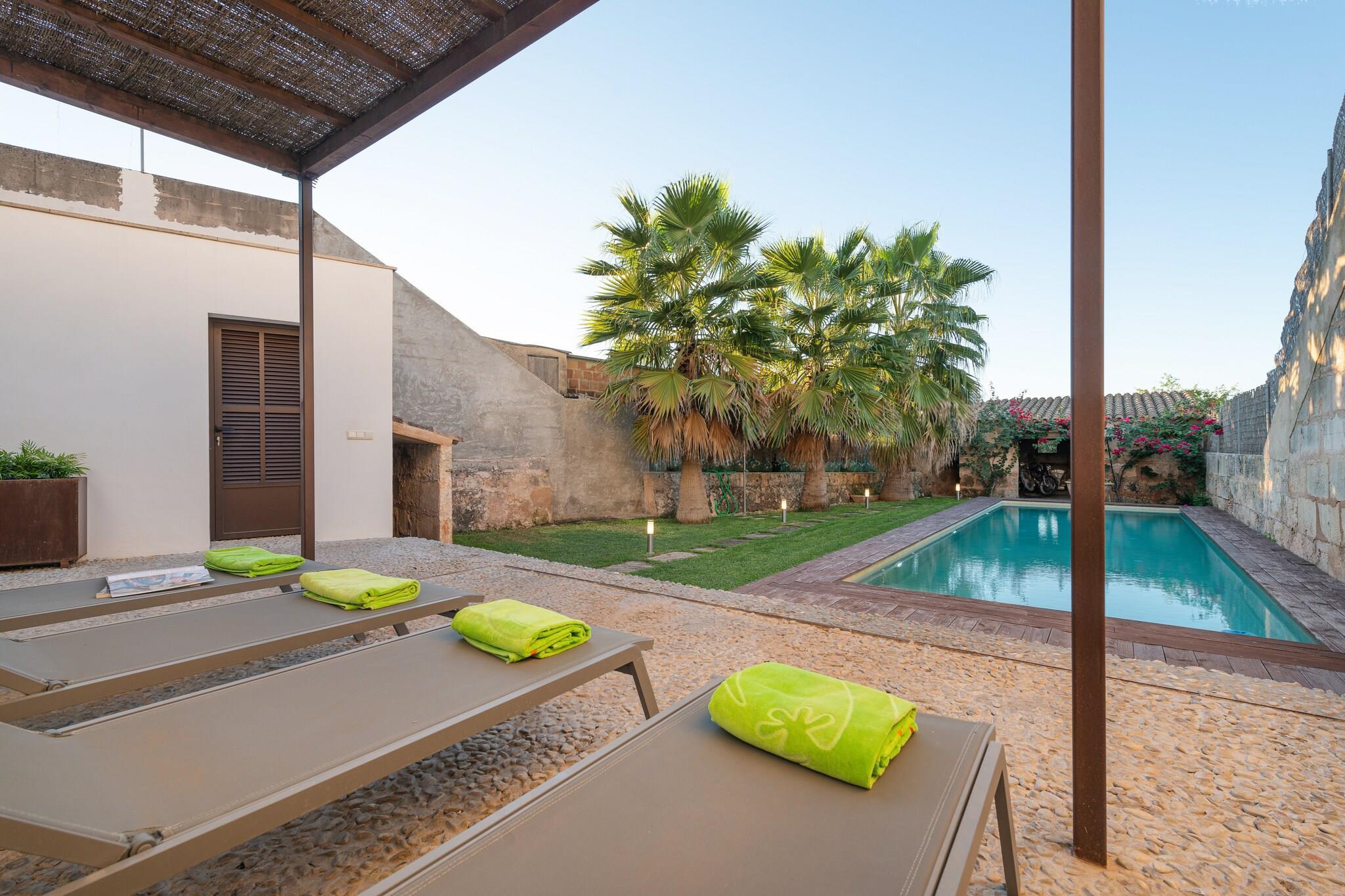 Im Innenhof mit anschließendem Garten beeindruckt ein enormer Frischwasserpool mit der Größe von 10 x 3m und einer konstanten Tiefe von 1.60m, er wird mit Chlor gereinigt. Perfekt, um den Tag sportlich zu beginnen, bevor Sie den Tisch auf der Verdana für ein ausgiebiges Frühstück decken. Auch einem Grillabend steht nichts im Wege, ein mobiler Grill ist vorhanden. Es gibt sechs Sonnenliegen, eine kleine Rasenfläche zum Spielen und ein WC für den Außenbereich (über die Terrasse zu erreichen). Da das Haus im Dorf liegt, hat es direkte Nachbarn. Über die Terrasse kommen Sie in den klimatisierten Wohn-Esszimmer mit Smart-TV, wo Sie entspannte Abende verbringen oder in der offenen Küche mit Induktionsherd und allen notwendigen Utensilien eines Ihrer Lieblingsgerichte kochen. In der Waschkammer befinden sich eine Waschmaschine, Bügeleisen und Bügelbrett. Außerdem gibt es im Erdgeschoss ein Schlafzimmer mit Doppelbett und en-Suite Bad mit Dusche und Gäste-WC. Im ersten Stock befindet sich ein weiteres Wohnzimmer mit gemütlichen Sofas, in dem Sie sich entspannen oder lesen können. Vier weitere Schlafzimmer sind auf dieser Etage untergebracht. Zwei der Zimmer haben je ein Doppelbett und zwei sind mit je einem Einzelbett eingerichtet. Ein komplettes Bad mit Dusche auf dieser Etage wird von allen Bewohnern benutzt. Wenn Sie mit Ihrem Baby unterwegs sind, können wir auf Anfrage ein Kinderbett und einen Hochstuhl zur Verfügung stellen. Algaida ist ein äußerst gastfreundliches Dorf im Landesinneren, das sich auf traditionelle Bräuche stützt. Hier finden Sie alle wichtigen Dienstleistungen wie Bars, Restaurants, Supermärkte usw. Darüber hinaus bietet es den Vorteil, dass es in der Nähe von Verkehrswegen liegt, die es Ihnen ermöglichen, jeden Punkt der Insel zu erreichen. Der nächstgelegene Strand ist der Arenal-Strand, aber aufgrund seiner zentralen Lage auf der Insel können Sie viele Strände in alle Richtungen erreichen. Die Hauptstadt der Insel, Palma, ist nur 25 Autominuten entfernt. Der Kamin kann nicht benutzt werden. Eventuelle Nebenkosten müssen beim Anbieter nachgefragt werden. Haustiere sind verboten. Partys oder ähnliche Veranstaltungen sind nicht gestattet. Es gibt Parkplätze für 2 Autos in der Garage. Entfernungen Strand: 19.5 km - Can Pastilla Flughafen: 23 km - Palma de Mallorca Golfplatz: 12.8 km - Golf Son Gual Ortsmitte: 0.17 km - Algaida Bahnhof: 24 km - Palma Bushaltestelle: 0.55 km - Algaida Fähre: 28.3 km - Palma Krankenhaus: 21 km - Hospital Sant Joan de Deu Touristen Lizenz: ETV/7762Einheitsregister: ESFCTU00000702500013997300000000000000000000ETV/77628Auf den Balearen gibt es eine Touristensteuer, die Ecotasa genannt wird. Diese Steuer muss vom Gast bezahlt werden. Der zu zahlende Betrag beträgt zwischen 0.55EURO pro Nacht und Gast in der Nebensaison und 2.2EURO pro Nacht und Gast in der Hochsaison. Ab dem 9. Tag reduziert sich die Steuer um die Hälfte. Personen unter 16 Jahren sind davon ausgenommen