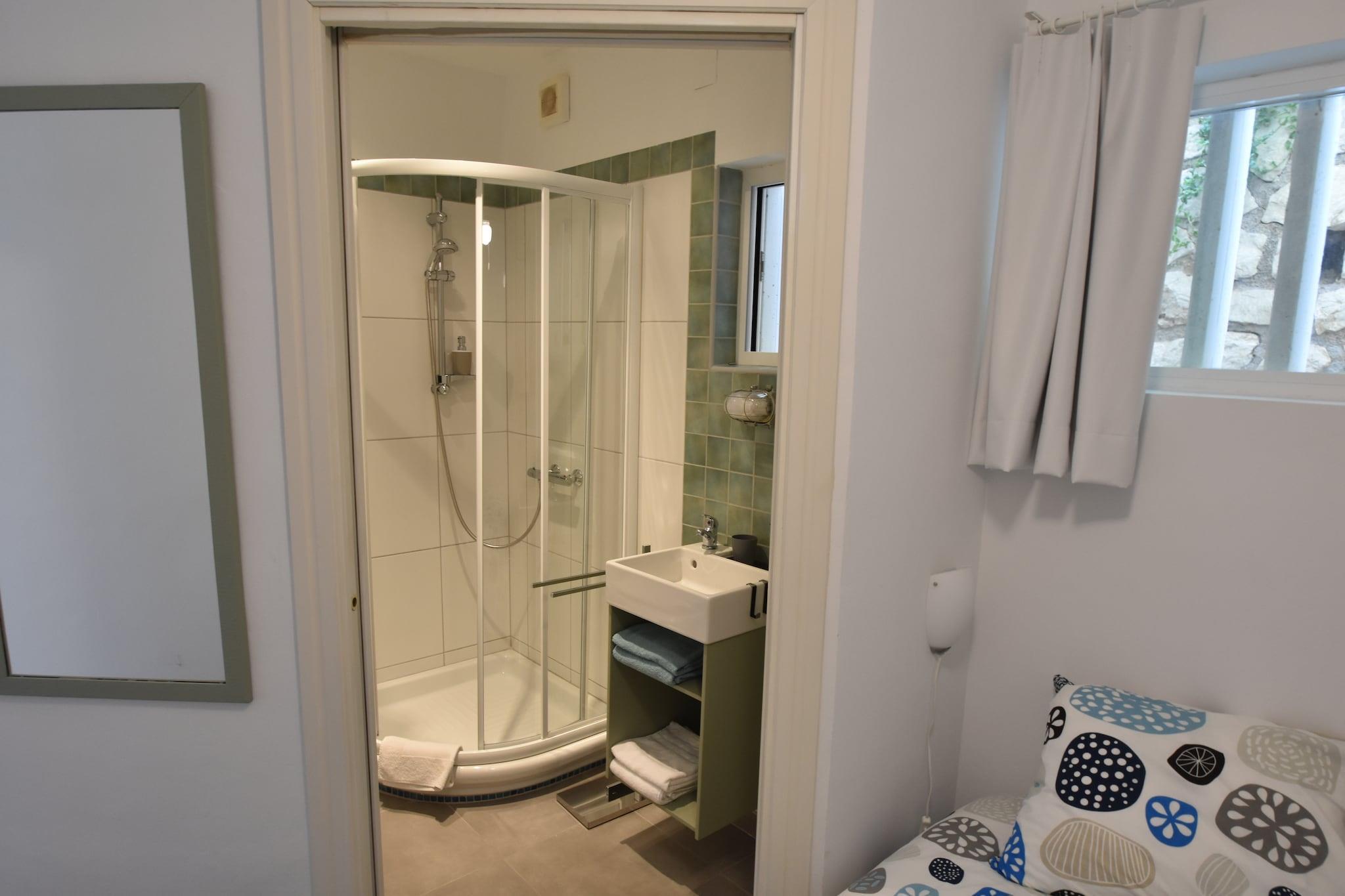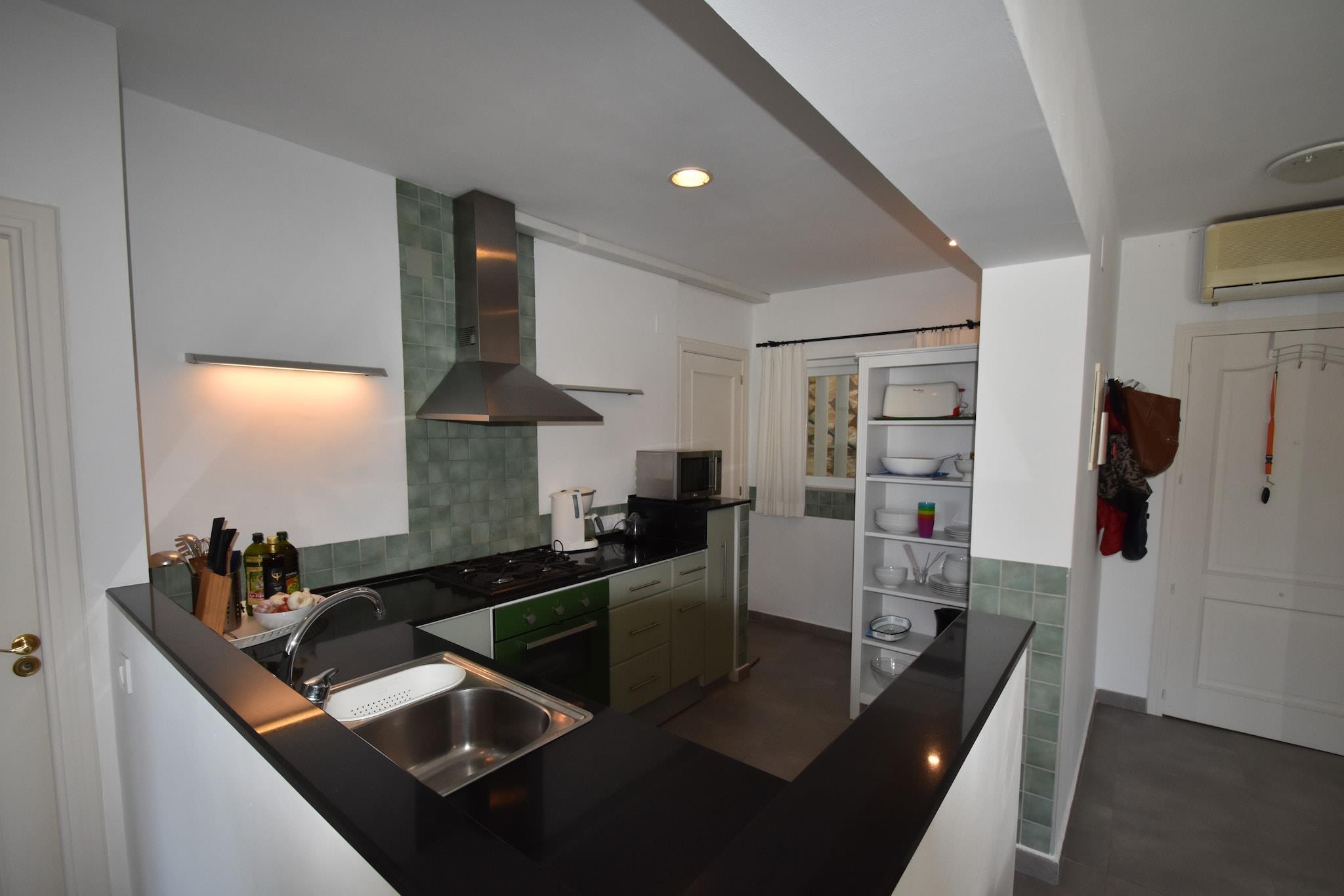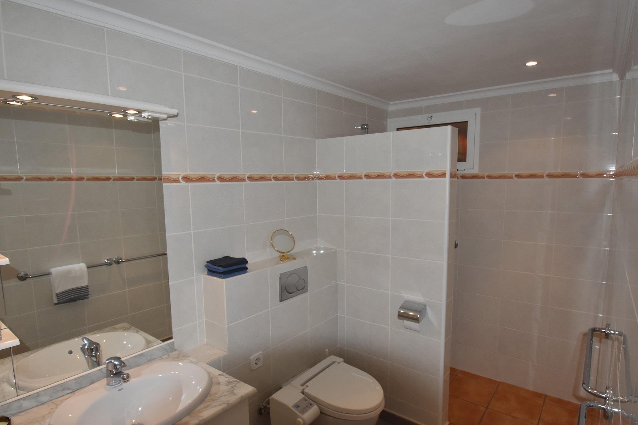 Parterre: (Eingangshalle, Heizung(Fußbodenheizung, durch Klimaanlagen), Klimaanlage, Terrasse(40 m2)) Eingang, offene Küche(Wasserkocher, Toaster, Kochherd(elektrisch), Dunstabzugshaube, Kaffeemaschine, Backofen, Mikrowelle, Spülmaschine, Kühlschrank, Kühl-/Gefrierkombination), Wohn/Esszimmer(TV(internationale TV-Kanäle), Esstisch(4 Personen), Sitzecke(4 Personen)), Schlafzimmer(Doppelbett), Schlafzimmer mit Badezimmer(Doppelbett, Dusche, Waschbecken, Toilette), Badezimmer(Dusche, 2x Waschbecken, Toilette), Waschmaschine, Gartentüren, Gartenmöbel, Parkplatz, Sonnenschirm, Pool(Gemeinschaftliche Nutzung mit anderen Gästen, 10 x 4 m.)