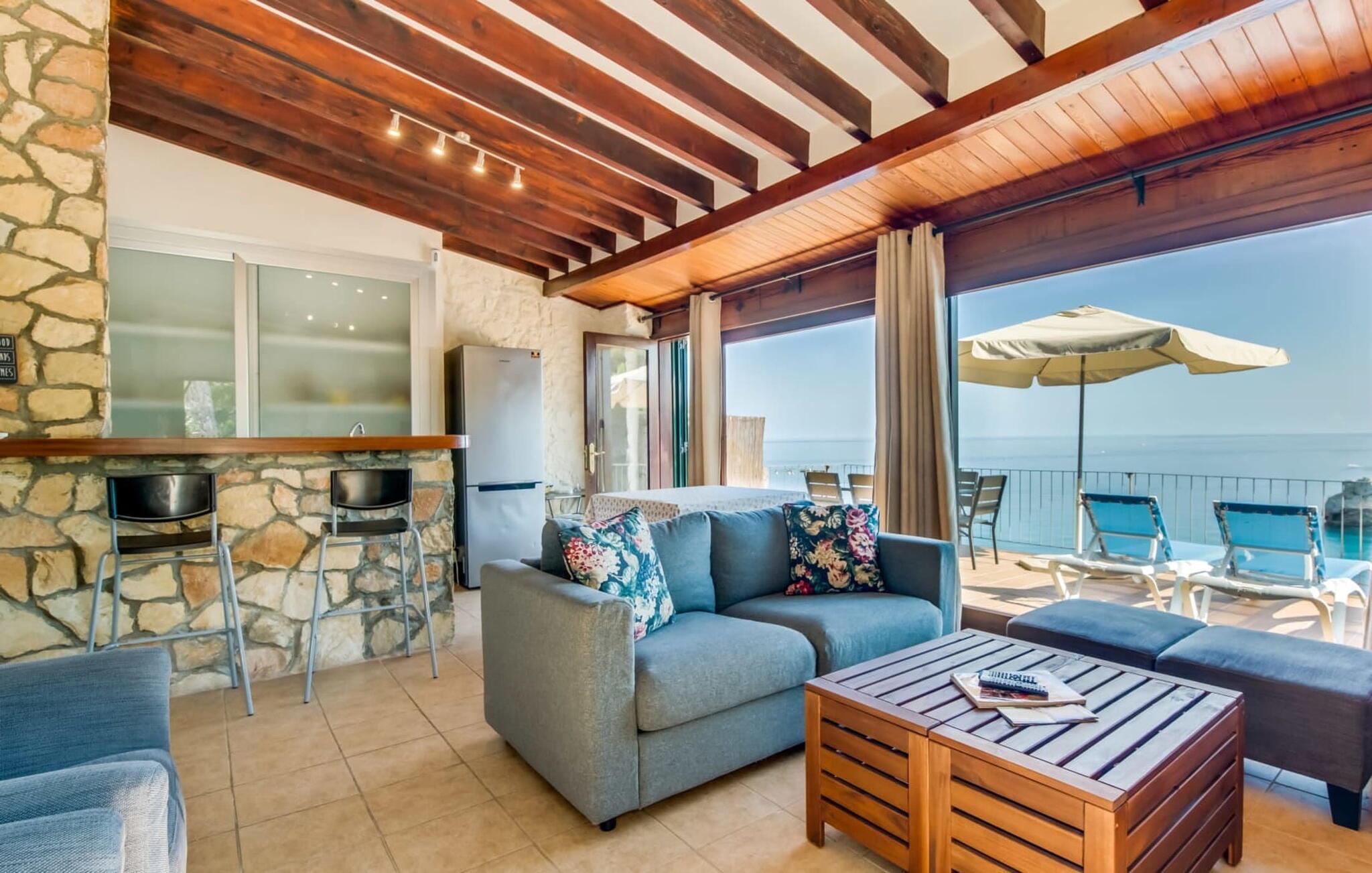Betreten Sie das Wohnzimmer von der oberen Terrasse aus und entspannen Sie sich auf luxuriösen Korbsesseln, während Sie den uneingeschränkten Blick auf das Meer genießen. Der Essbereich, der so positioniert ist, dass er den Panoramablick maximiert, ergänzt eine voll ausgestattete Küche im amerikanischen Stil, perfekt für Selbstversorger. Die Villa verfügt über drei geschmackvoll eingerichtete Schlafzimmer, darunter ein Doppel- und zwei Einzelzimmer auf der obersten Etage, sowie ein zusätzliches Doppelzimmer auf der unteren Ebene. Beide Badezimmer verfügen über moderne Armaturen und Tageslicht. Mit ihrem harmonischen Design und der Nähe zum Strand ist diese Villa ideal für einen Familienurlaub.