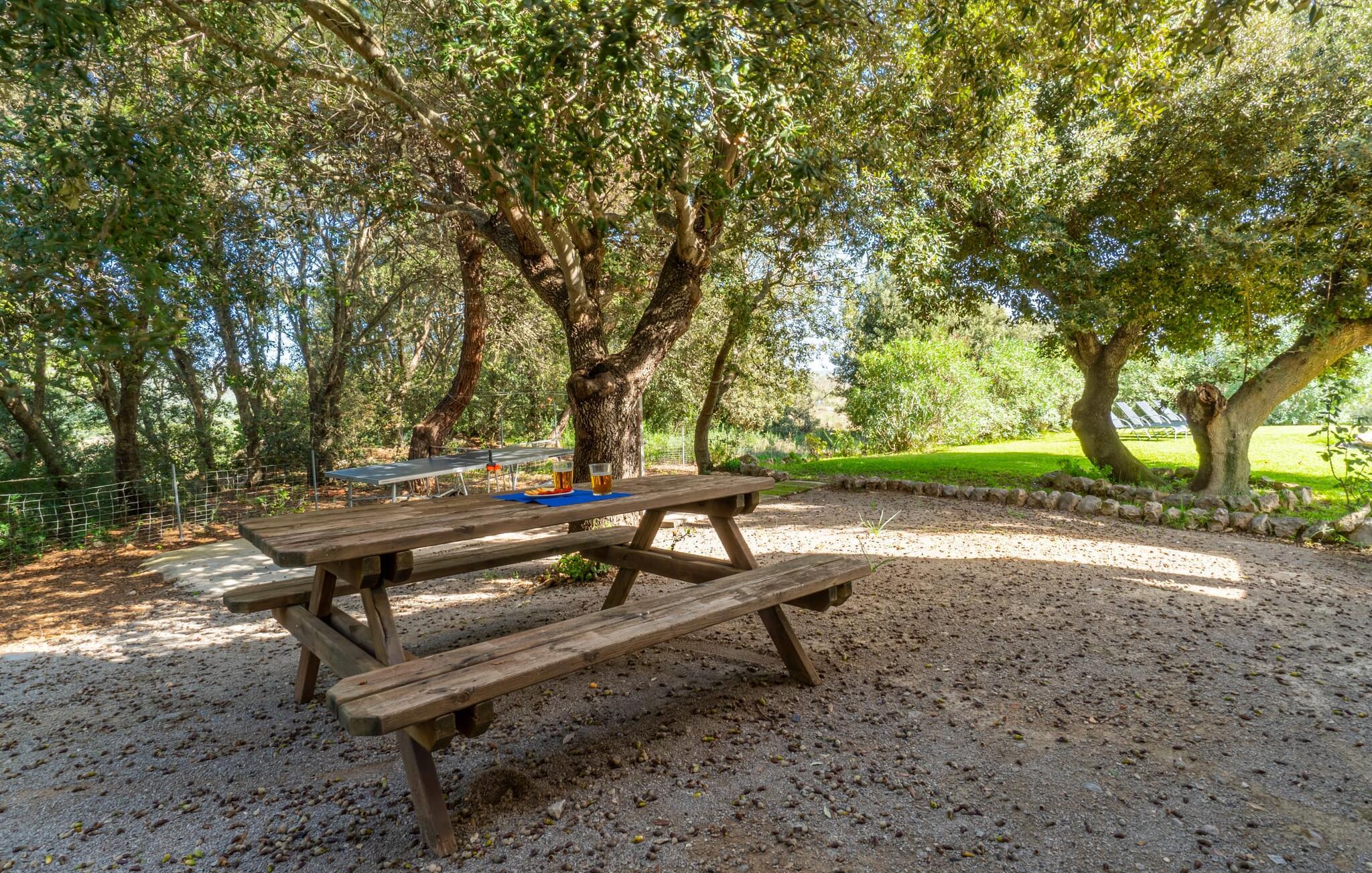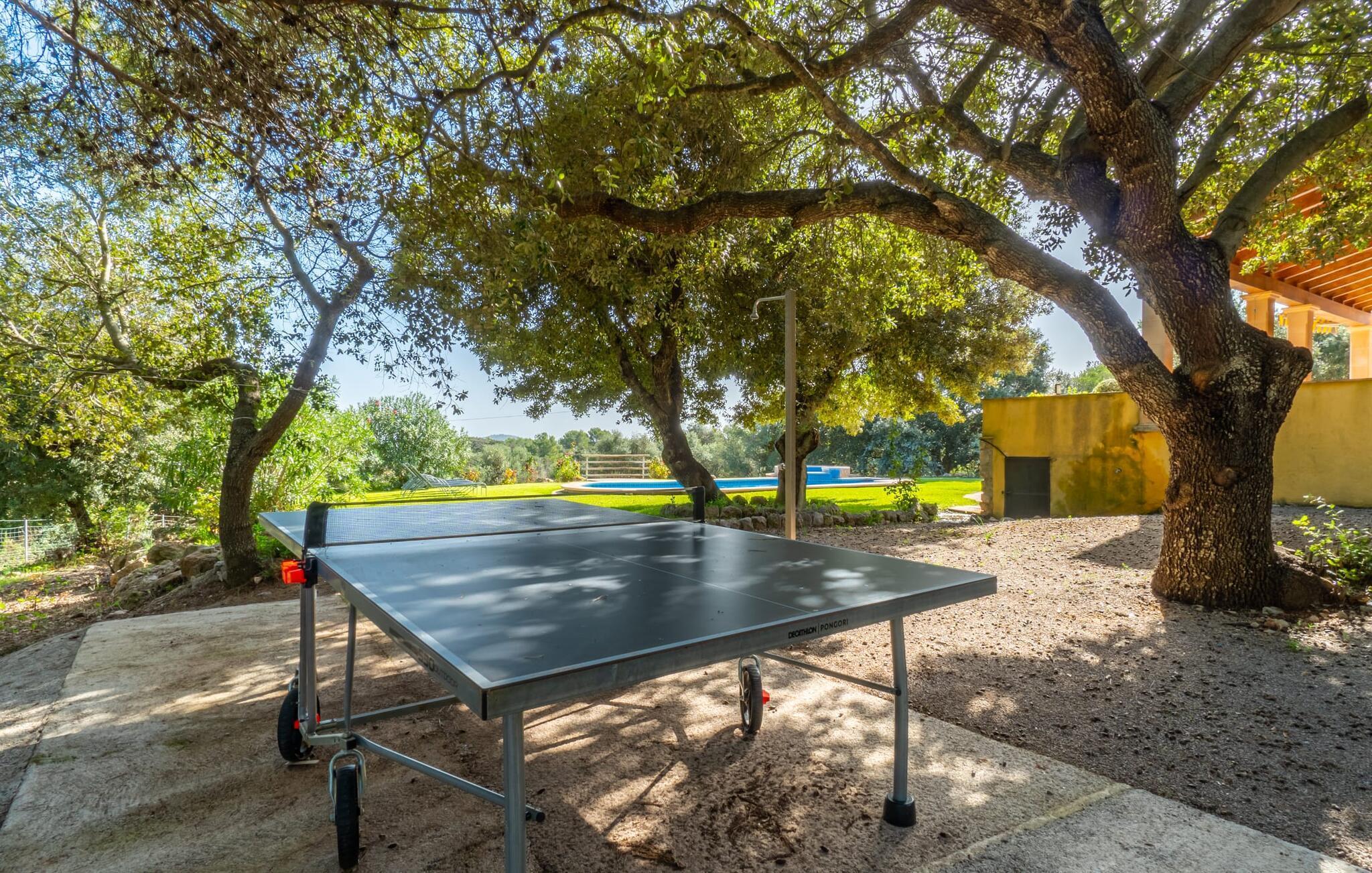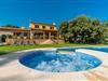 Das Anwesen ist von einer wunderschönen Naturlandschaft mit Zypressen, Oliven-, Johannisbrot- und Mandelbäumen sowie blühenden Gärten und weitläufigen Rasenflächen umgeben. Ein Highlight der Finca ist der einzigartige Poolbereich mit seinem blau gekachelten Becken und dem herrlichen Whirlpool, der bequem über eine Treppe erreichbar ist. Die lange, überdachte Terrasse neben dem Haus eignet sich hervorragend für gemeinsame Mahlzeiten und ermöglicht es Ihnen, gemeinsam die Aussicht zu genießen.