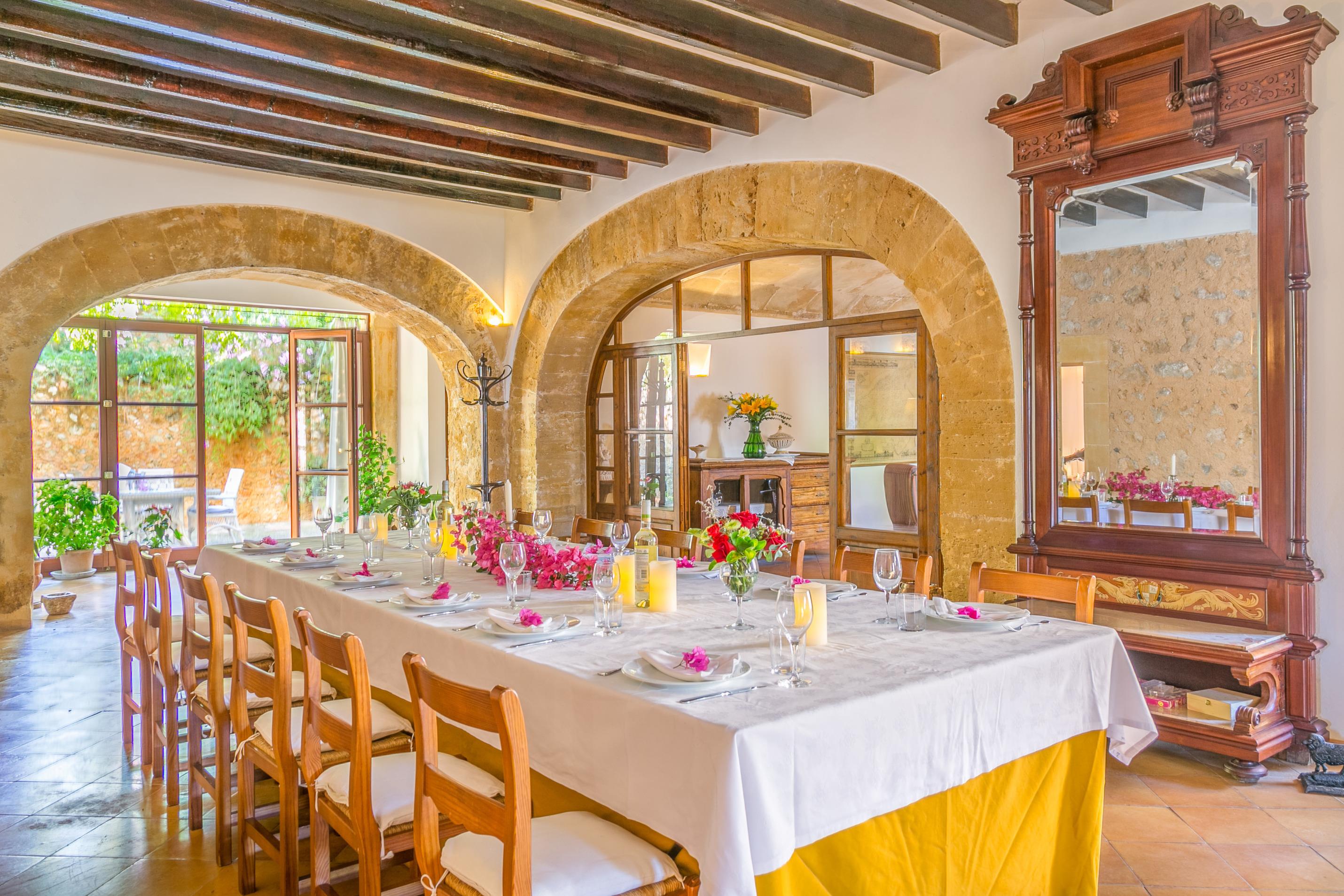Son Esteve has a large and spacious interior, various lounge areas and one with an open fireplace. You can enjoy dining inside at the main table or there are other dining options outside.