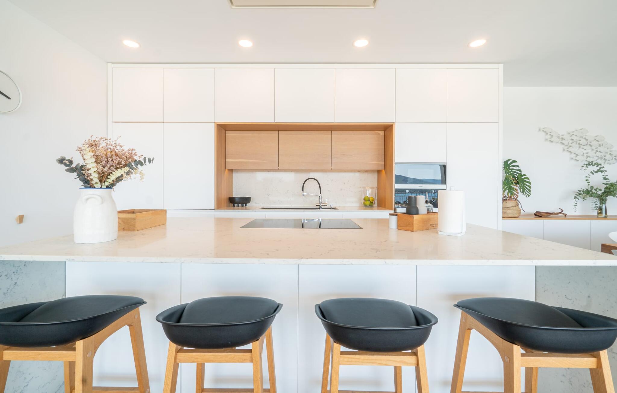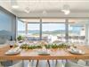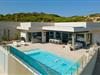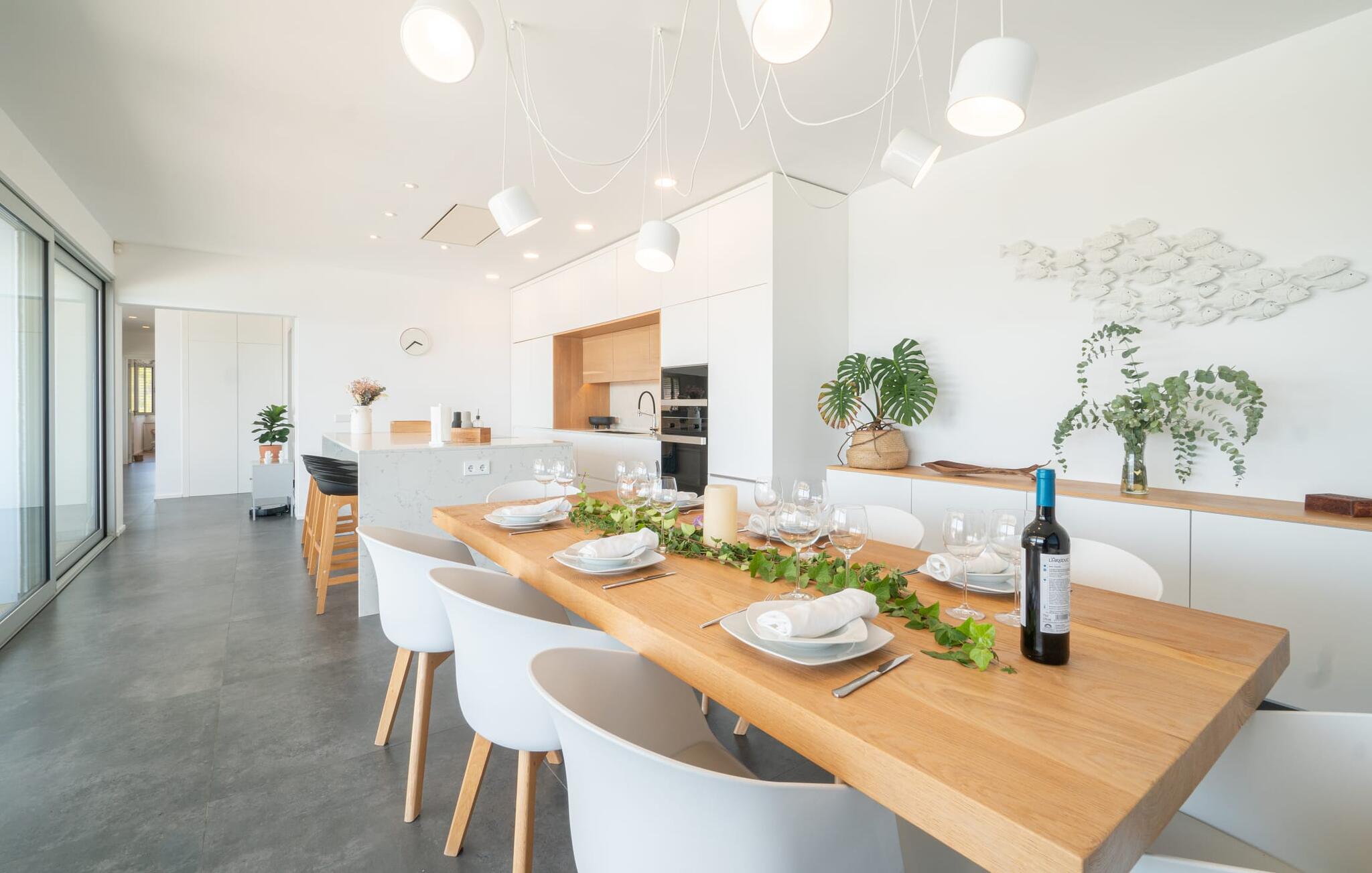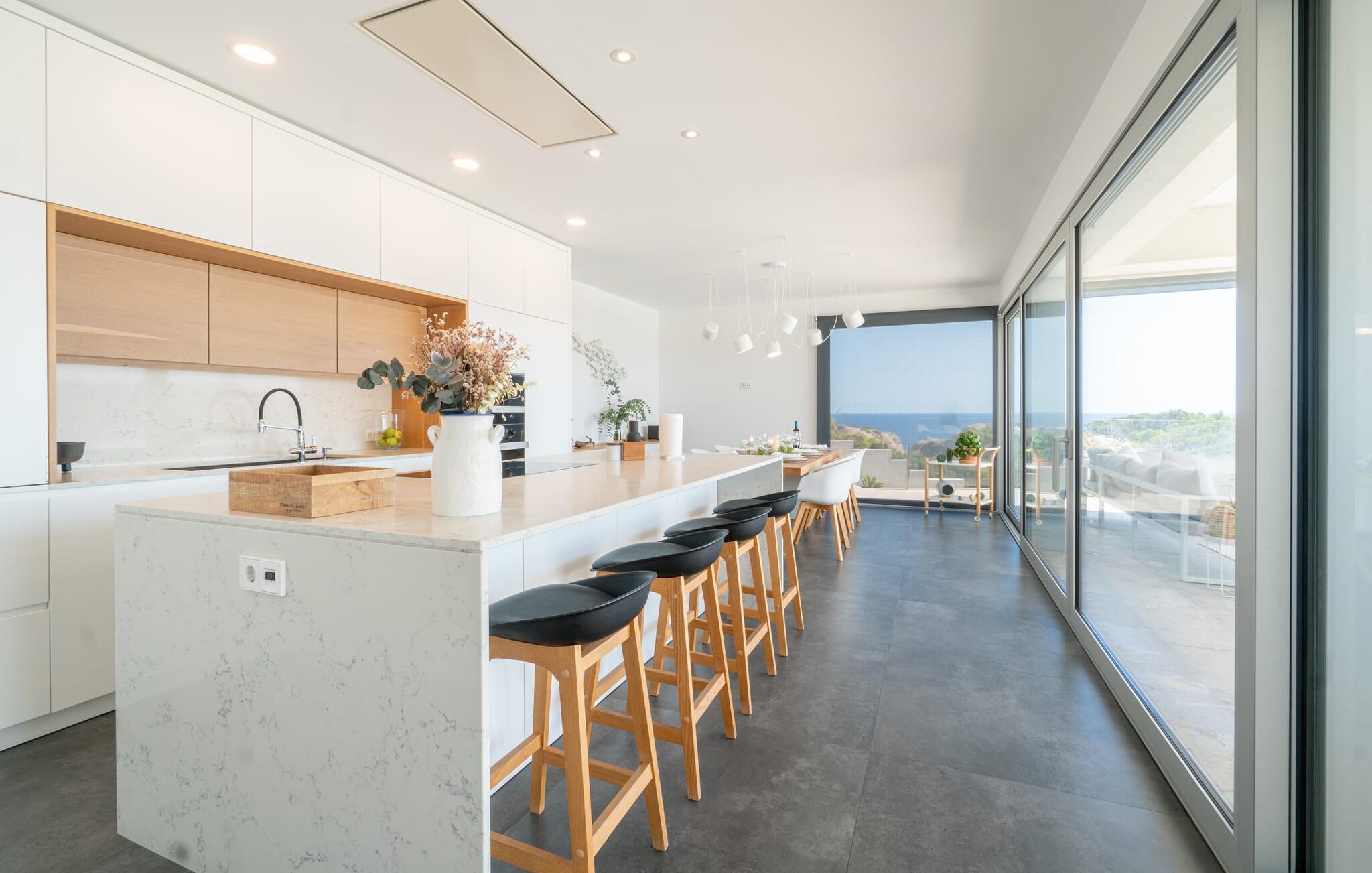 Auch von innen ist diese Villa richtig schick: Die vielen Fenster lassen viel Licht herein und gewähren einen fantastischen Blick auf das Meer. Sie sind aber auch mit Jalousien und Rollos ausgestattet, die dafür sorgen, dass es an sonnigen Tagen nicht zu warm im Haus wird. Viel Weiß und Naturtöne, kombiniert mit Designermöbeln und sorgfältig ausgewählten Wohnaccessoires, zaubern eine freundliche und stilvolle Atmosphäre im ganzen Haus. Im Erdgeschoss befinden sich neben zwei geschmackvoll eingerichteten Schlafzimmern mit einem gemeinsamen, modernen Badezimmer mit Badewanne ein einladender Eingangsbereich und eine praktische Waschküche. Das Obergeschoss auf Poolebene überzeugt mit einem großen Wohnzimmer, einem geräumigen Gäste-WC mit Dusche sowie einem Arbeitsplatz, der sich perfekt für ein Home-Office eignet – Anschlüsse sind vorhanden, wenn Sie Ihren Laptop mitbringen möchten. Auch die mit hochwertigen Geräten ausgestattete Küche und der offene Essbereich sind echte Highlights: Von hier aus genießen Sie dank bodentiefer Fenster den Blick auf die Terrasse und das Meer. Ein weiteres Schlafzimmer mit Ankleidezimmer und Bad en Suite runden den Wohnkomfort ab.