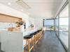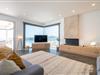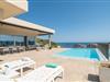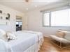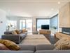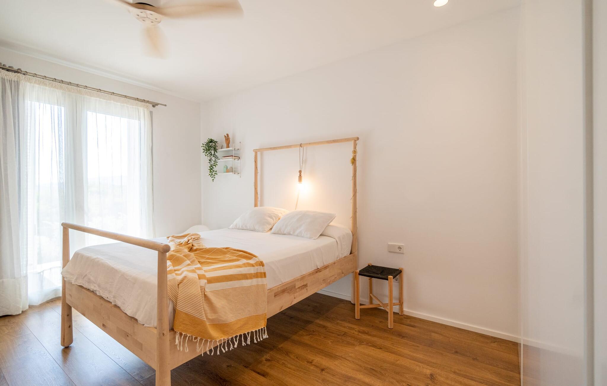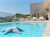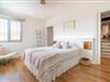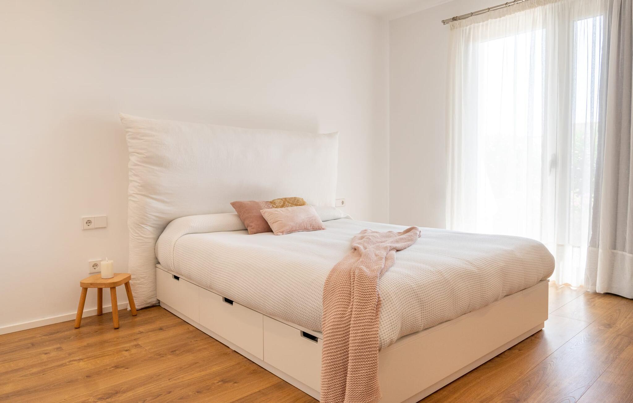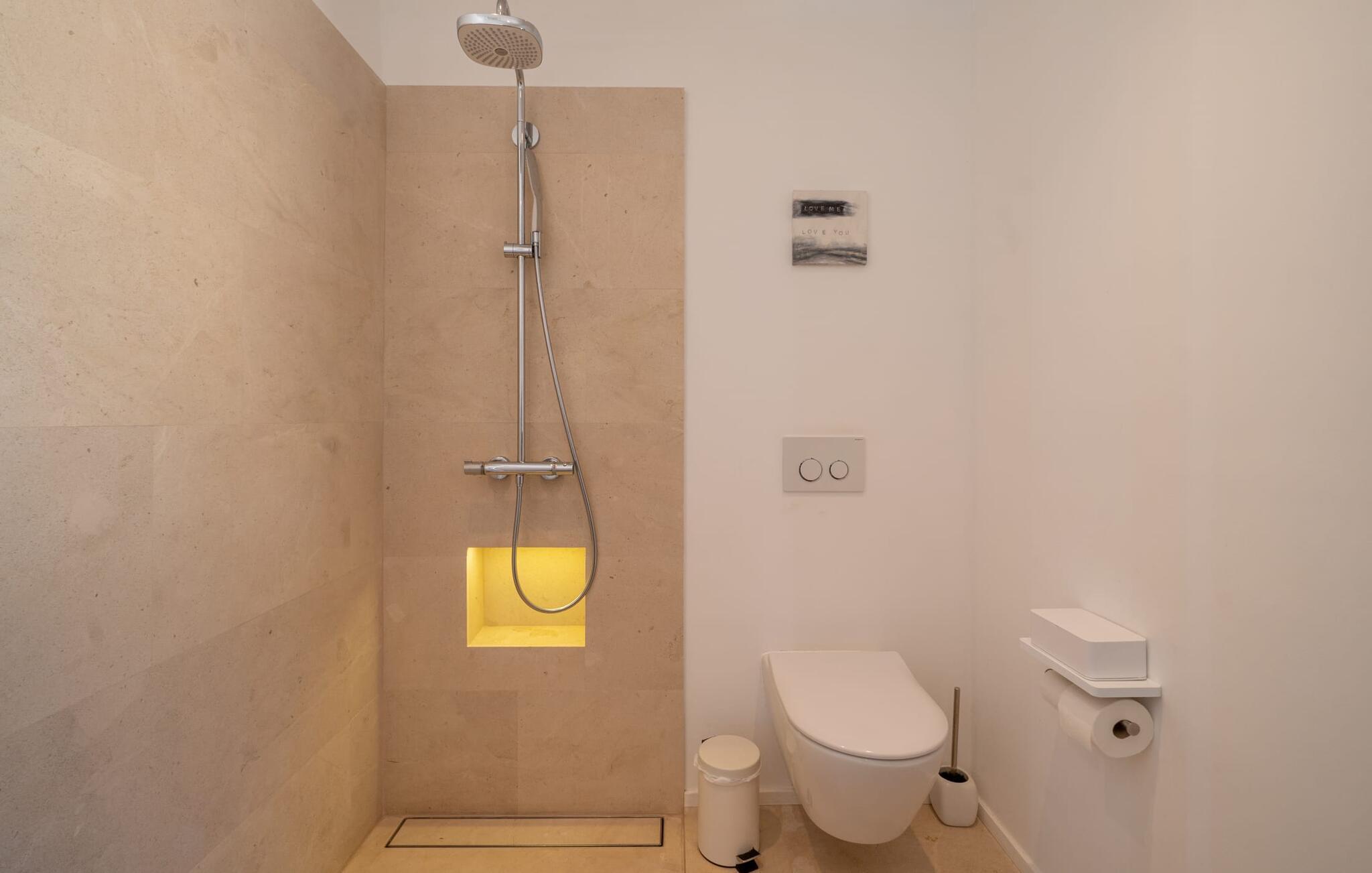 Auch von innen ist diese Villa richtig schick: Die vielen Fenster lassen viel Licht herein und gewähren einen fantastischen Blick auf das Meer. Sie sind aber auch mit Jalousien und Rollos ausgestattet, die dafür sorgen, dass es an sonnigen Tagen nicht zu warm im Haus wird. Viel Weiß und Naturtöne, kombiniert mit Designermöbeln und sorgfältig ausgewählten Wohnaccessoires, zaubern eine freundliche und stilvolle Atmosphäre im ganzen Haus. Im Erdgeschoss befinden sich neben zwei geschmackvoll eingerichteten Schlafzimmern mit einem gemeinsamen, modernen Badezimmer mit Badewanne ein einladender Eingangsbereich und eine praktische Waschküche. Das Obergeschoss auf Poolebene überzeugt mit einem großen Wohnzimmer, einem geräumigen Gäste-WC mit Dusche sowie einem Arbeitsplatz, der sich perfekt für ein Home-Office eignet – Anschlüsse sind vorhanden, wenn Sie Ihren Laptop mitbringen möchten. Auch die mit hochwertigen Geräten ausgestattete Küche und der offene Essbereich sind echte Highlights: Von hier aus genießen Sie dank bodentiefer Fenster den Blick auf die Terrasse und das Meer. Ein weiteres Schlafzimmer mit Ankleidezimmer und Bad en Suite runden den Wohnkomfort ab.