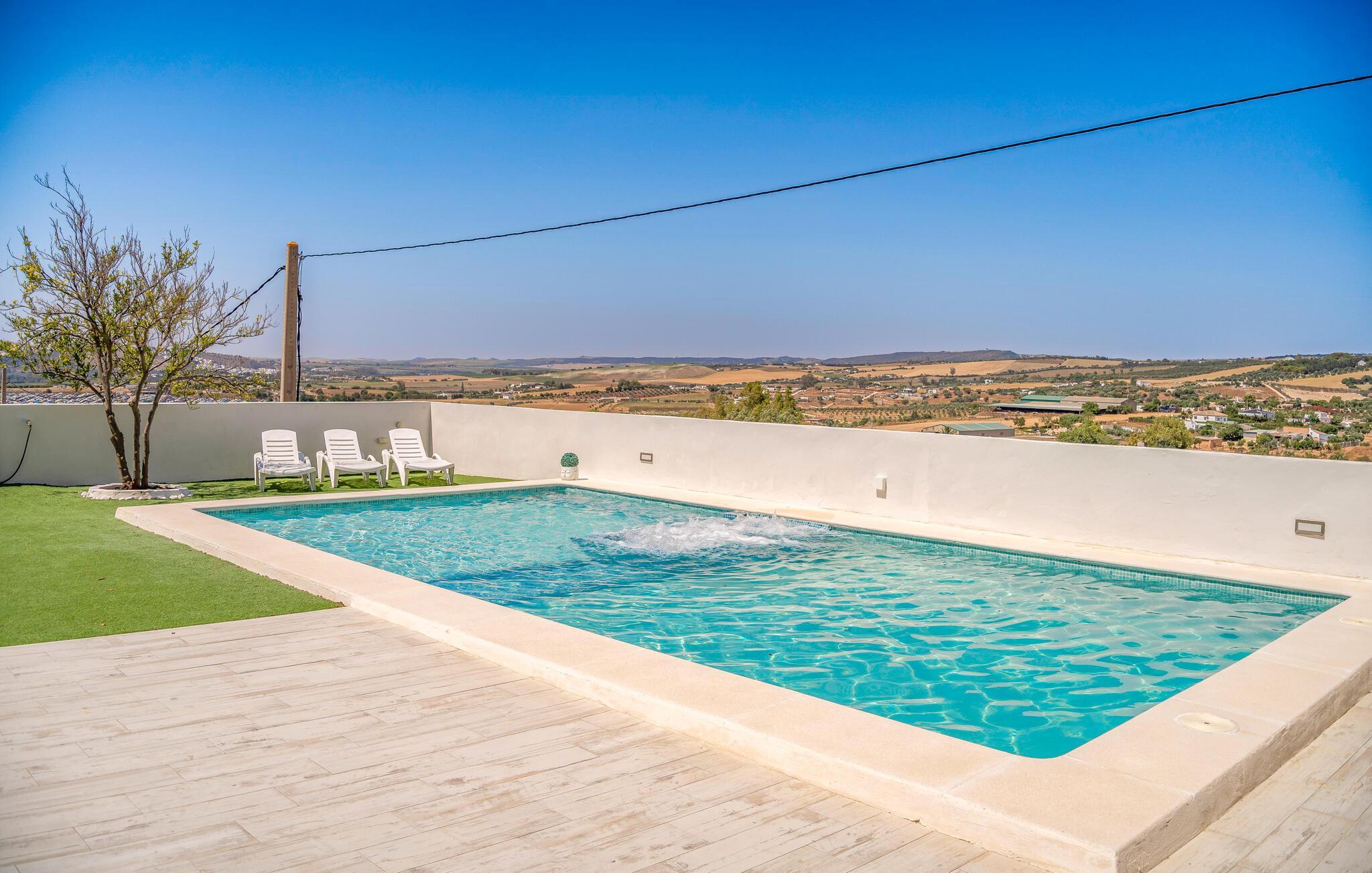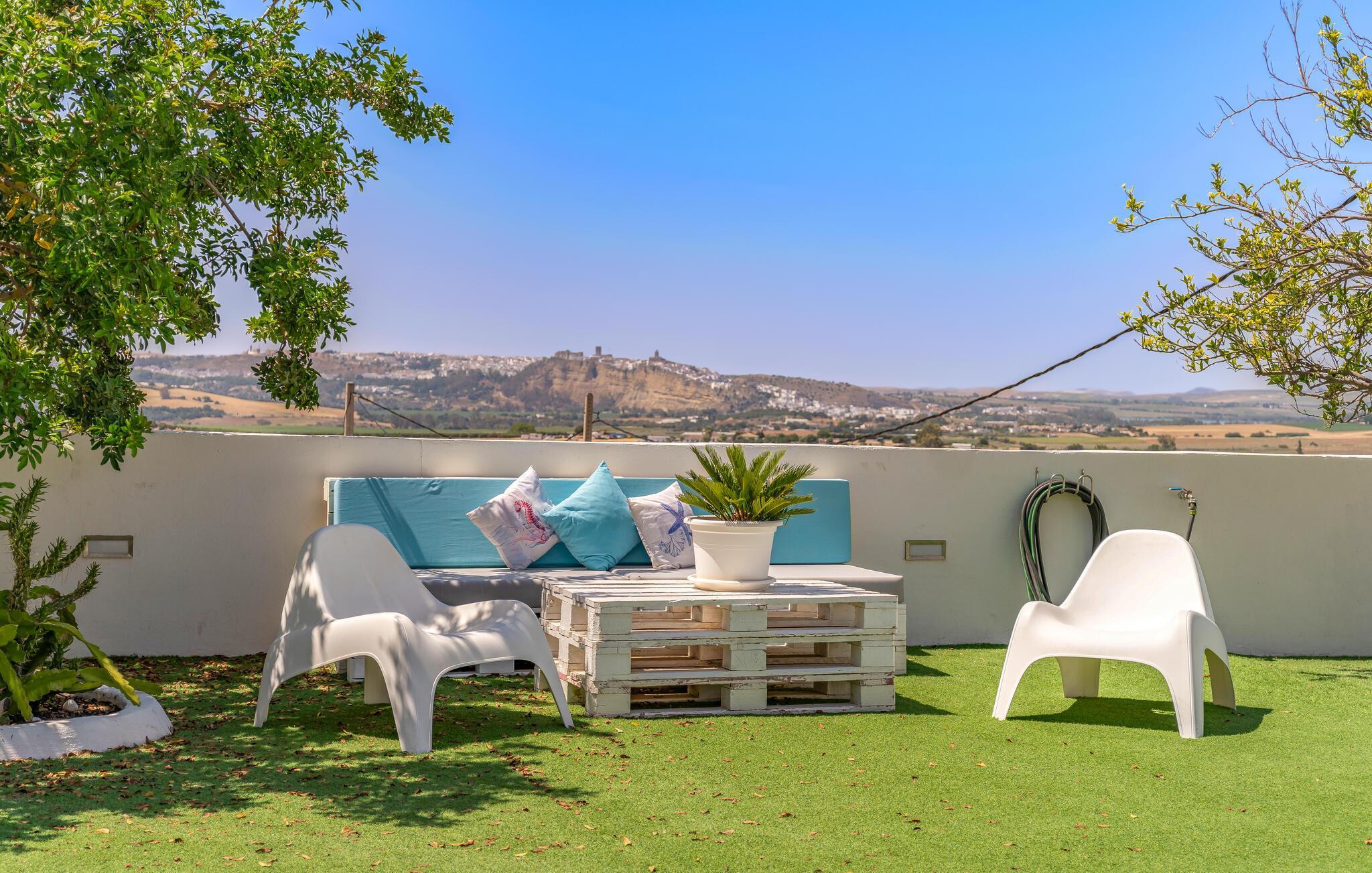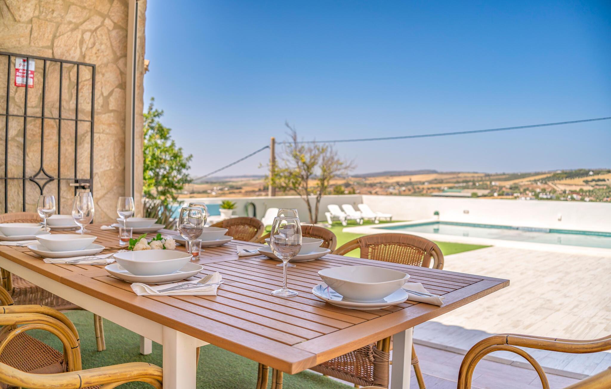 Beginnen Sie den Tag mit einem erfrischenden Bad im großzügigen Pool und genießen Sie die Sonne auf der einladenden Terrasse. Der Blick auf die malerische Landschaft von Arcos de la Frontera wird Sie verzaubern und lädt dazu ein, die Seele baumeln zu lassen. Entspannen Sie anschließend im Whirlpool und lassen Sie den Alltagsstress hinter sich. Genießen Sie die ländliche Idylle und gönnen Sie sich eine Auszeit vom hektischen Alltag. Im Außenbereich steht Ihnen zudem eine Tischtennisplatte zur Verfügung. Eine perfekte Gelegenheit, um sich sportlich zu betätigen und Spaß mit der Familie zu haben. Der überdachte Essbereich im Freien lädt zu gemeinsamen Mahlzeiten ein, während der Grill Ihnen die Möglichkeit bietet, abends in geselliger Runde den Tag ausklingen zu lassen.