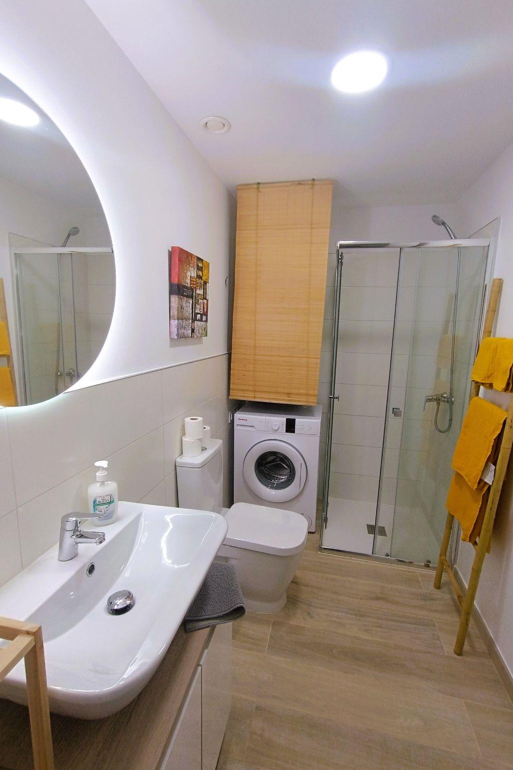 Die Wohnung befindet sich im dritten Stock eines neu errichteten Gebäudes, sehr hell und in einem modernen Stil eingerichtet. Sie verfügt über eine Eingangshalle mit einem Schreibtisch für die Telearbeit, ein Badezimmer mit Dusche, zwei Doppelzimmer (eines davon mit TV) und eine voll ausgestattete Küche (Backofen, Geschirrspüler, Mikrowelle, Kühlschrank, etc.). Das Wohnzimmer hat ein großes Schlafsofa, einen Esstisch und einen Fernseher. Vom Wohnzimmer aus hat man Zugang zur Terrasse, die auf eine ruhige Straße hinausgeht.