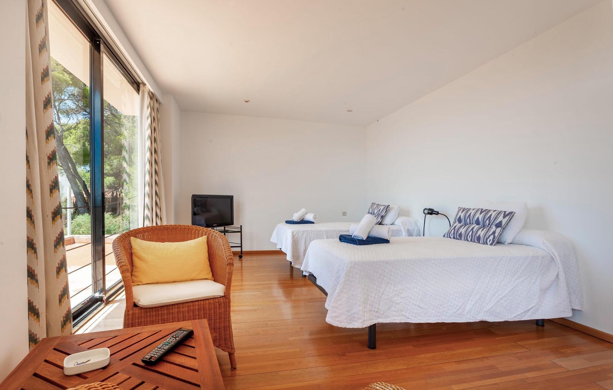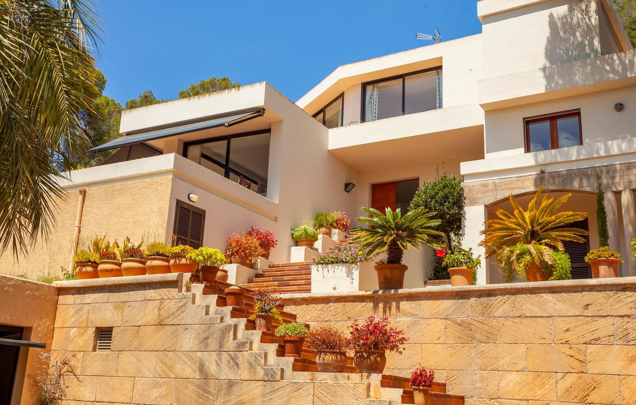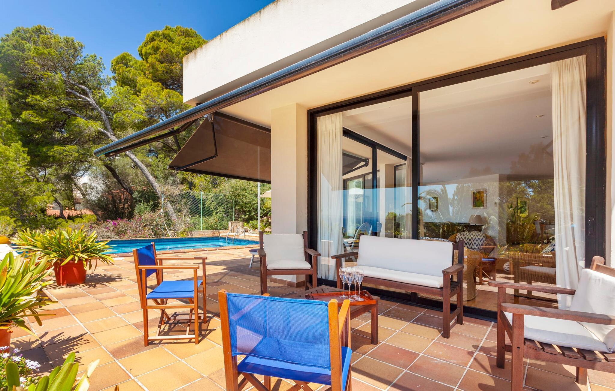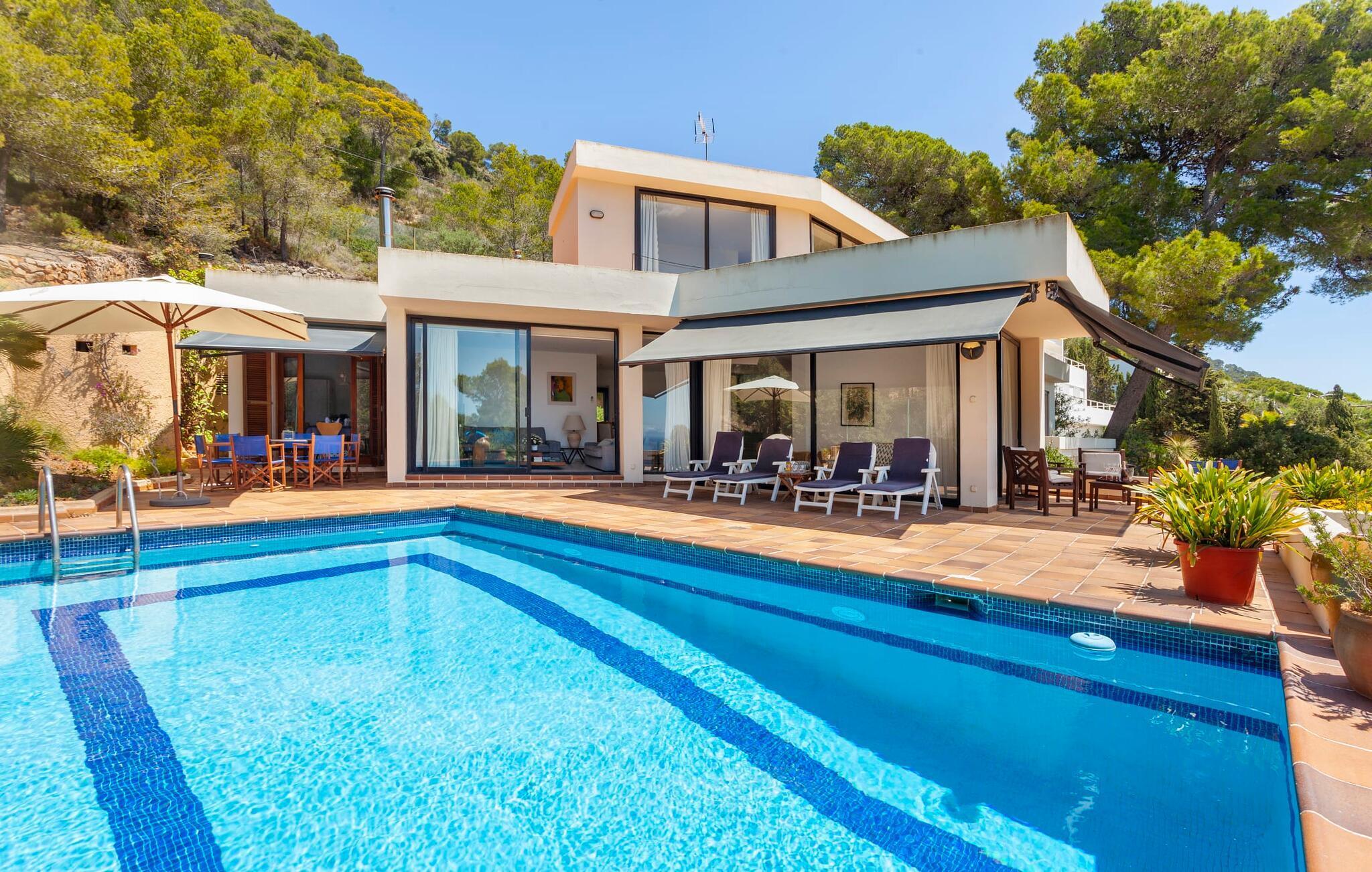 Die Villa „Avinguda del Pinar 89“ liegt eingebettet in einen Hang mit vielen Bäumen: Nach hinten die unberührten Hügel, nach vorne der endlose Ausblick auf das Mittelmeer. Der Pool ist groß genug, um ein paar Bahnen zu schwimmen und dabei den Blick auf das Meer zu genießen. Auch die umlaufende Terrasse haben die Eigentümer mit Terrakottafliesen und hochwertigen Möbeln ausgestattet. Schließlich soll man es sich gemütlich machen können, während man unter dem Sonnenschirm ein Glas Wein trinkt oder ein paar Gäste begrüßt. Insgesamt umfasst das Anwesen insgesamt 2000 m² – ausreichend Platz, um sich bei Bedarf gegenseitig aus dem Weg zu gehen.