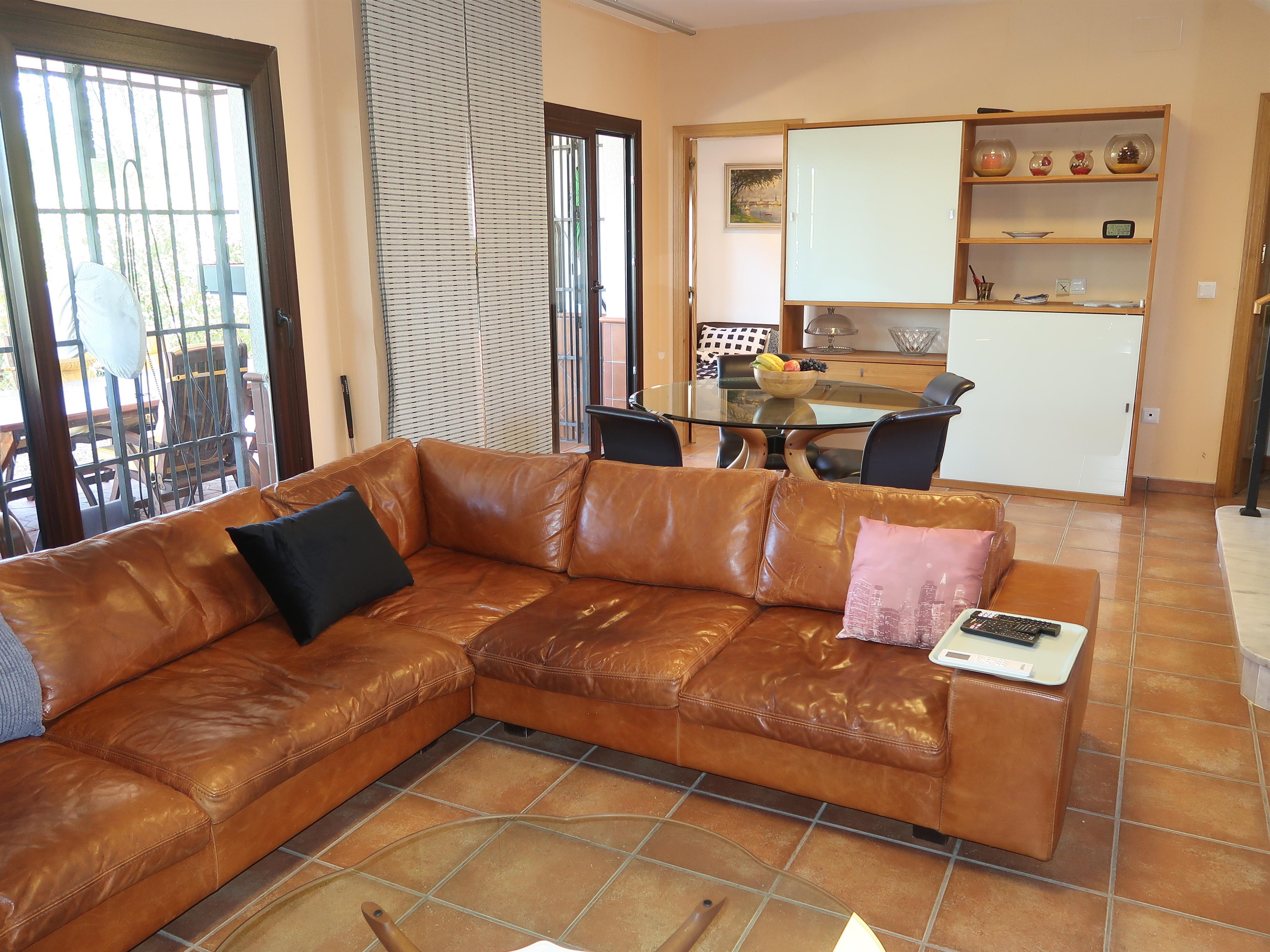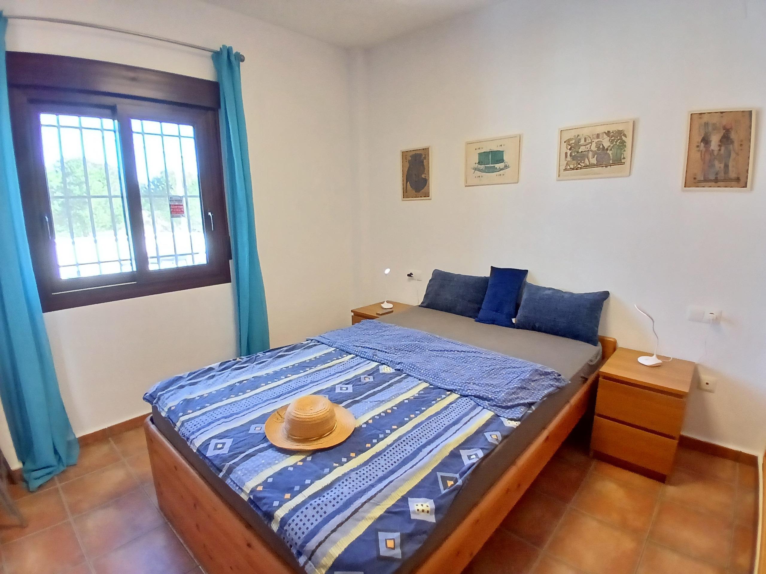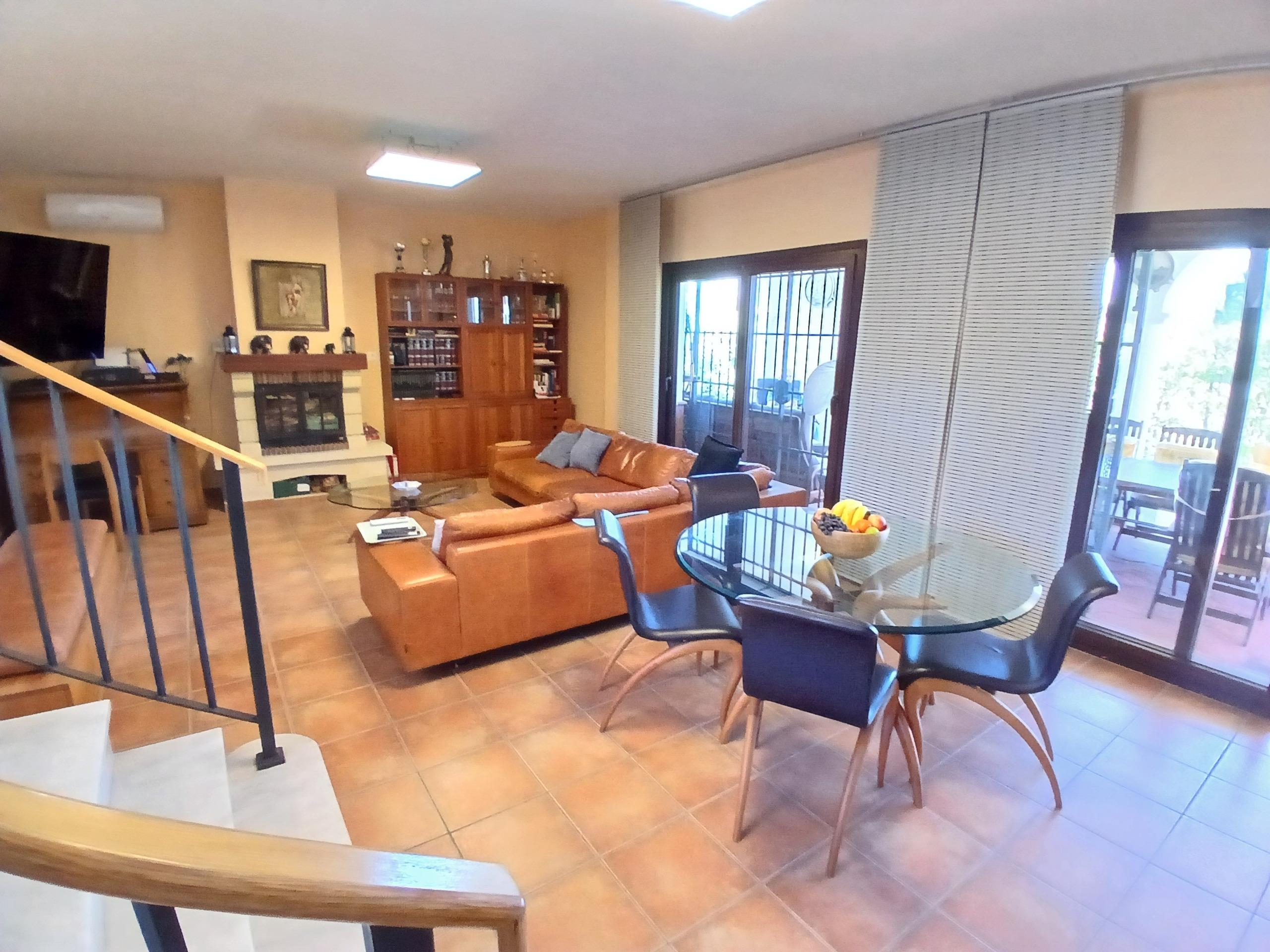 Treppe ins Erdgeschoß: Wohnraum mit Leder-Couchgarnitur, geschlossenem Kamin, großem Flachbild-Kabel-TV (Smart-TV, v.a. spanische und deutsche Kanäle), Essplatz und Terrassenausgang. Schlafzimmer mit Doppelbettcouch, direkter Zugang zu Dusche/WC. Vom Zwischengeschoß Treppe ins Obergeschoß: Diele, Balkonausgang. Schlafzimmer mit franz. Bett. Schlafzimmer mit Einzelbett mit Schreibtisch für Workstation und Internetanschluß. Bad mit ebenerdiger Dusche mit Massagendüsen, Bidet und WC.