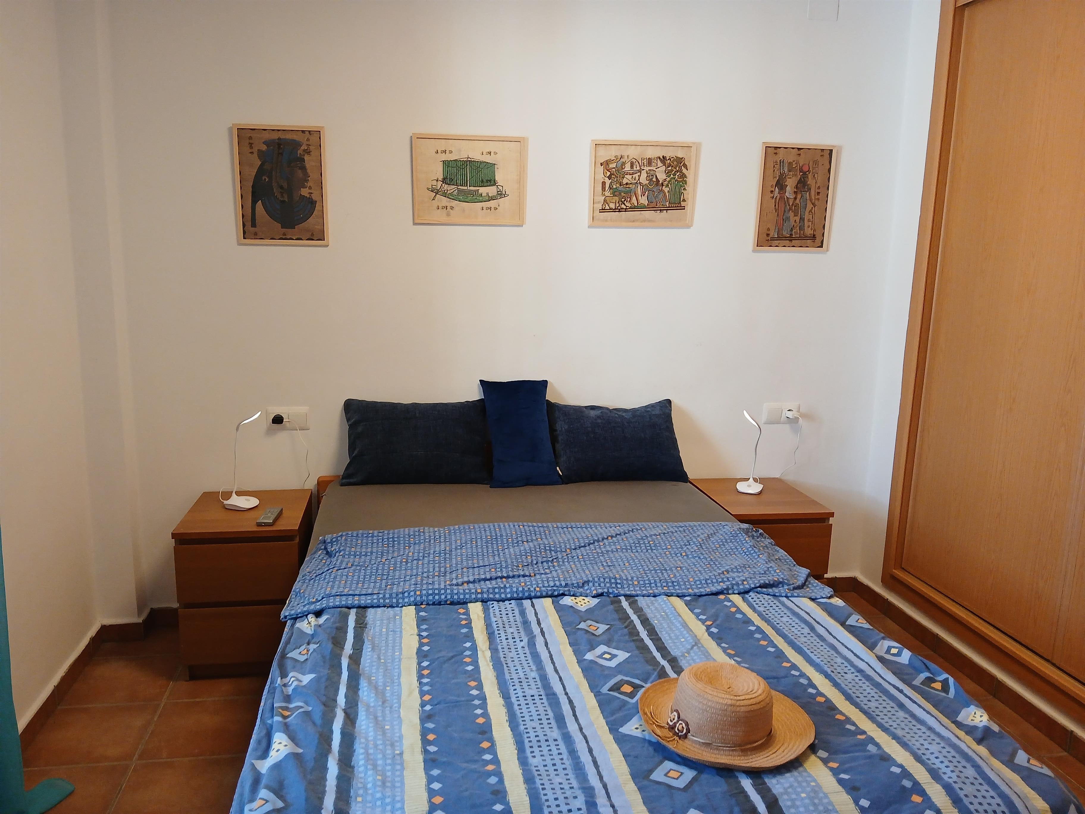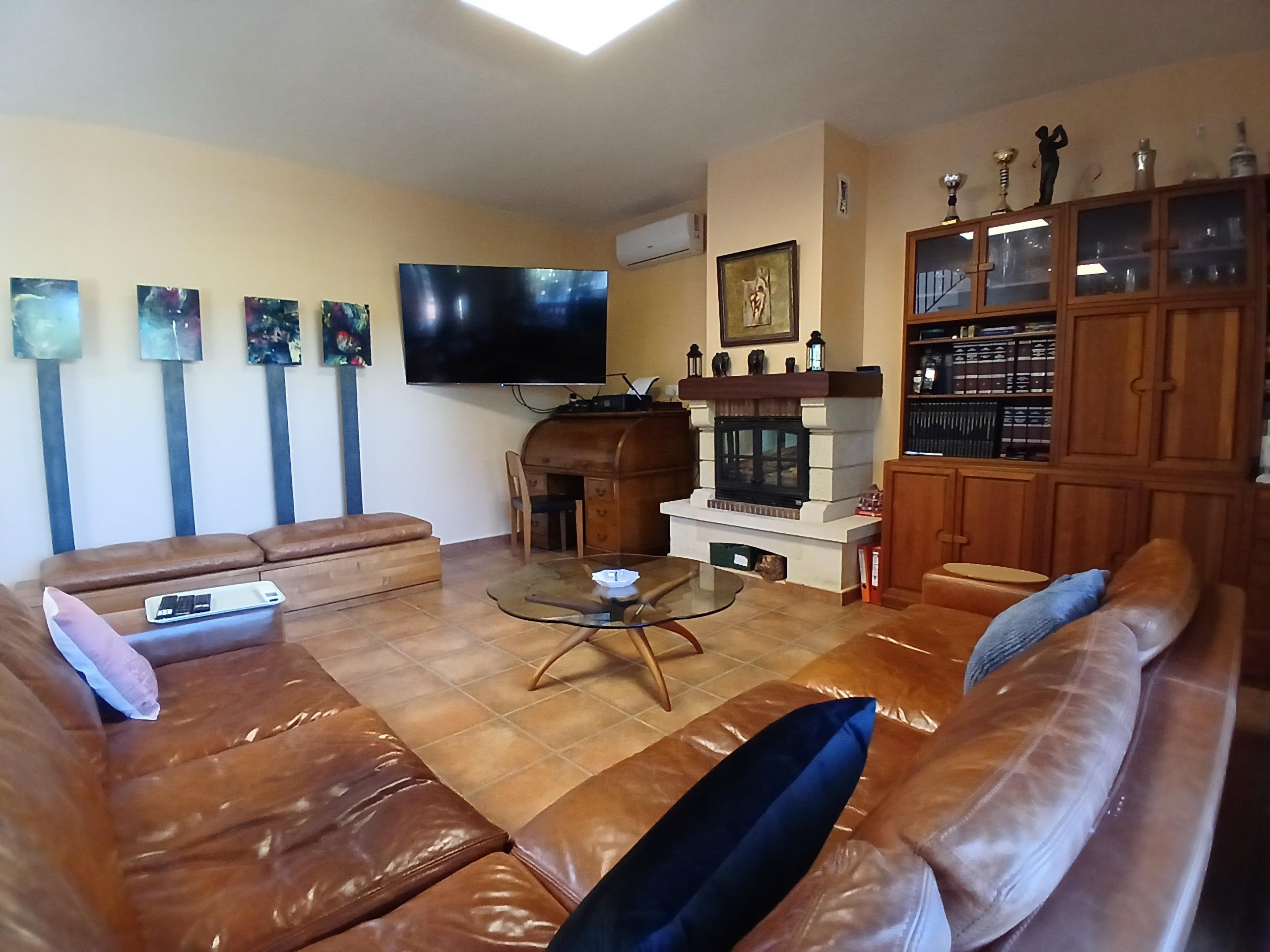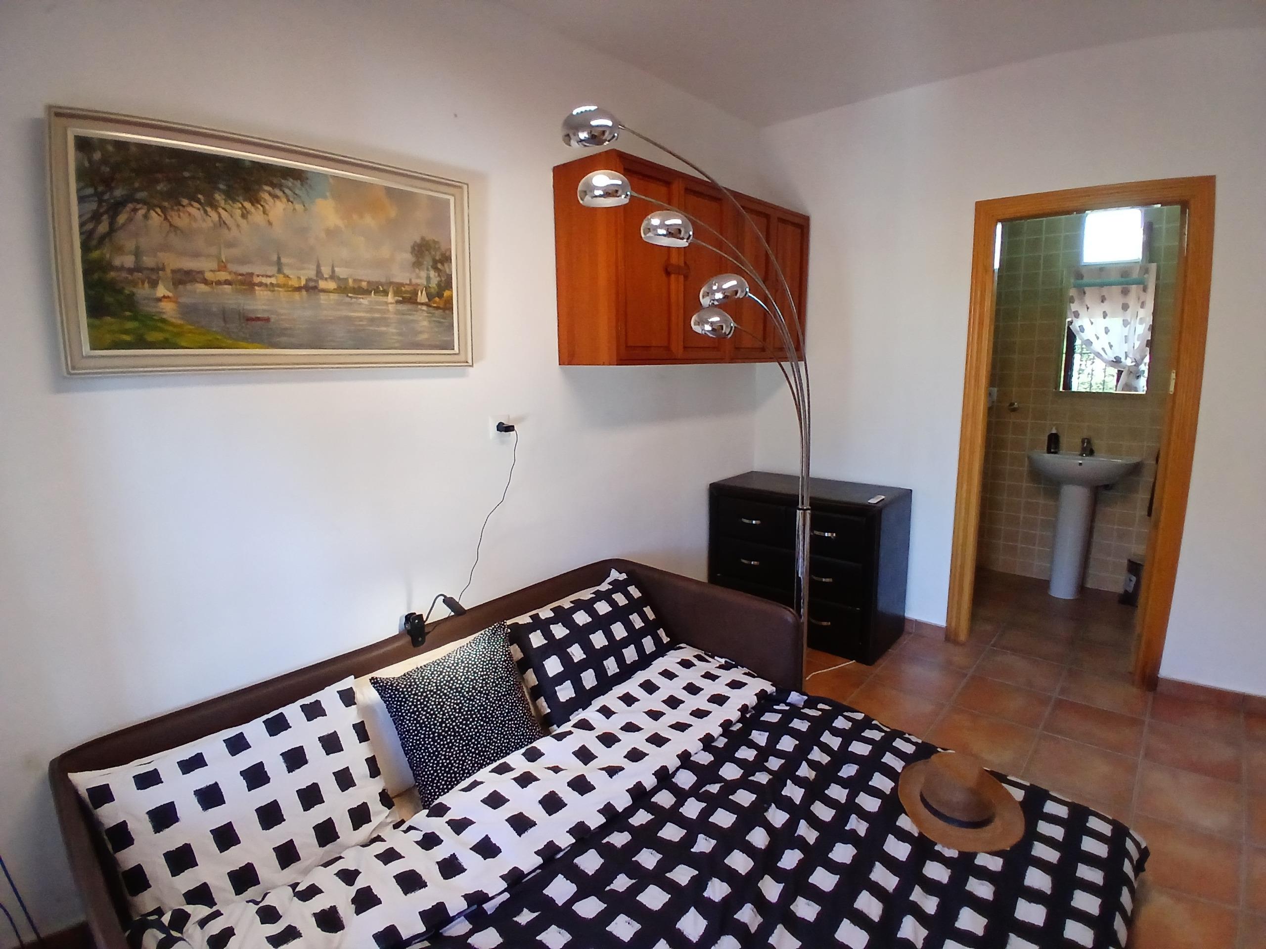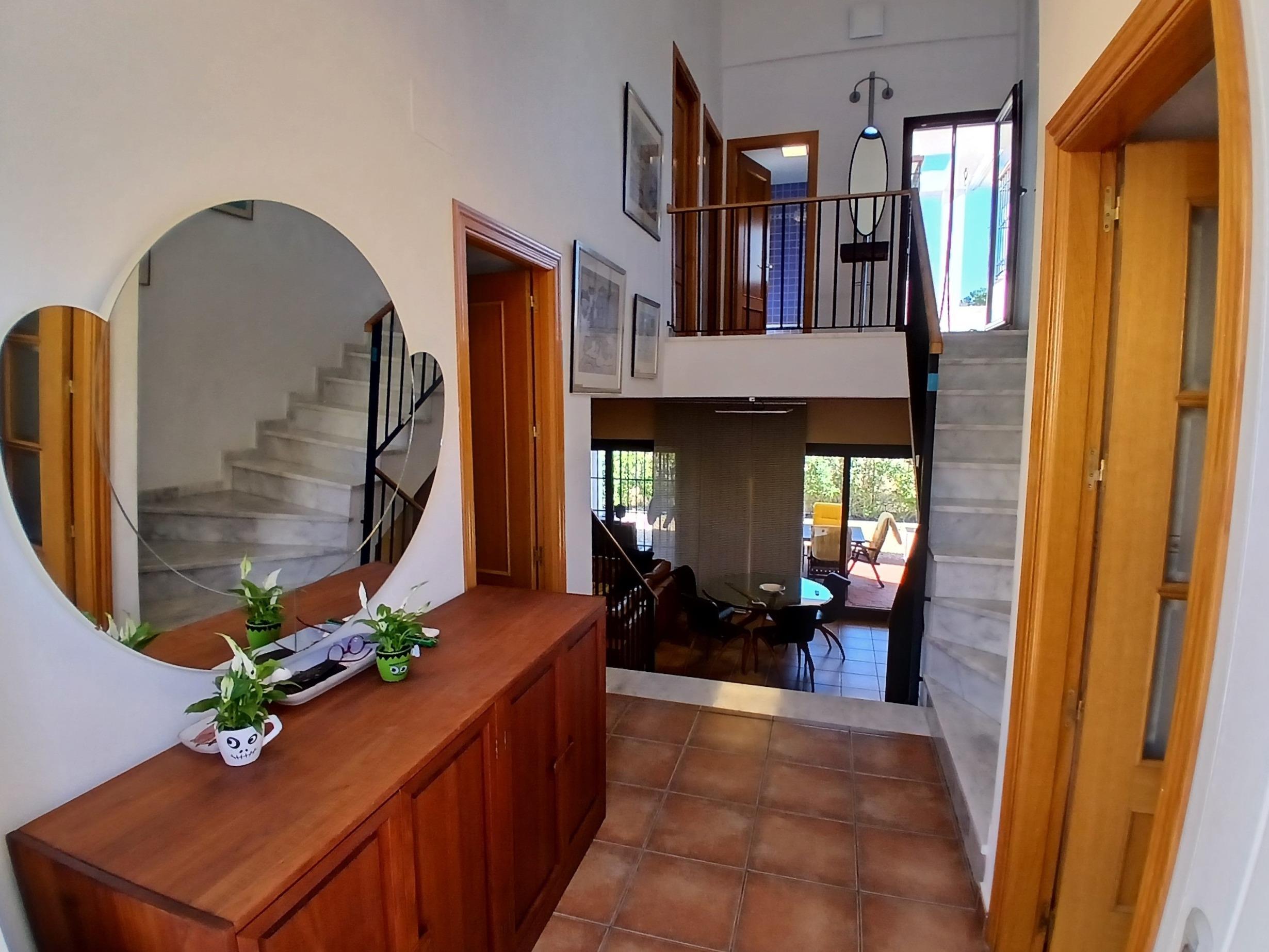 Treppe ins Erdgeschoß: Wohnraum mit Leder-Couchgarnitur, geschlossenem Kamin, großem Flachbild-Kabel-TV (Smart-TV, v.a. spanische und deutsche Kanäle), Essplatz und Terrassenausgang. Schlafzimmer mit Doppelbettcouch, direkter Zugang zu Dusche/WC. Vom Zwischengeschoß Treppe ins Obergeschoß: Diele, Balkonausgang. Schlafzimmer mit franz. Bett. Schlafzimmer mit Einzelbett mit Schreibtisch für Workstation und Internetanschluß. Bad mit ebenerdiger Dusche mit Massagendüsen, Bidet und WC.