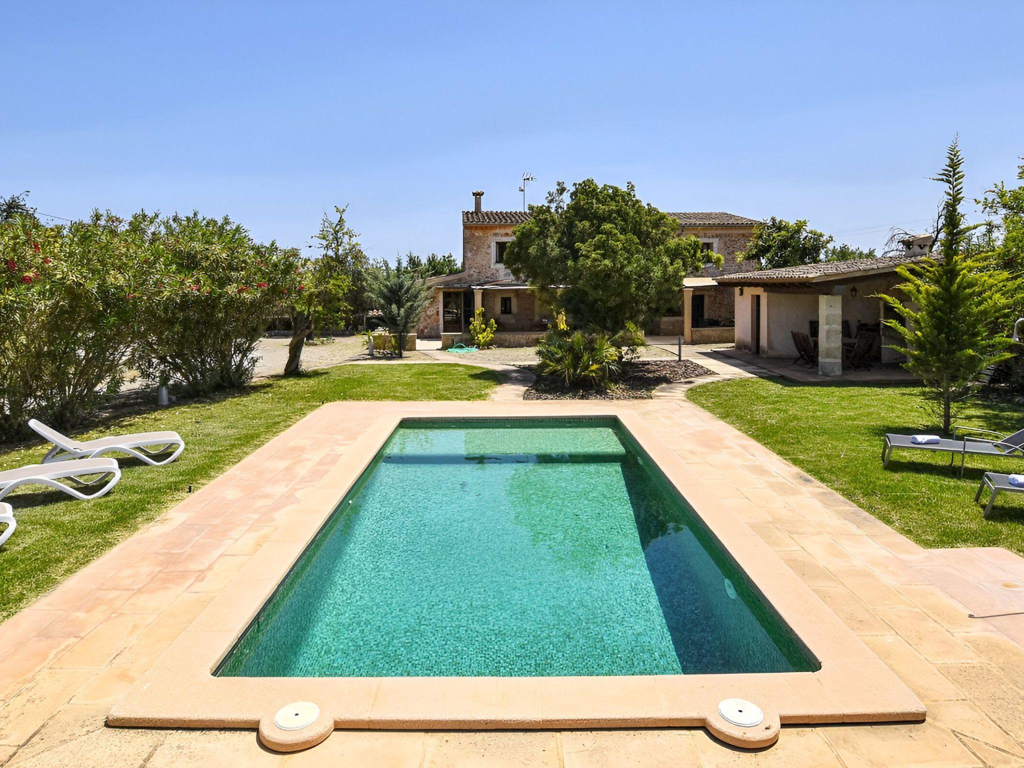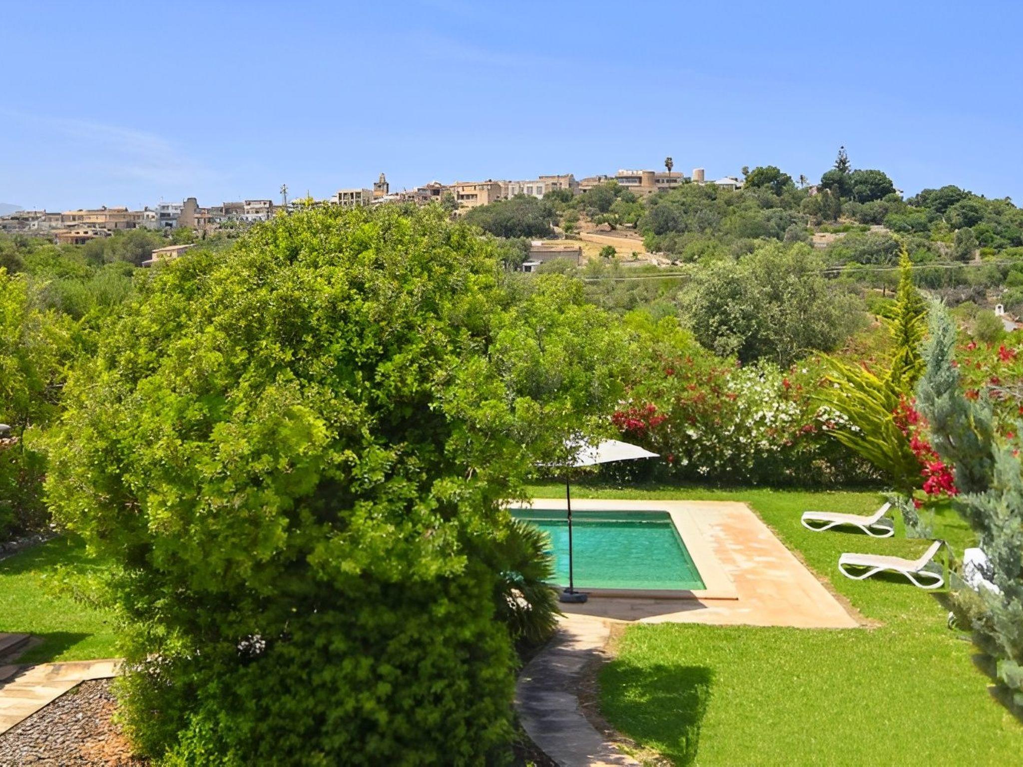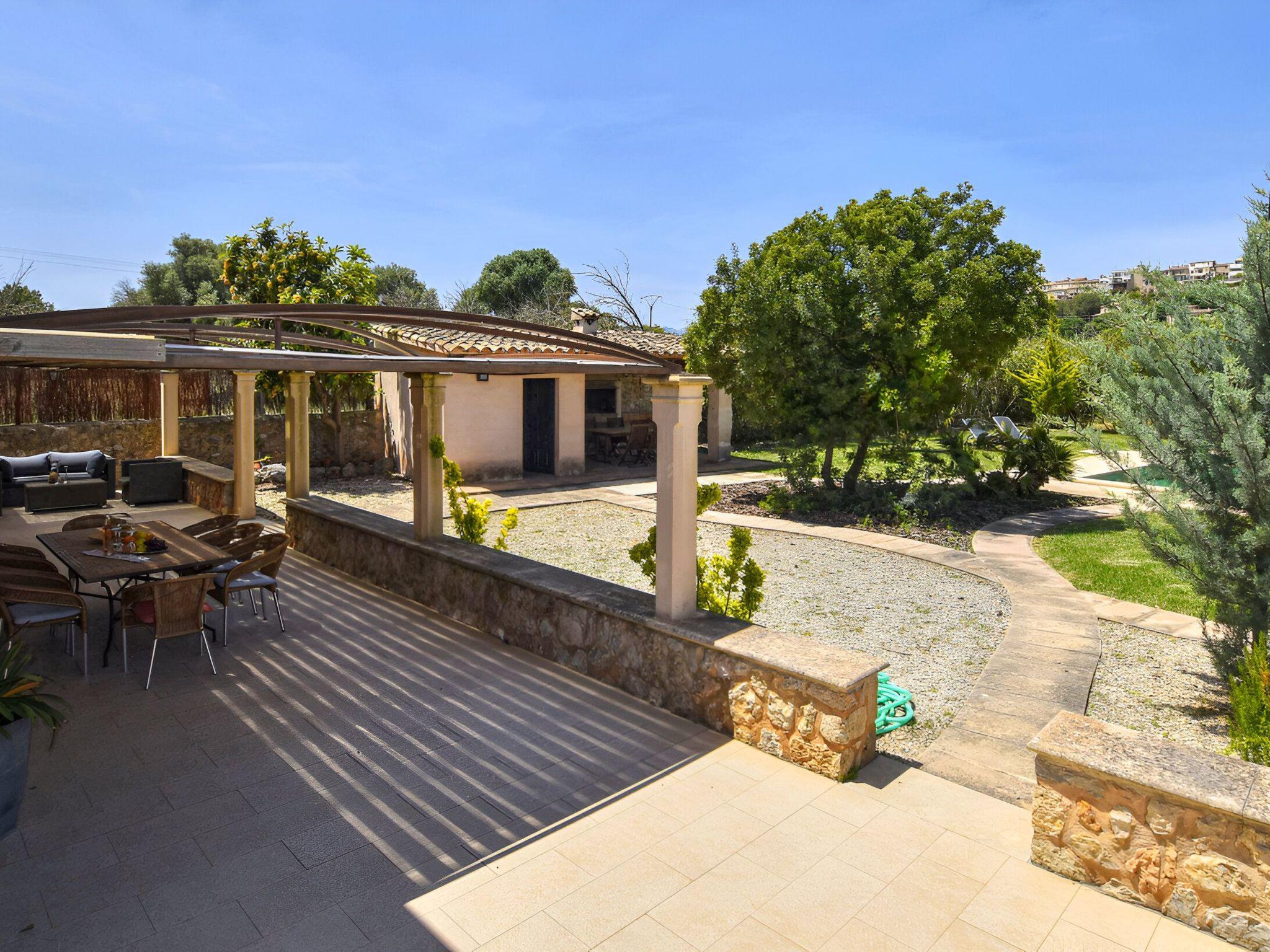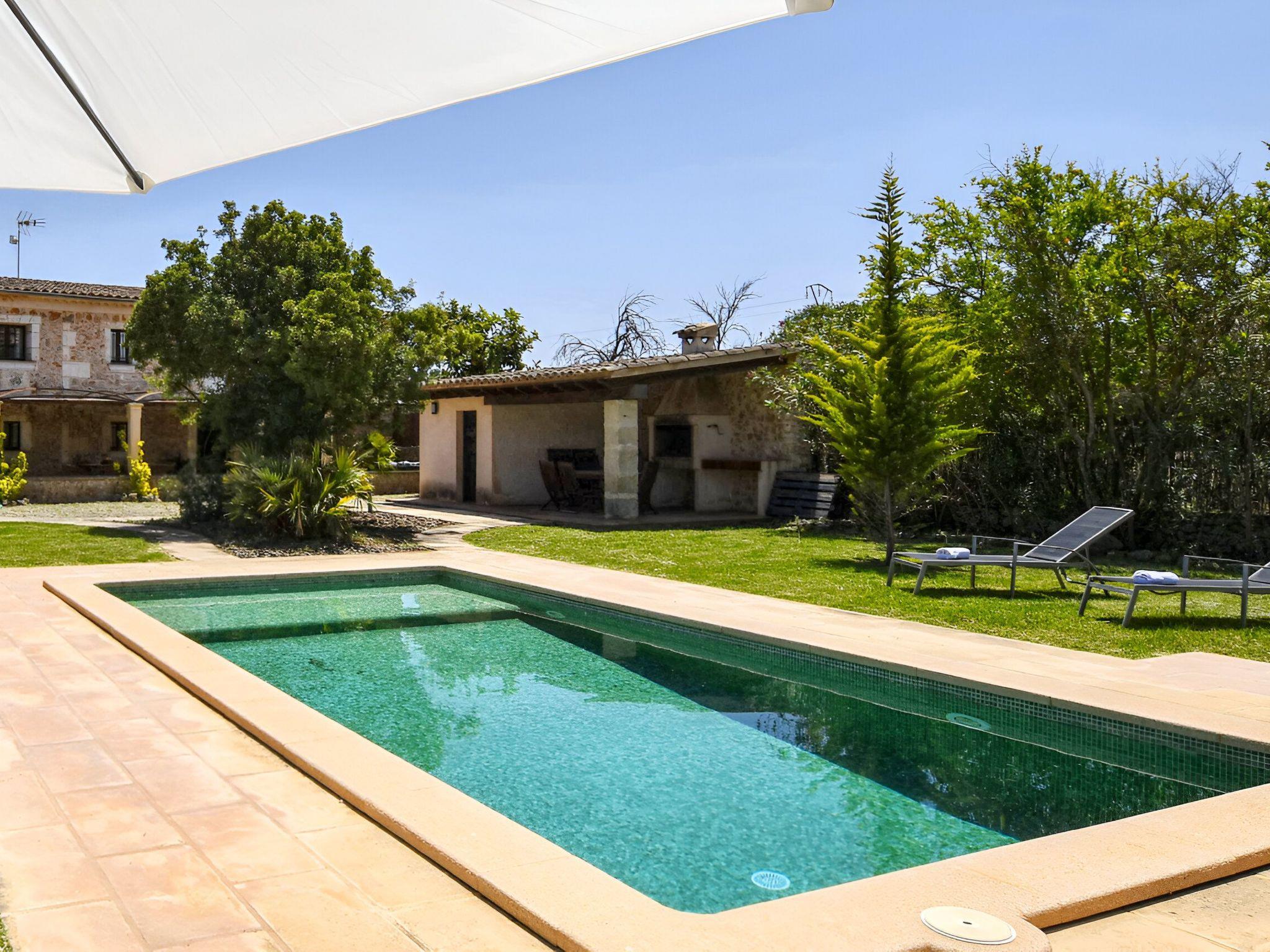Die schattenspendende Terrasse ist ausgestattet mit einem Esstisch und einer chilligen Sofaecke. Von hieraus hat man einen wundervollen Blick auf den schönen Garten und das Dorf Buger. In Richtung Pool befindet sich links die überdachte Grillecke. Und vom Grillbereich geht es weiter zum privaten 8 m x 4 m Swimming Pool ( Tiefe 0,60m - 1,80m ) der in eine Rasenfläche eingebettet ist und die umliegenden hohen Heckenbüsche sorgen für die notwendige Privatsphäre. Zur Finca gehört zudem ein Stück Land mit ca. 5.500 m2 auf dem man Mandel-, Orangenbäume vorfindet.