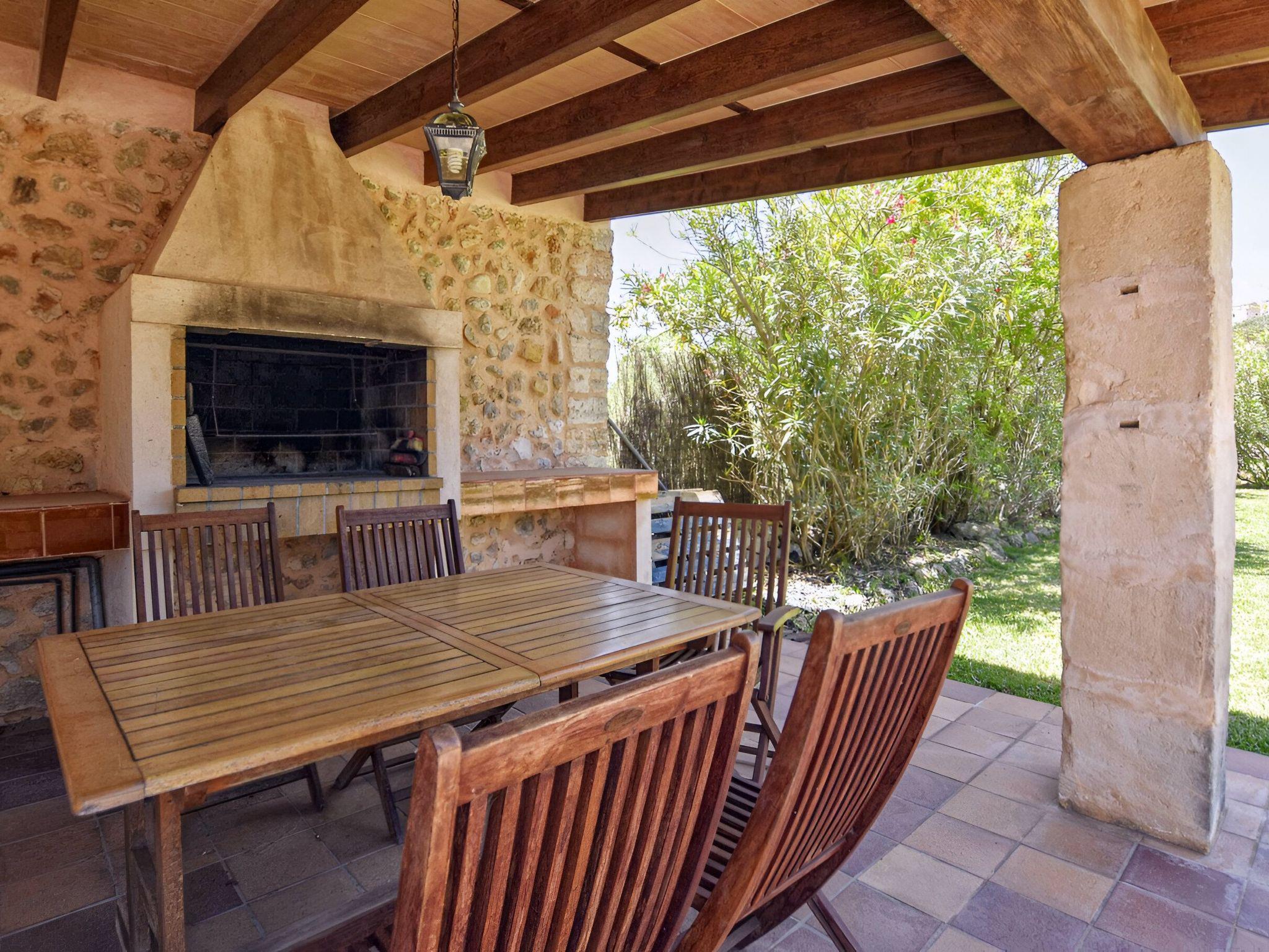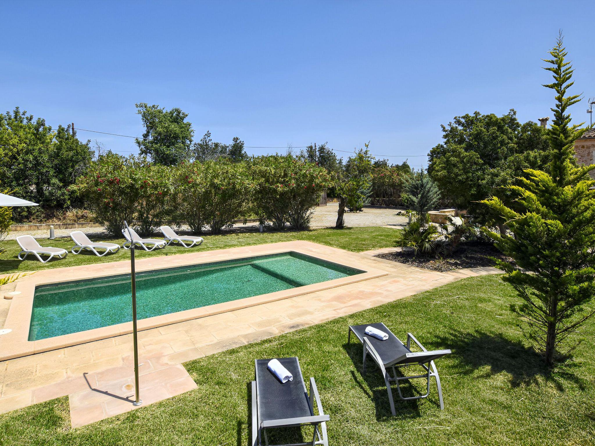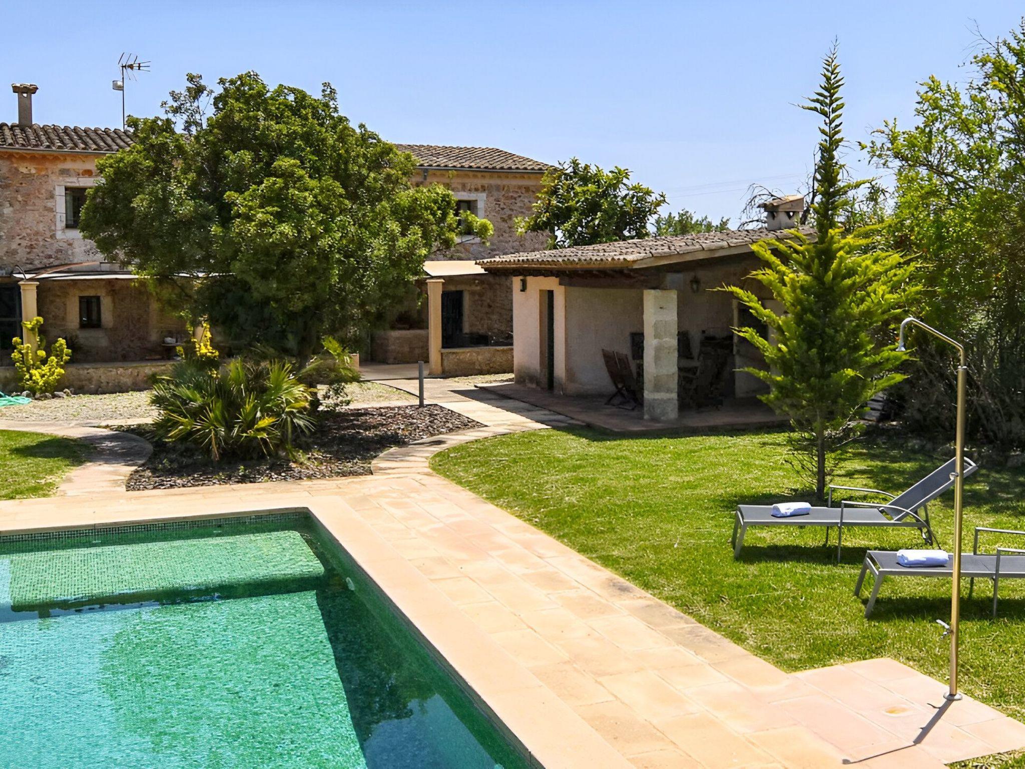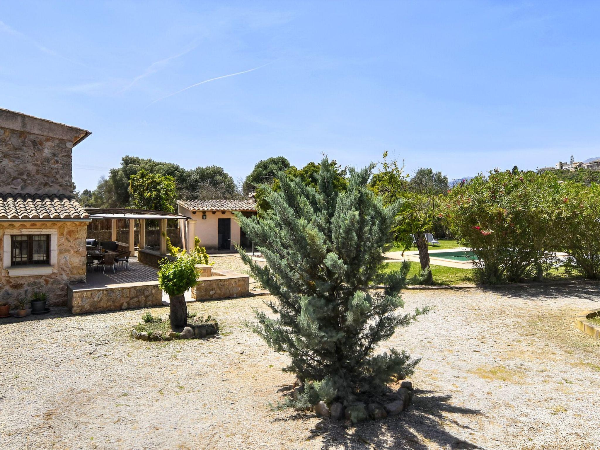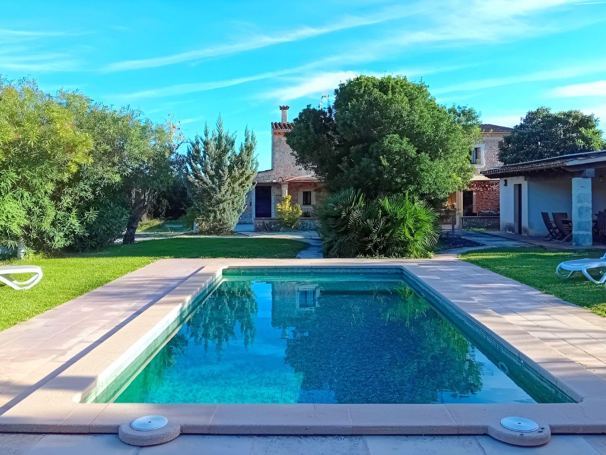 Die schattenspendende Terrasse ist ausgestattet mit einem Esstisch und einer chilligen Sofaecke. Von hieraus hat man einen wundervollen Blick auf den schönen Garten und das Dorf Buger. In Richtung Pool befindet sich links die überdachte Grillecke. Und vom Grillbereich geht es weiter zum privaten 8 m x 4 m Swimming Pool ( Tiefe 0,60m - 1,80m ) der in eine Rasenfläche eingebettet ist und die umliegenden hohen Heckenbüsche sorgen für die notwendige Privatsphäre. Zur Finca gehört zudem ein Stück Land mit ca. 5.500 m2 auf dem man Mandel-, Orangenbäume vorfindet.