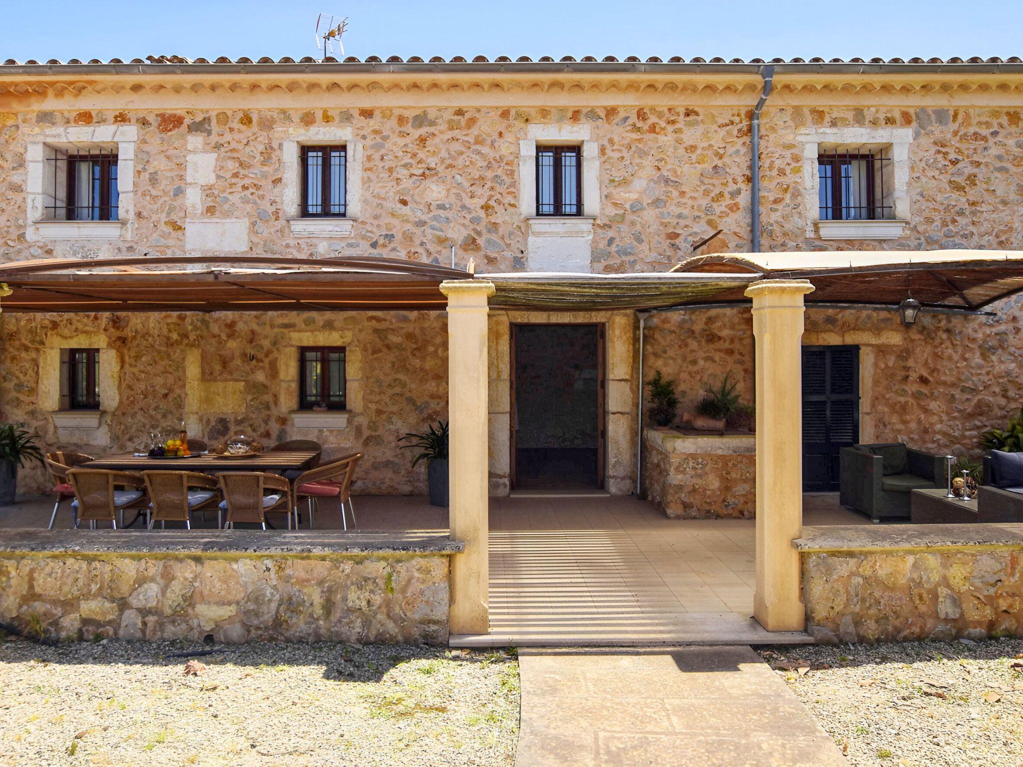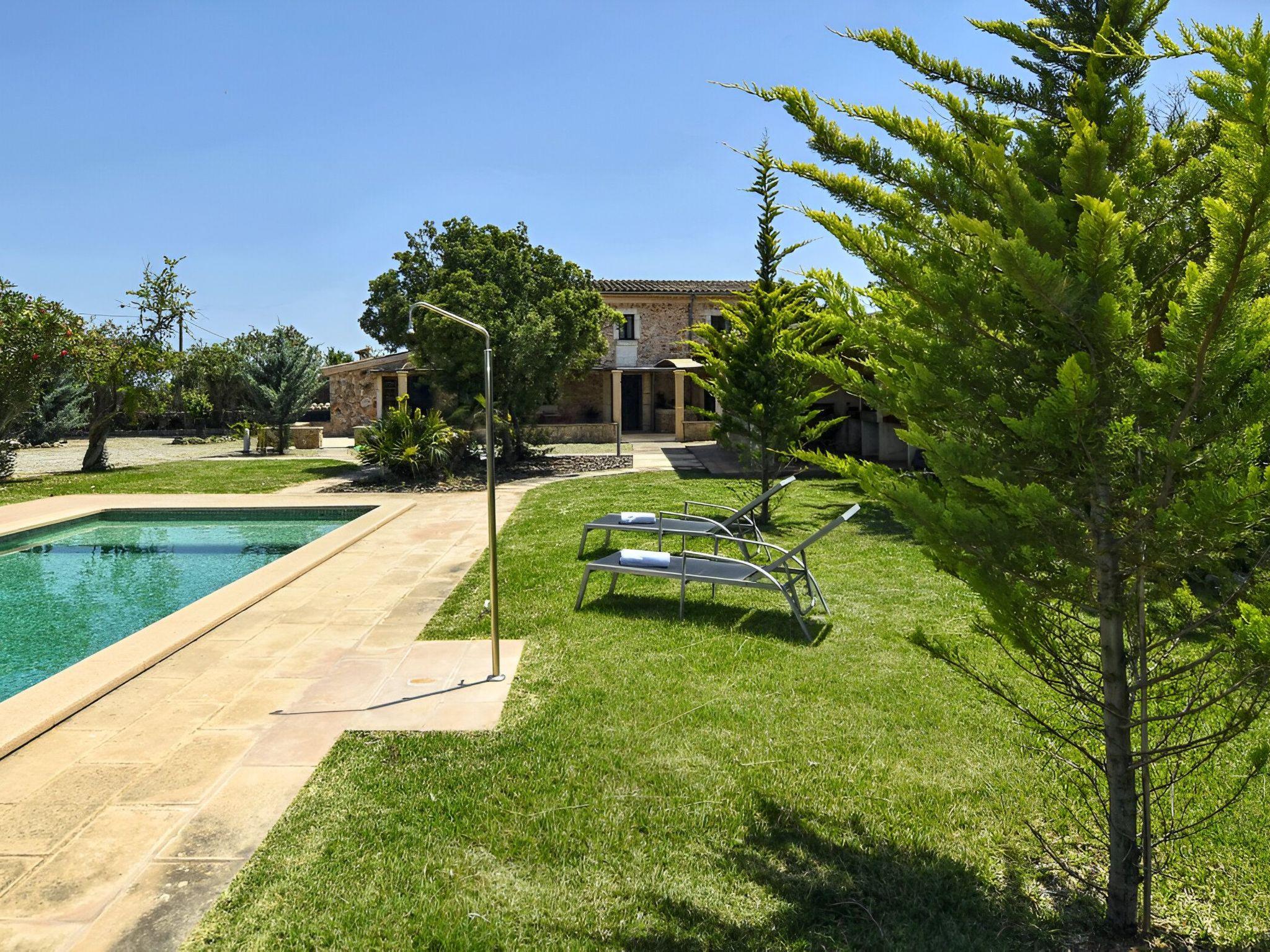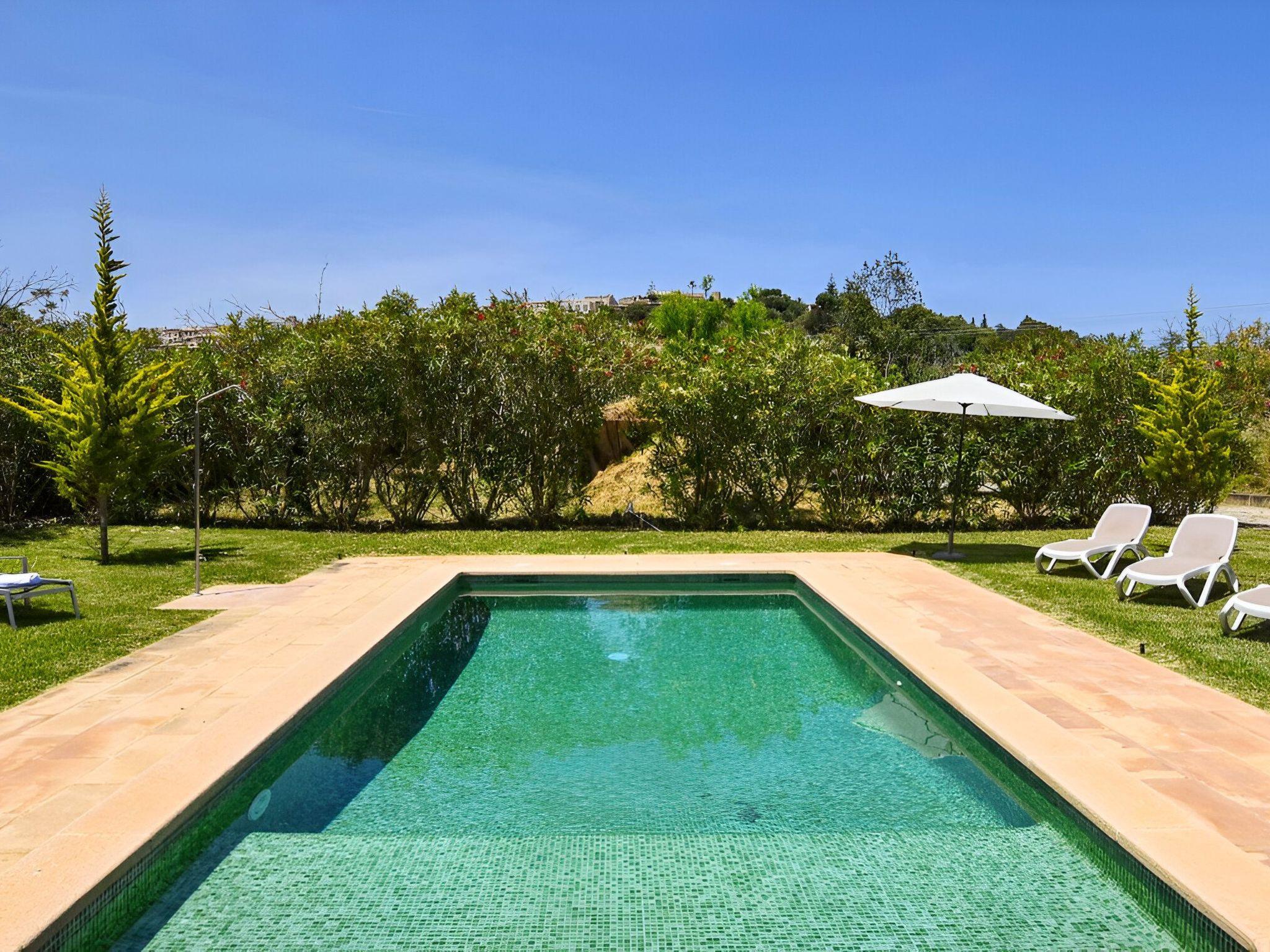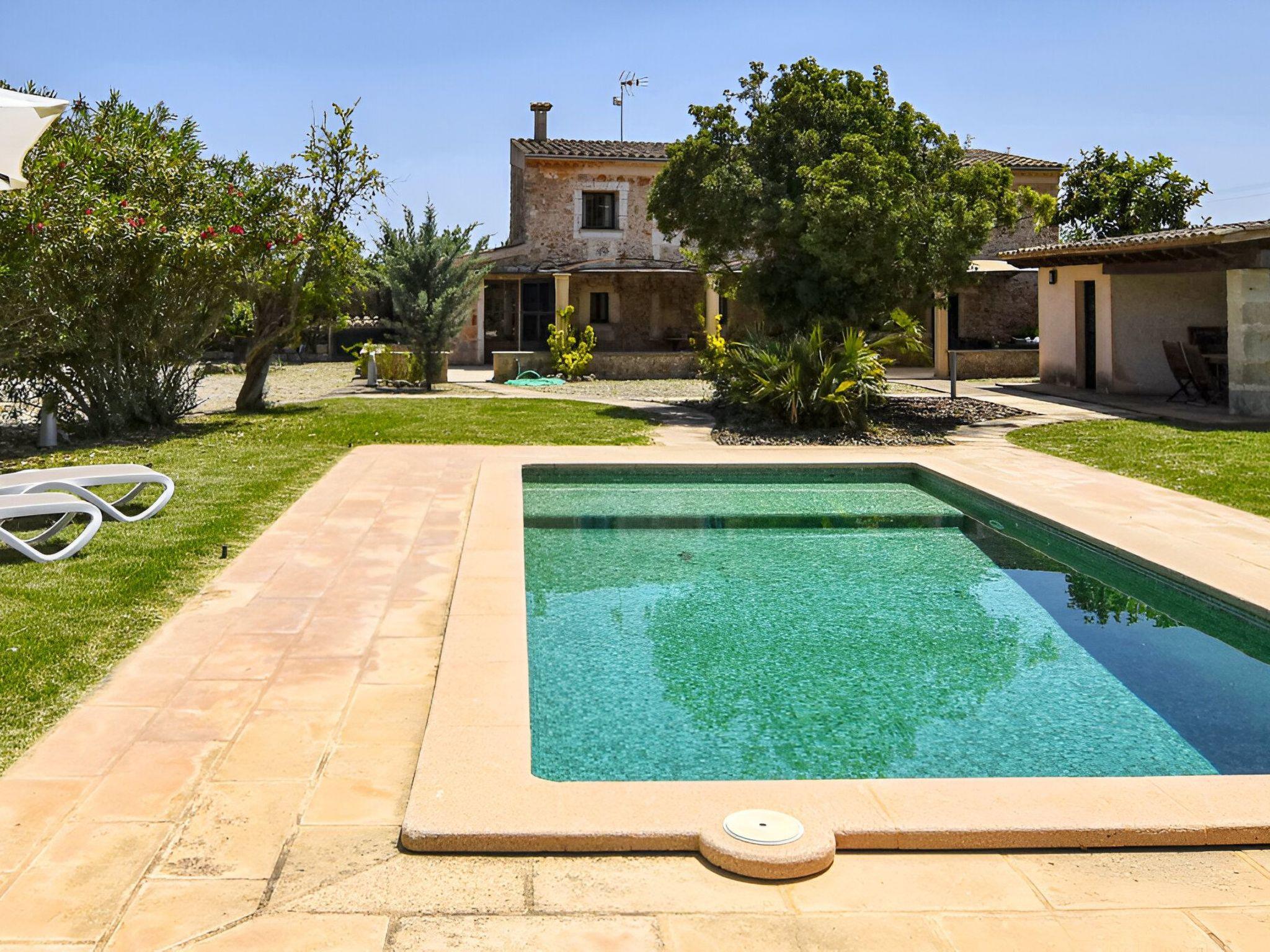 Die schattenspendende Terrasse ist ausgestattet mit einem Esstisch und einer chilligen Sofaecke. Von hieraus hat man einen wundervollen Blick auf den schönen Garten und das Dorf Buger. In Richtung Pool befindet sich links die überdachte Grillecke. Und vom Grillbereich geht es weiter zum privaten 8 m x 4 m Swimming Pool ( Tiefe 0,60m - 1,80m ) der in eine Rasenfläche eingebettet ist und die umliegenden hohen Heckenbüsche sorgen für die notwendige Privatsphäre. Zur Finca gehört zudem ein Stück Land mit ca. 5.500 m2 auf dem man Mandel-, Orangenbäume vorfindet.