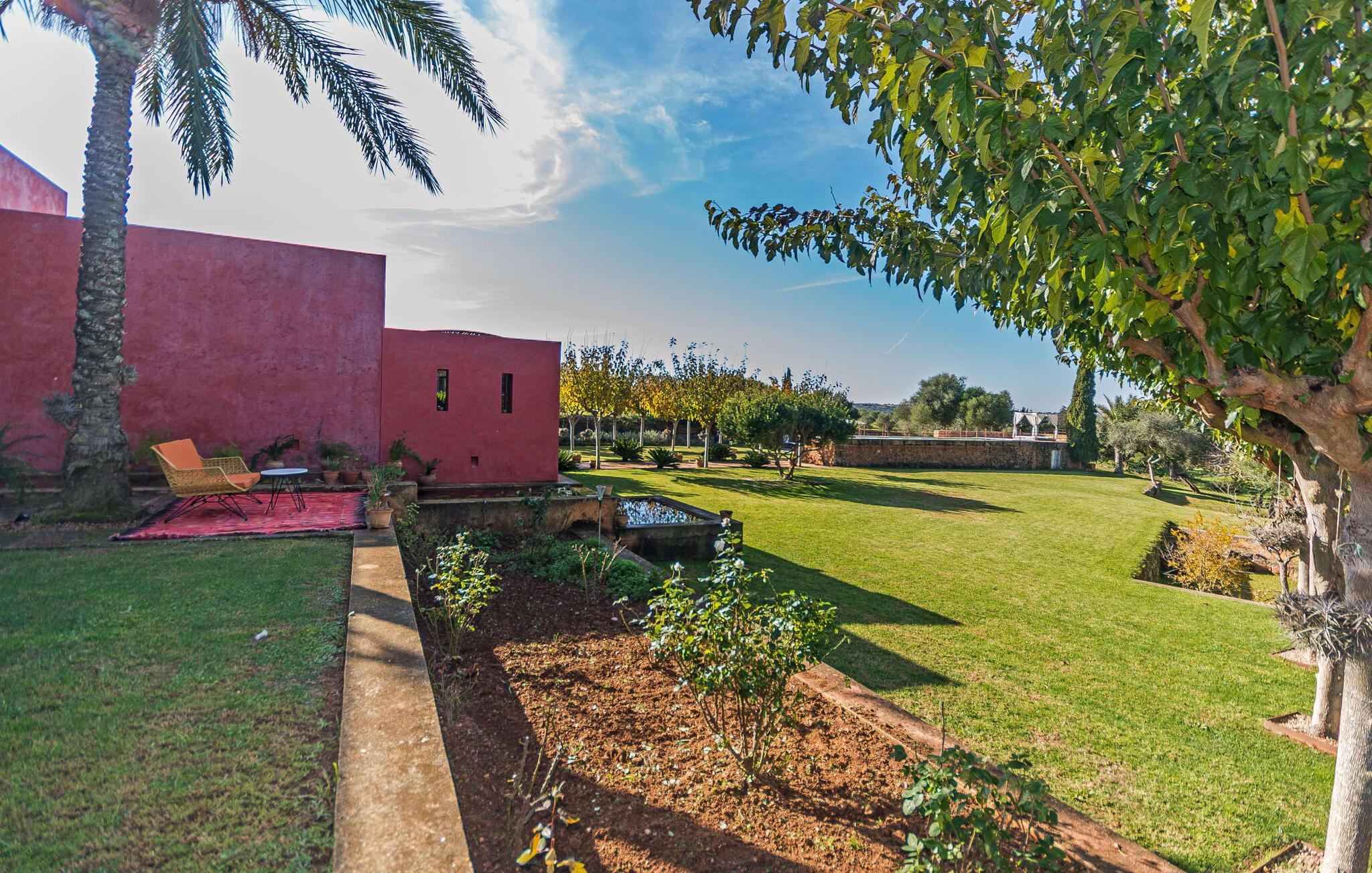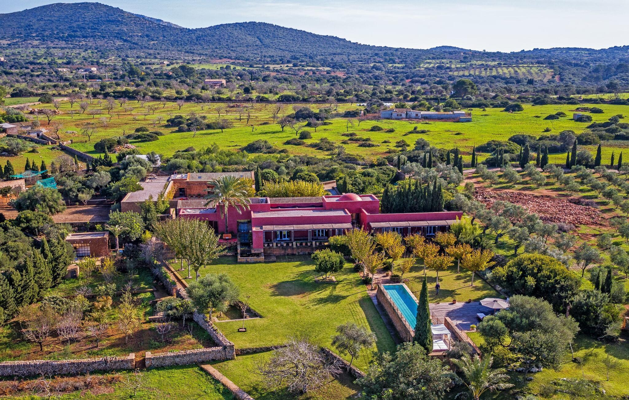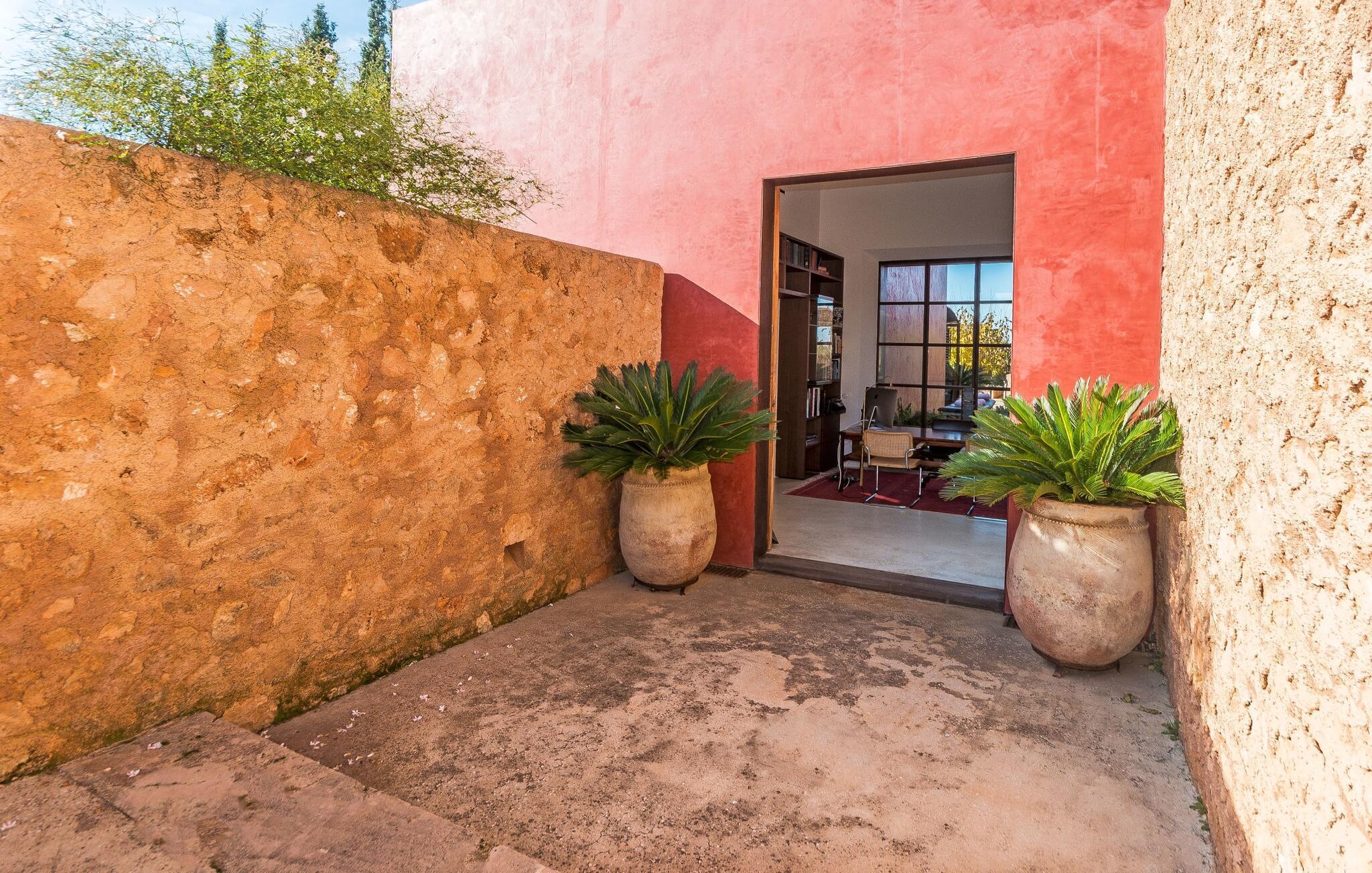 Eingebettet in die üppige Umgebung von Manacor empfängt Sie diese markante, purpurrot geschmückte Villa „Barranc de Son Cifre“ über eine von Zypressen gesäumte Asphaltauffahrt. Das maurisch inspirierte ehemalige Landgut wurde elegant renoviert und bietet einen lebendigen Kontrast zu seiner grünen Kulisse. Ein Carport bietet Platz für bis zu drei Fahrzeuge.