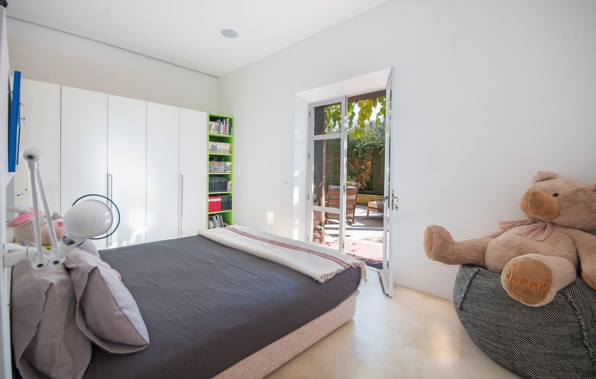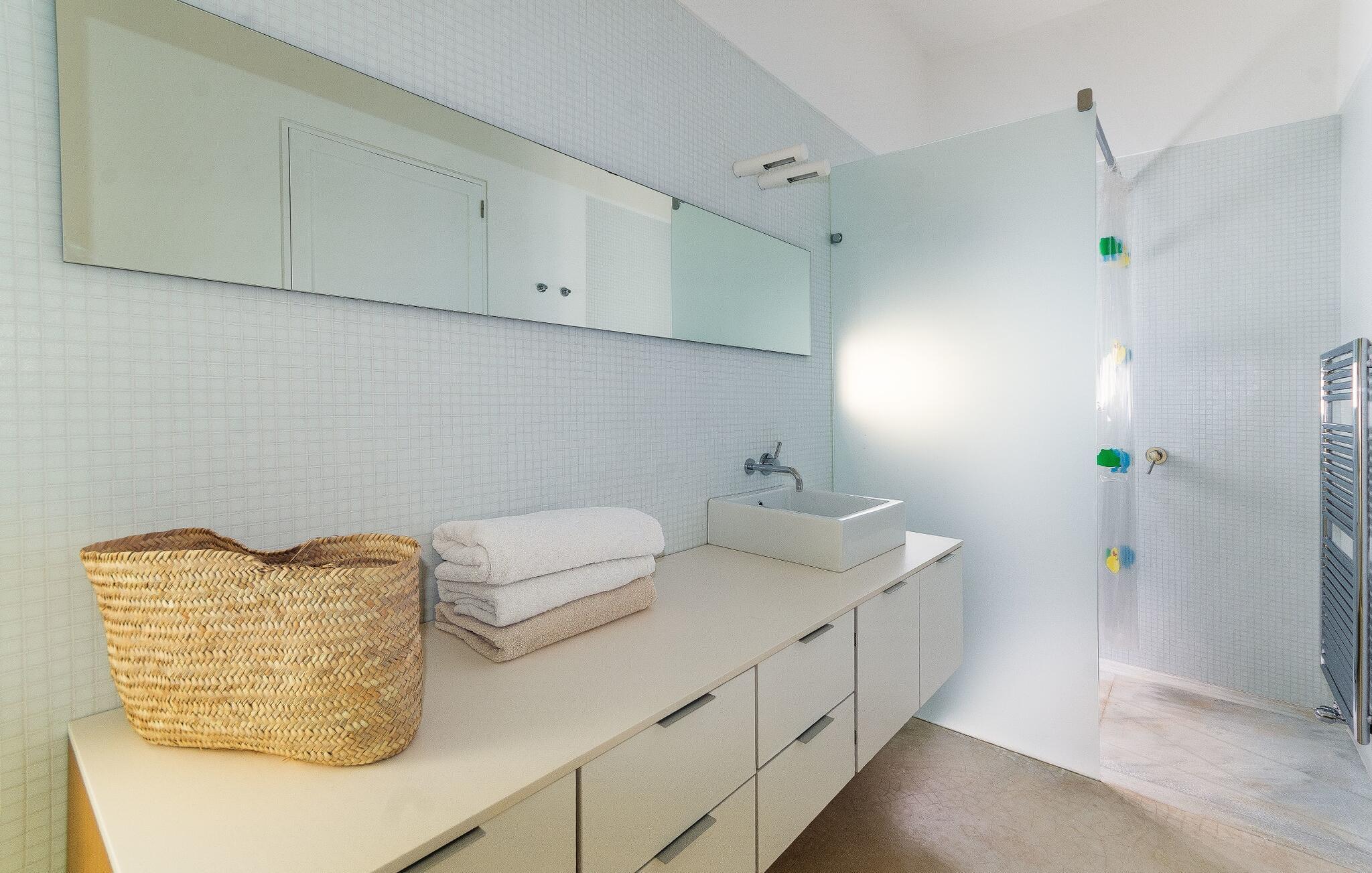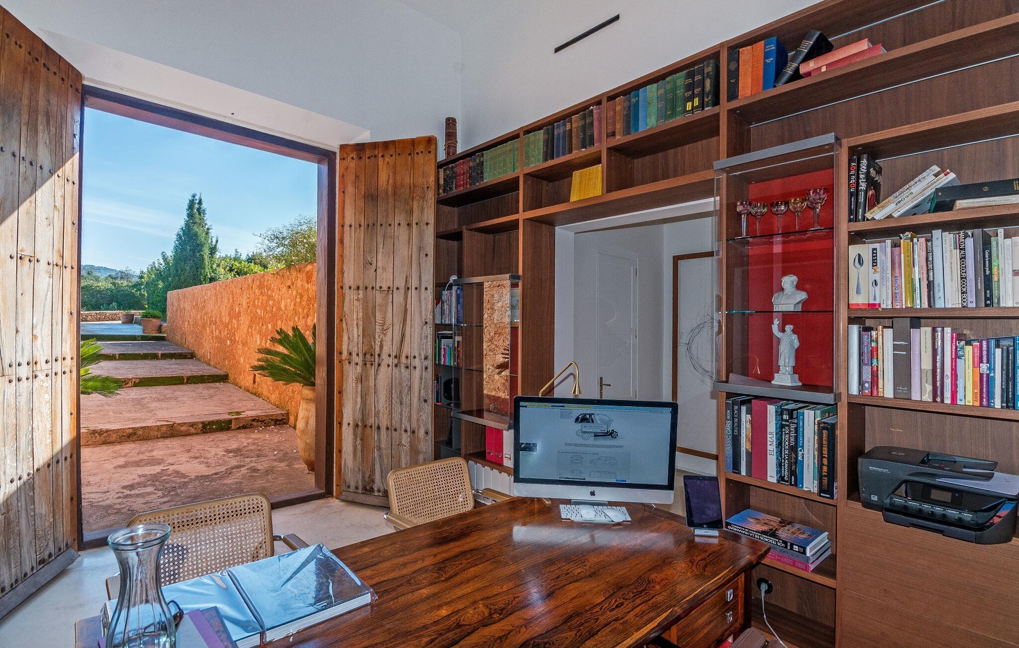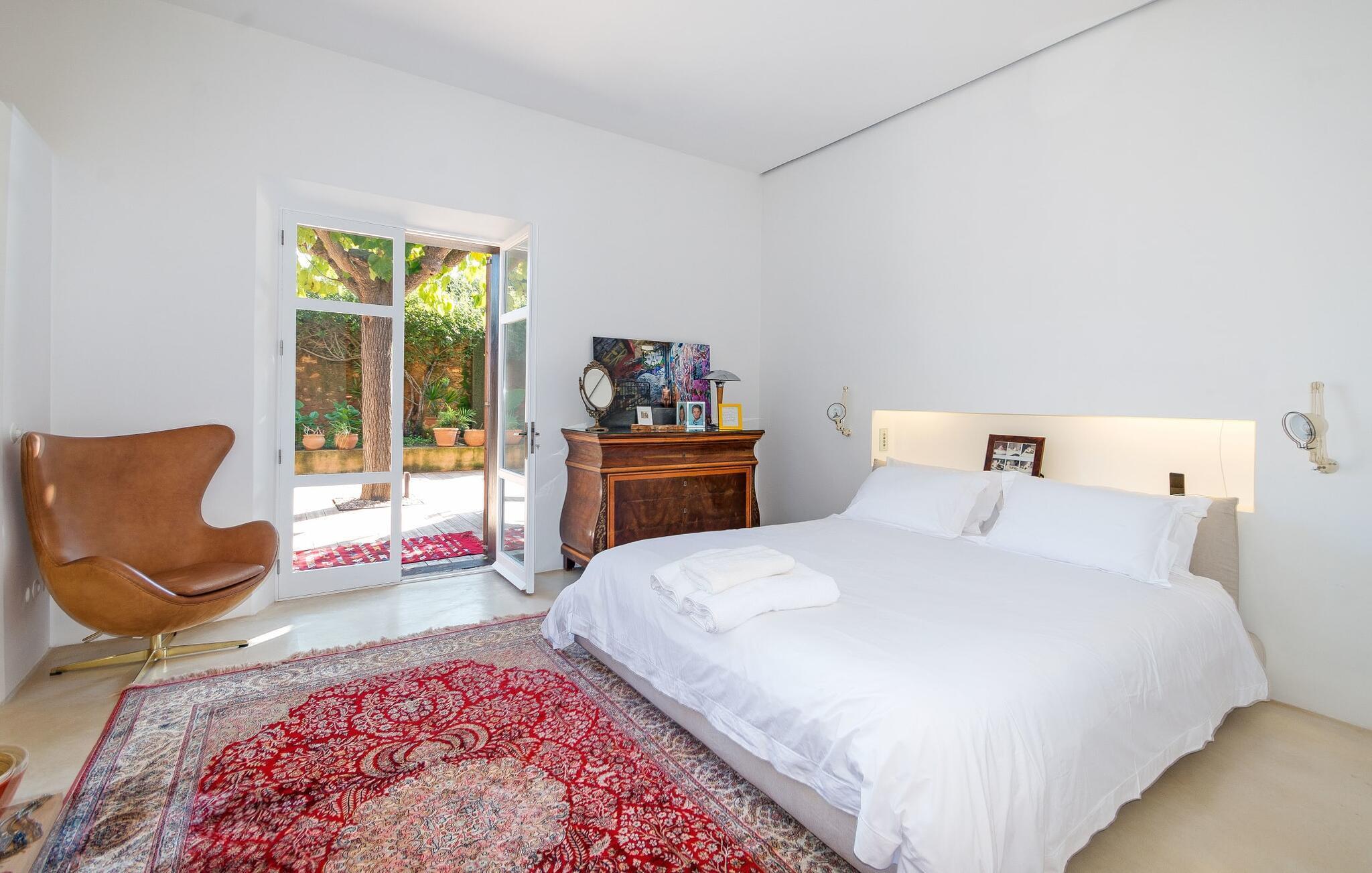 Im Inneren verbindet das klare, strukturierte Interieur moderne Designelemente mit Retro- und Holzakzenten und verfügt über einen Kamin, stilvolle Leuchten und antike Möbel. Es gibt vier komfortable Gästezimmer, jedes mit eigenem Bad und geräumigen Doppelbetten. Das luftige Wohnzimmer, das Studio und die stilvolle Küchenzeile sind durch große Glasfronten mit dem Außenbereich verbunden und ermöglichen ein nahtloses Leben im Innen- und Außenbereich. Das kleine Esszimmer lädt zu Gesprächen ein, während die windgeschützte Terrassenlounge als gemütlicher Treffpunkt dient.