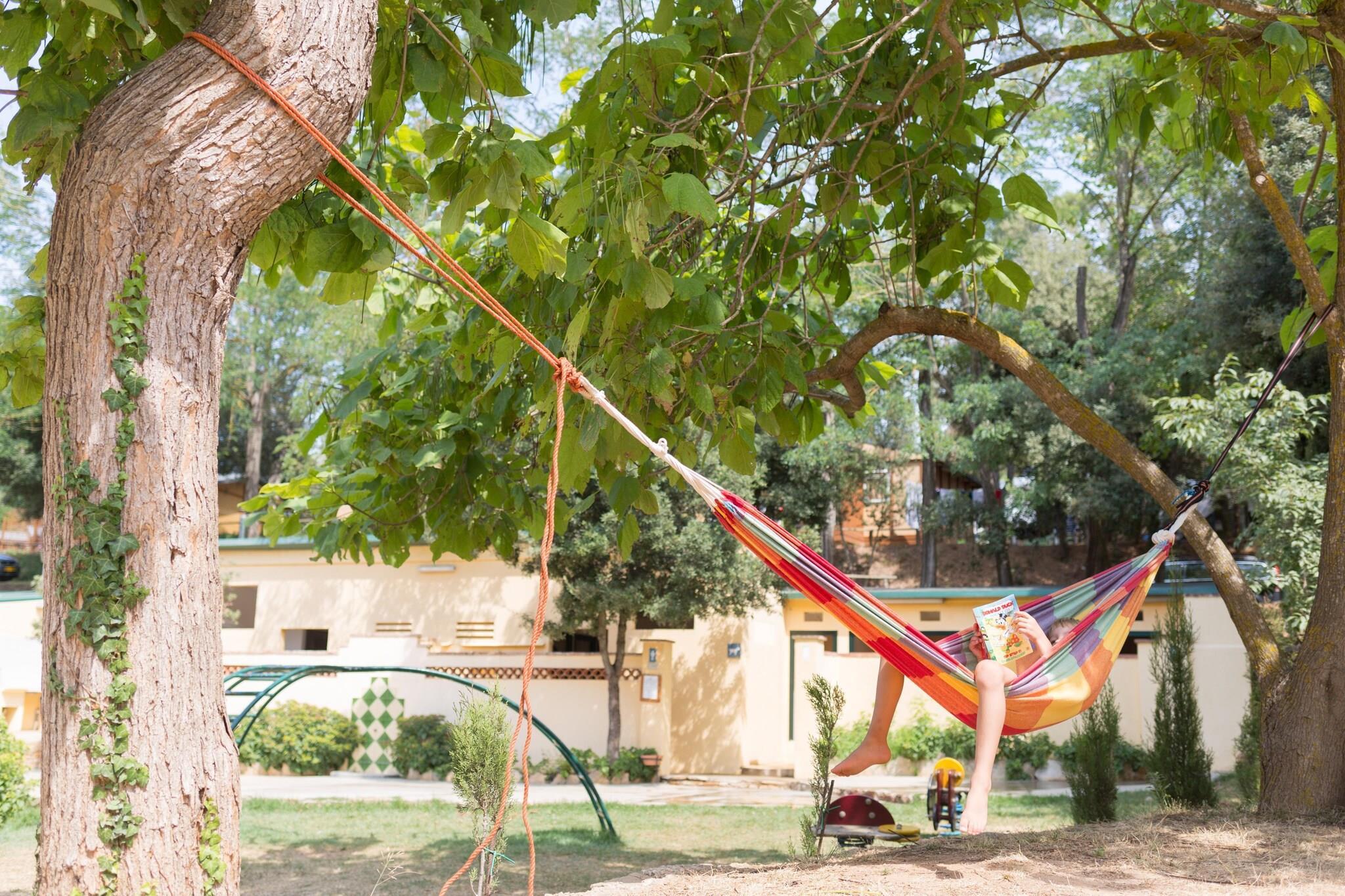 Dieses schöne, freistehende Safarizelt befindet sich auf dem schönen, grünen, natürlichen Ferienpark Camping Begur, nur 2,5 km vom Strand der Costa Brava (Platja Fonda) entfernt. Das Zentrum von Begur ist ebenfalls 2,5 km entfernt. Das Safarizelt ist komfortabel, gemütlich und komplett eingerichtet. Hier erleben Sie echtes Camping-Feeling, aber mit dem Komfort eines Ferienhauses. Es gibt einen Wohnbereich mit offener Küche, die mit einem Kühlschrank mit Gefrierfach und einem Herd ausgestattet ist. Es gibt drei Schlafräume. Zwei davon sind mit je zwei Einzelbetten, die als Doppelbetten gestellt werden können, ausgestattet. Ein Schlafzimmer verfügt über ein Einzelbett. Das Safarizelt hat kein eigenes Badezimmer. Für die Dusche und das WC nutzen Sie die zentralen Sanitäranlagen des Campingplatzes. Draußen finden Sie eine schöne überdachte Terrasse mit Gartenmöbeln. Es gibt einen Parkplatz für ein Auto in der Nähe des Safarizeltes. Im Ferienpark Camping Begur können verschiedene Safarizelte und Zeltlodges für fünf Personen gebucht werden. Einige Zelttypen verfügen über eigene Sanitäranlagen.