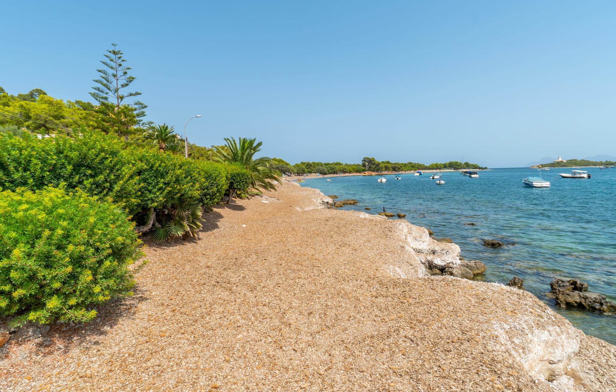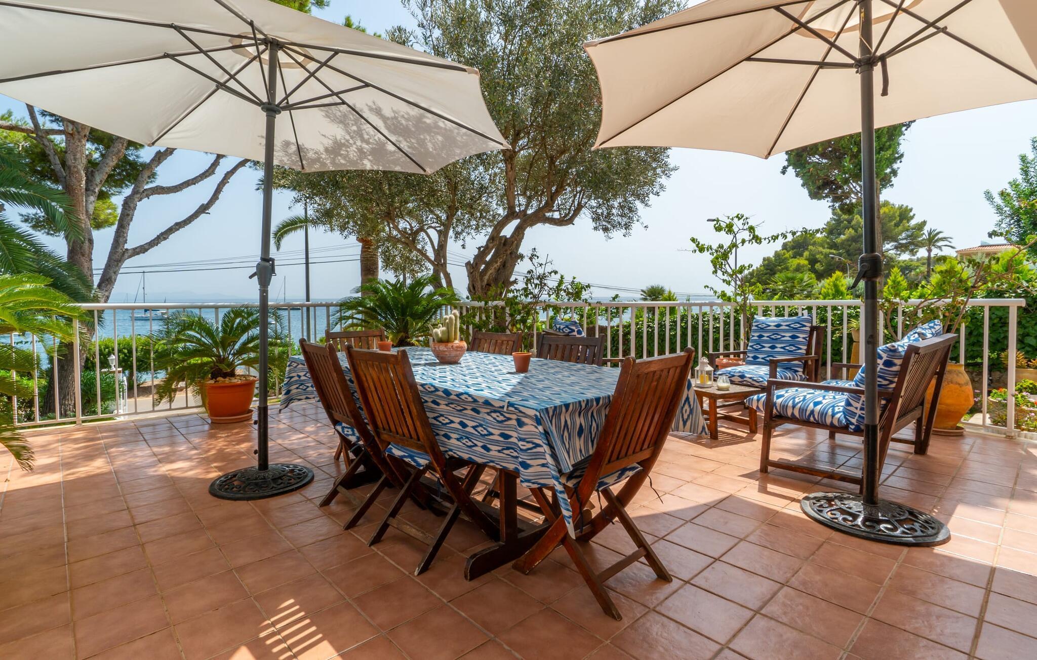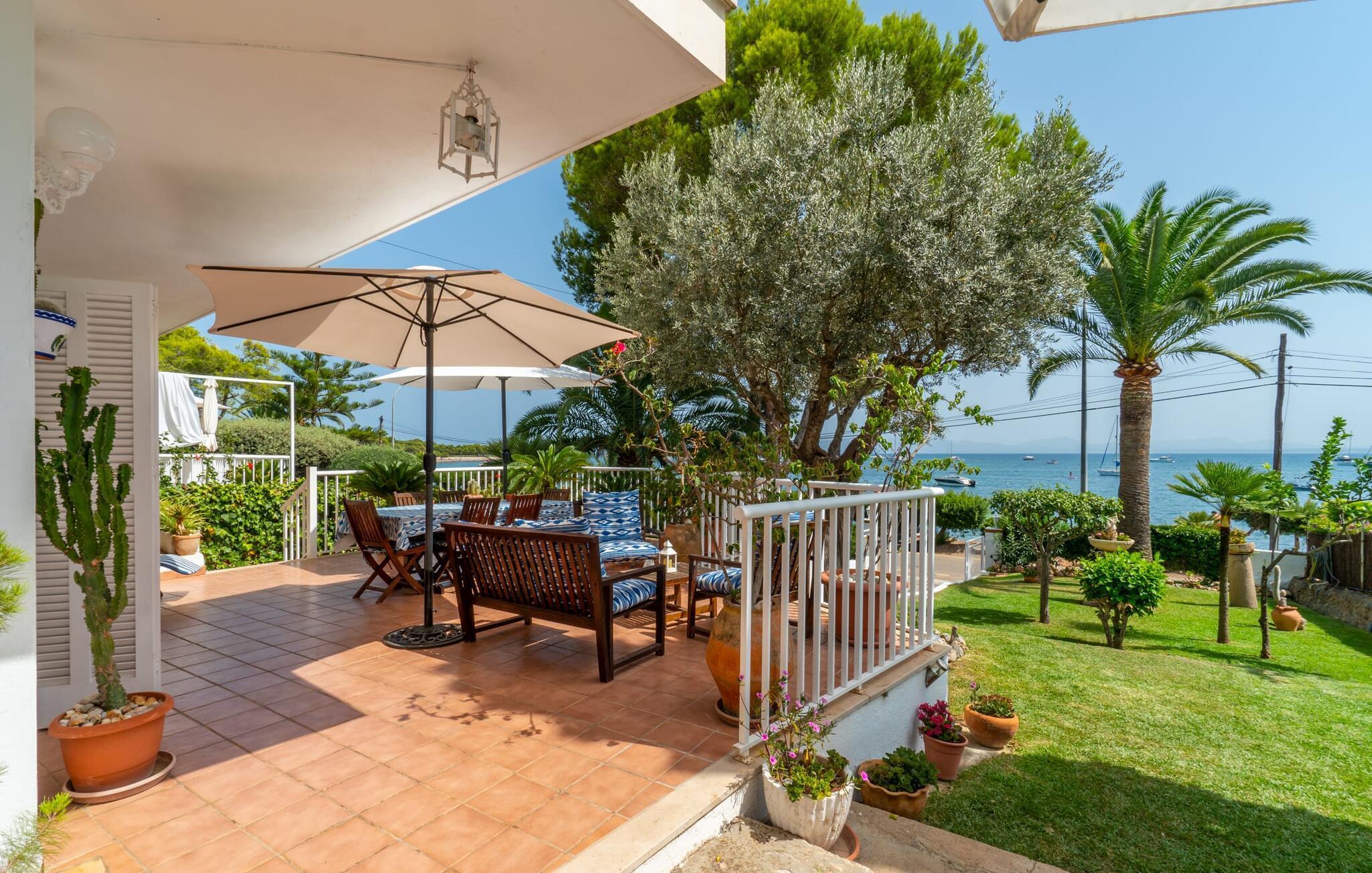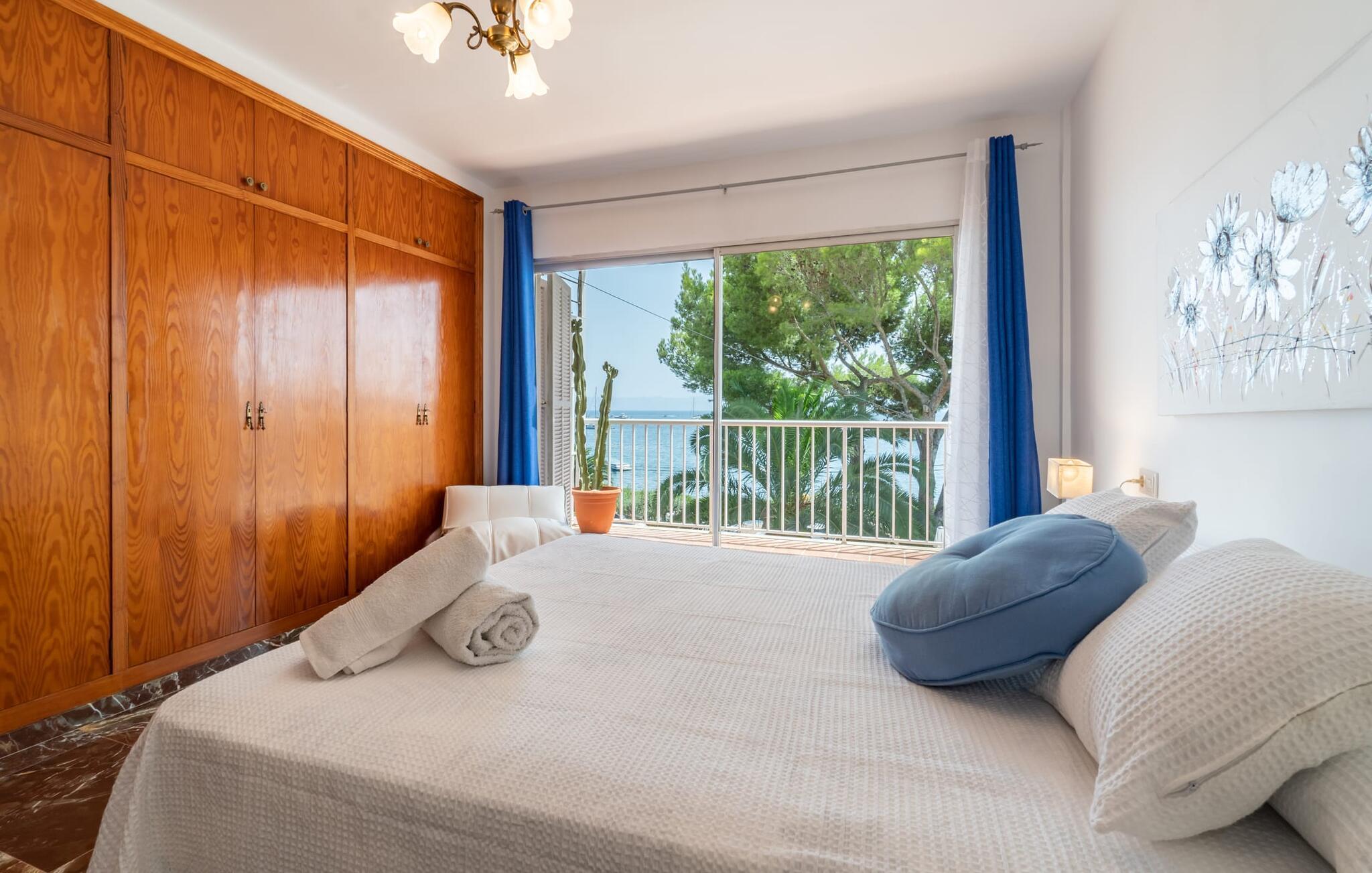 Ein großzügiges Wohn-Esszimmer mit verschiedenen gemütlichen Bereichen, zusätzlich optisch getrennt durch eine Stufe und ein kleines Geländer, bietet viele einladende Möglichkeiten zum Verweilen und Entspannen im Innenbereich. Helle Möbel, Böden und Wände sorgen für ein angenehmes Licht, farbenfrohe Dekoration setzt kleine, wirkungsvolle Akzente. Die Küche, direkt nebenan und mit direktem Ausgang ins Freie, ist selbstverständlich komplett ausgestattet und somit ideal für die Selbstversorgung im Urlaub geeignet. Auf dieser Wohnebene befindet sich auch ein Badezimmer, wohingegen sich die vier Doppelschlafzimmer – teilweise mit riesigen Fenstern und entsprechend atemberaubender Aussicht – sowie das zweite Badezimmer im Obergeschoss befinden, wo sich auch der umlaufende Balkon befindet. Dieses Ferienhaus auf Mallorca ist an seiner Lage direkt am Meer kaum zu übertreffen! Nur wenige Schritte trennen die Villa „Bell Punt“ vom Wasser, auf dessen Wellen die Boote sanft schaukeln. 600 m² Grundstück, angelegt als hübscher Garten, ergänzen den maritimen Ort stimmungsvoll. Dank der Lage an einer kleinen Straße mit wenig Verkehr ist das Einkaufen einfach und mehrere Strände wie Alcananda oder Cala Ponset (400-500 m) liegen in der Nähe.