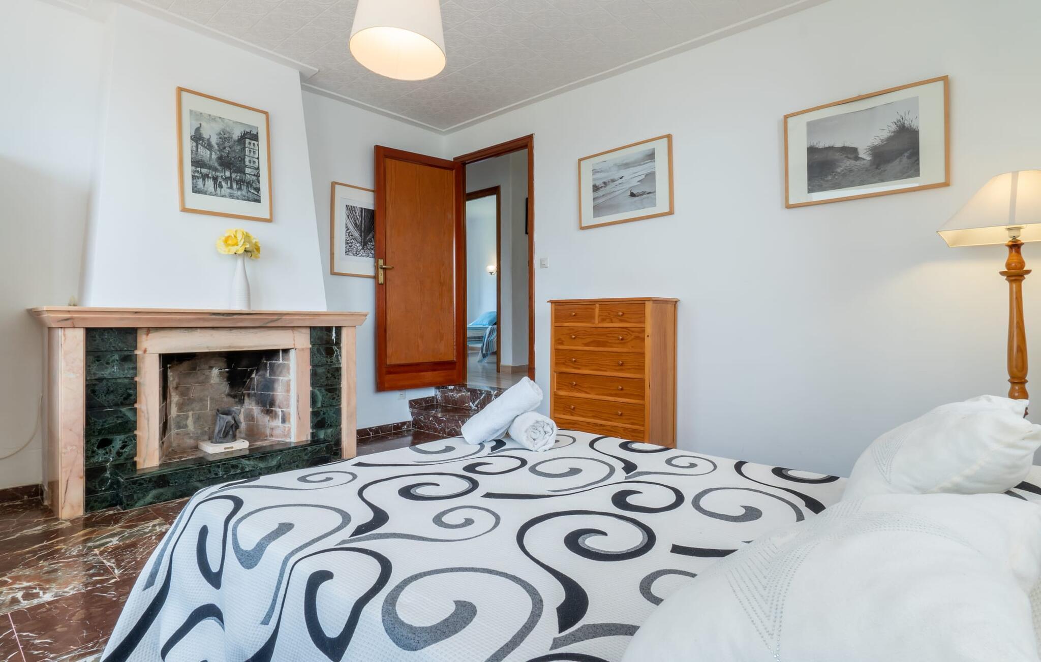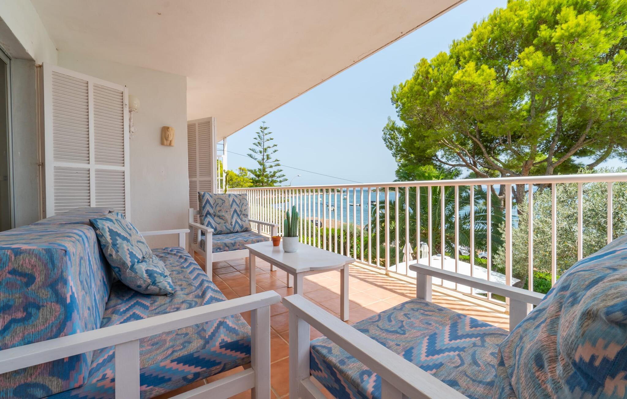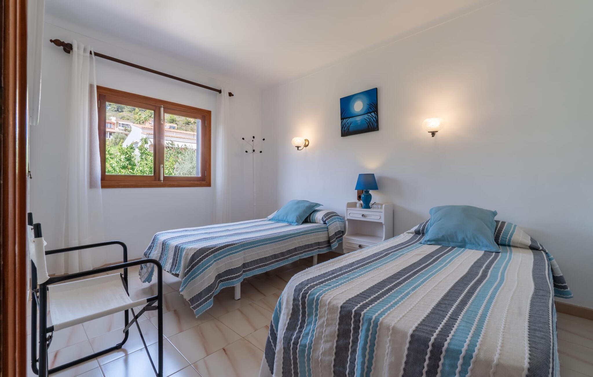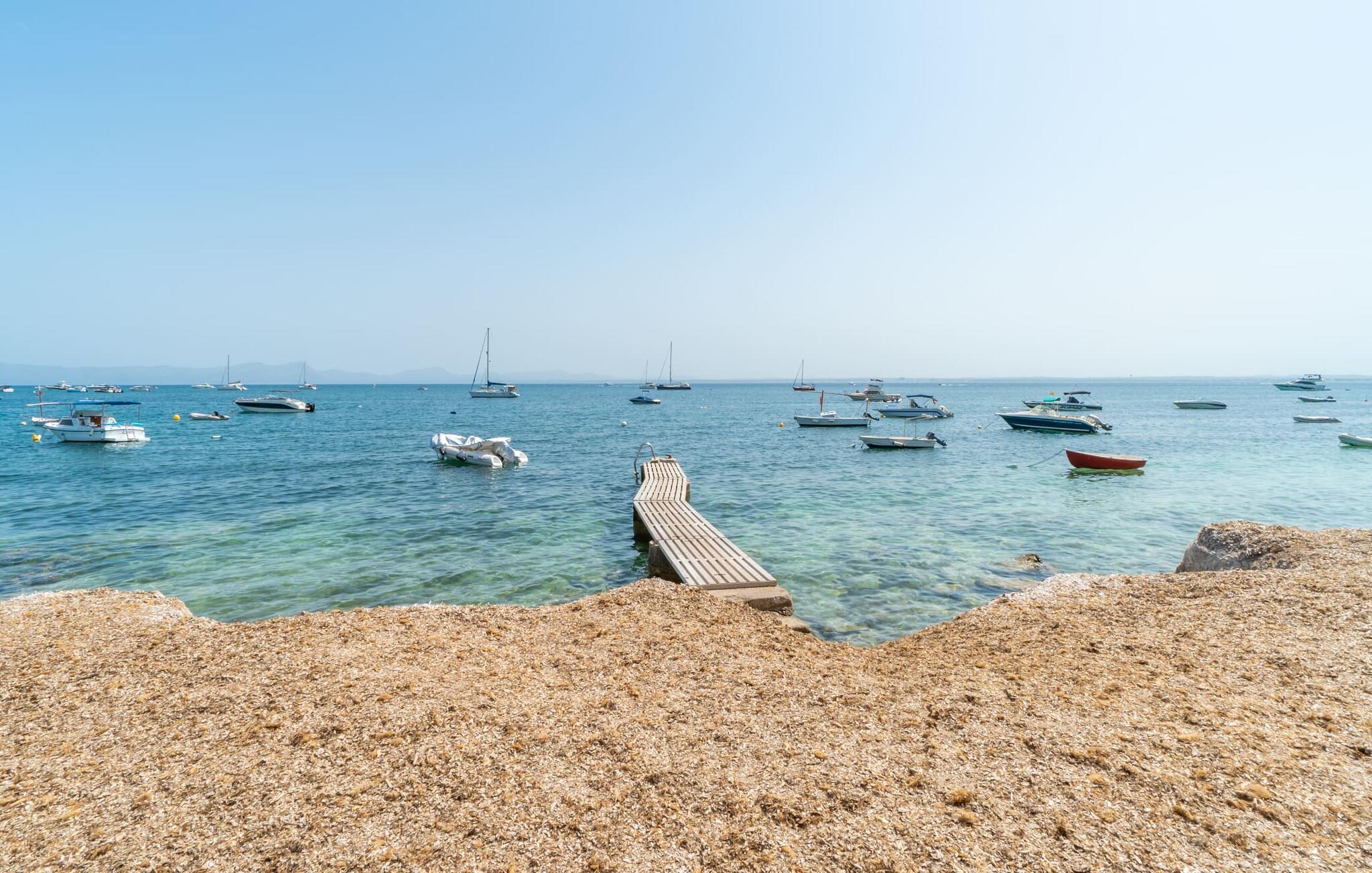Ein großzügiges Wohn-Esszimmer mit verschiedenen gemütlichen Bereichen, zusätzlich optisch getrennt durch eine Stufe und ein kleines Geländer, bietet viele einladende Möglichkeiten zum Verweilen und Entspannen im Innenbereich. Helle Möbel, Böden und Wände sorgen für ein angenehmes Licht, farbenfrohe Dekoration setzt kleine, wirkungsvolle Akzente. Die Küche, direkt nebenan und mit direktem Ausgang ins Freie, ist selbstverständlich komplett ausgestattet und somit ideal für die Selbstversorgung im Urlaub geeignet. Auf dieser Wohnebene befindet sich auch ein Badezimmer, wohingegen sich die vier Doppelschlafzimmer – teilweise mit riesigen Fenstern und entsprechend atemberaubender Aussicht – sowie das zweite Badezimmer im Obergeschoss befinden, wo sich auch der umlaufende Balkon befindet. Dieses Ferienhaus auf Mallorca ist an seiner Lage direkt am Meer kaum zu übertreffen! Nur wenige Schritte trennen die Villa „Bell Punt“ vom Wasser, auf dessen Wellen die Boote sanft schaukeln. 600 m² Grundstück, angelegt als hübscher Garten, ergänzen den maritimen Ort stimmungsvoll. Dank der Lage an einer kleinen Straße mit wenig Verkehr ist das Einkaufen einfach und mehrere Strände wie Alcananda oder Cala Ponset (400-500 m) liegen in der Nähe.