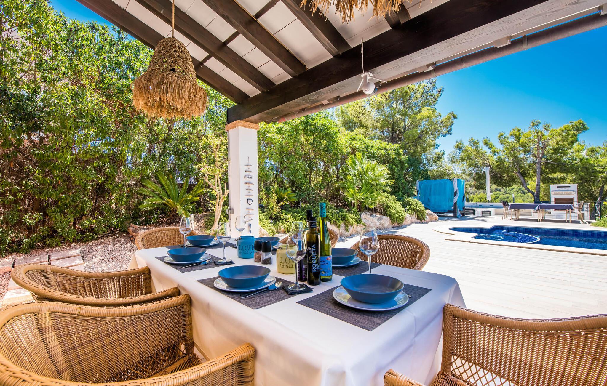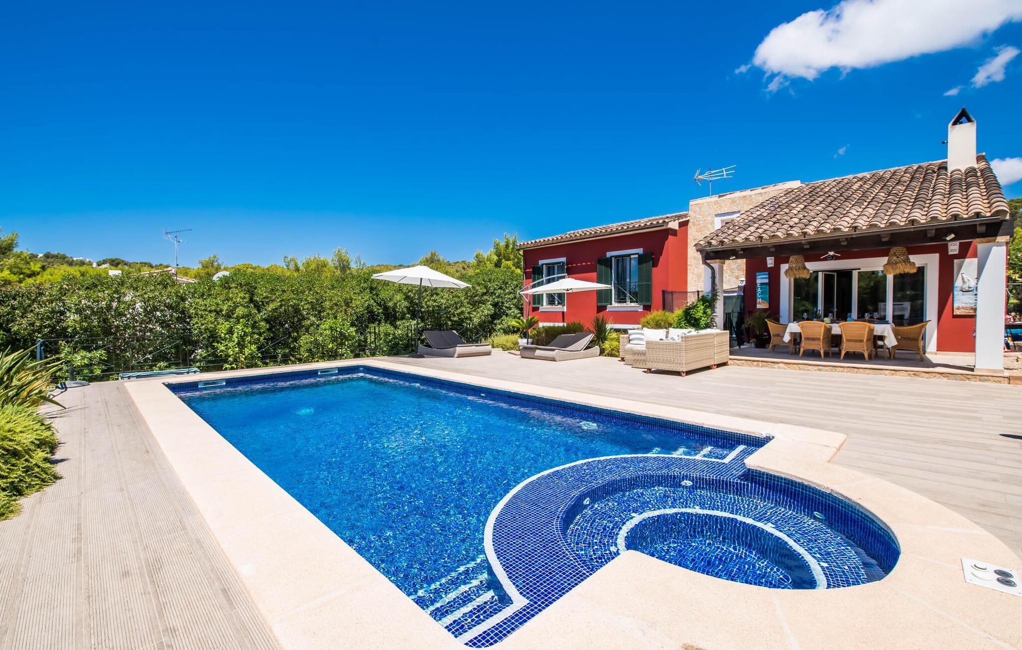 Ein kleines Paradies erwartet den Gast beim Betreten des 1.600 m² großen Areals, auf dem die strahlend rote Villa „Bella Mallorca“ thront. Wer den schönsten Ort zum Entspannen sucht, hat schnell die Qual der Wahl, denn die verschiedenen Orte konkurrieren in puncto Ästhetik, Komfort und Zweckmäßigkeit miteinander. Am besten probiert man die verschiedenen Möglichkeiten nacheinander aus! Direkt neben dem Haus, unter einem Dach und mit herrlichem Blick auf den Poolbereich, befindet sich der schöne Esstisch: der perfekte Treffpunkt für Mahlzeiten im Freien. Unter freiem Himmel sitzt man gleich nebenan in der schicken Polyrattan-Lounge, die stilistisch wunderbar mit den passenden Doppel-Daybeds harmoniert. Eine andere Perspektive bietet das balinesische Bett, das wie das andere Outdoor-Sofa etwas abseits liegt, aber dennoch auf der großzügigen Holzfläche liegt, die sich rund um den Pool schmiegt. Auch in diesem hinteren Bereich steht ein zweiter Esstisch zur Verfügung, so dass Sie auch bei voller Belegung ungestört Ihre Privatsphäre genießen können. Die Außenküche mit Kühlschrank, Weinkühlschrank, Spüle, Pizzaofen und integriertem Gasgrill lädt dazu ein, das Urlaubsleben tagsüber tatsächlich komplett nach draußen zu verlegen. Für die nötige Abkühlung zwischendurch sorgt der große Pool. Auch umweltbewusste Nachhaltigkeit wird groß geschrieben. Diese Finca ist mit einer Photovoltaikanlage ausgestattet und erzeugt Strom über Sonnenenergie. Über eine Regenwassertankanlage wird der Garten zudem ökologisch sinnvoll bewässert.