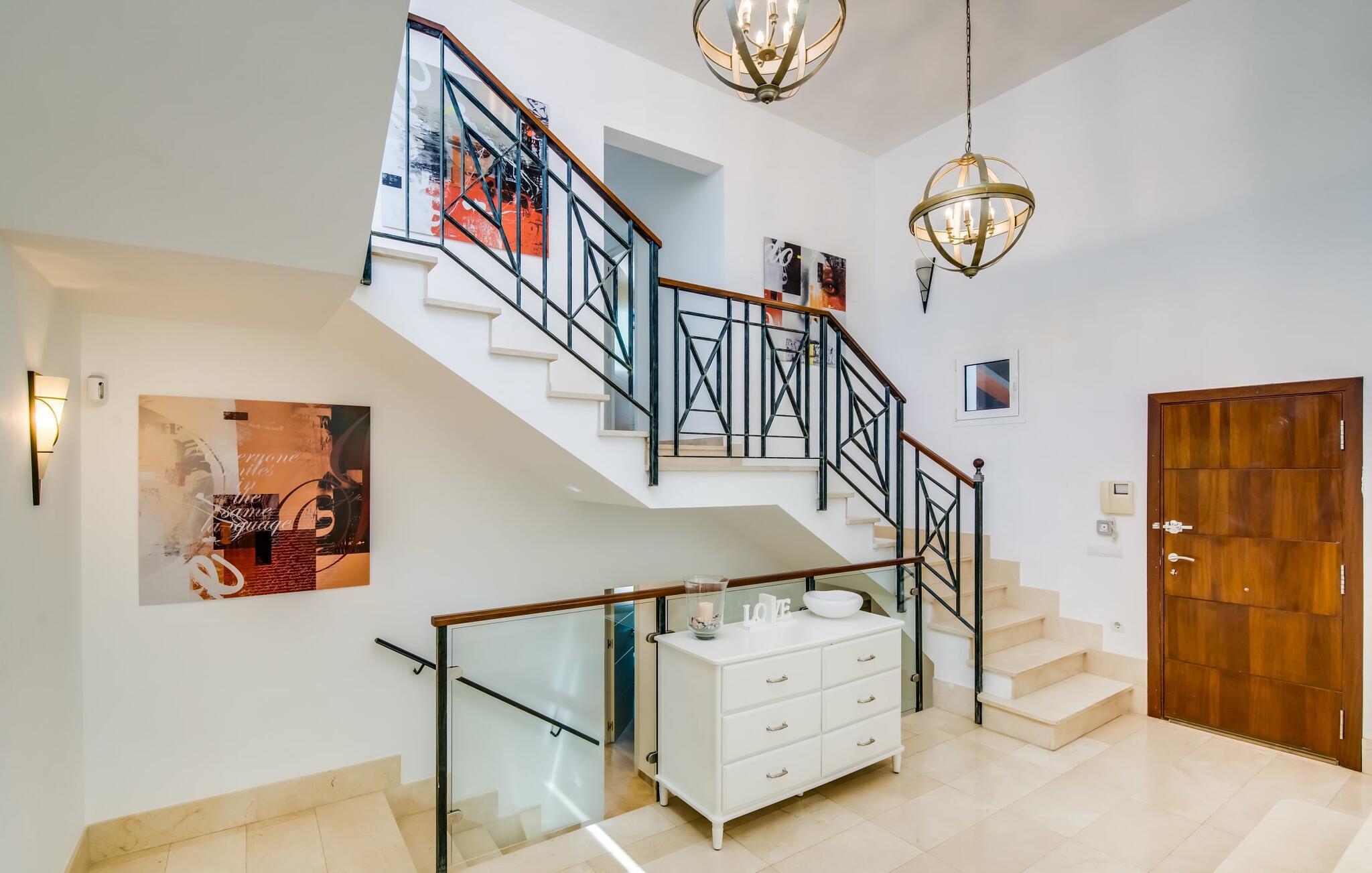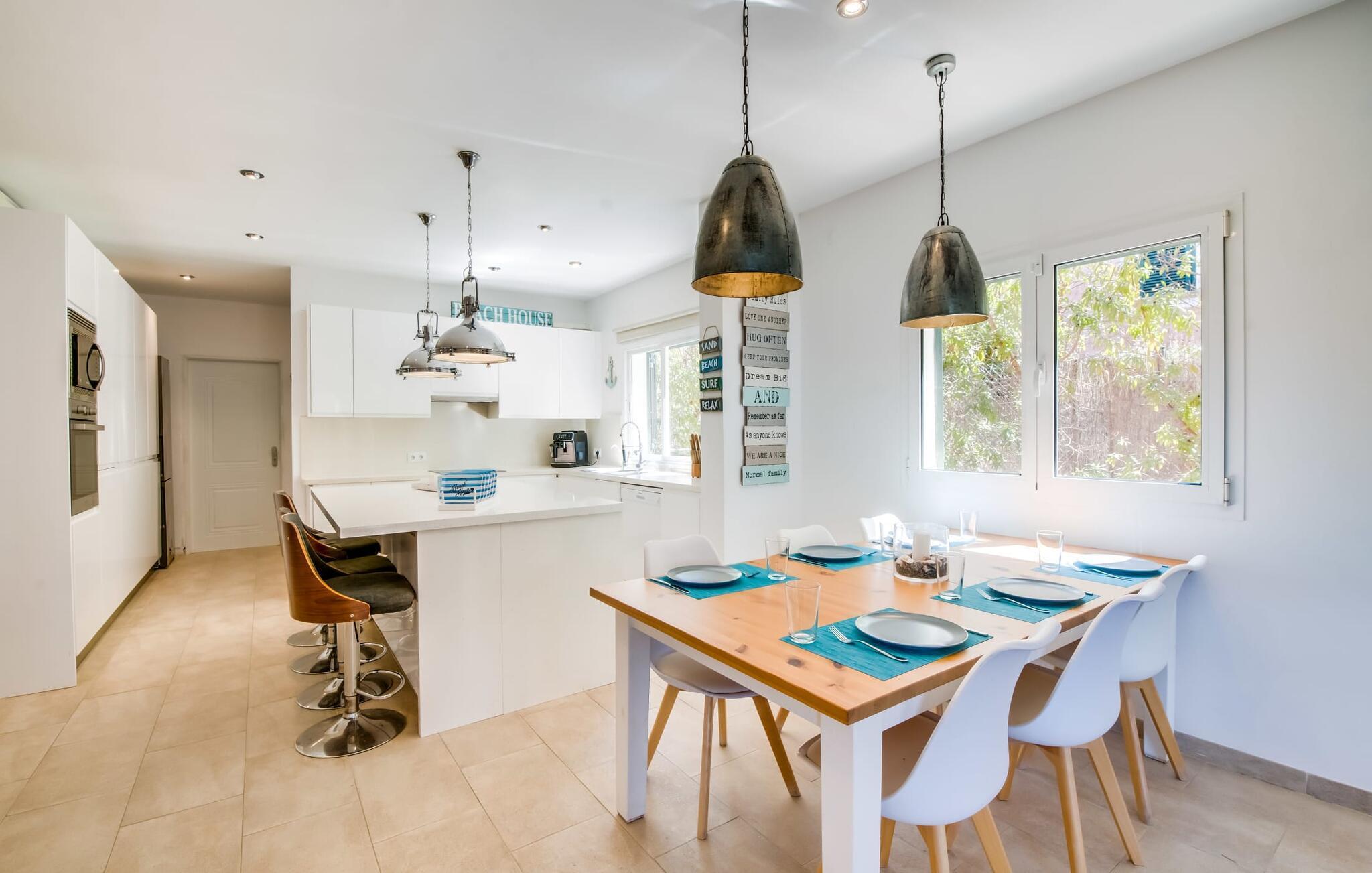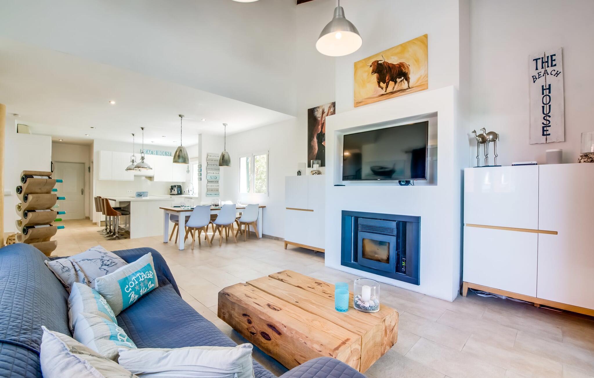 Bis hierher ist so viel klar geworden: Zeit unter freiem Himmel kann hier als echte Quality Time verbracht werden. Das Innere dieser Villa auf Mallorca hingegen lädt zweifellos dazu ein, ausgiebige Stunden im Innenbereich zu verbringen. Hier sind Ausstattung, Design und Dekoration umfassend, aber nie aufdringlich. Viel Weiß bildet den Rahmen für allerlei farbenfrohe Accessoires und Details, die durch ihre Platzierung im Raum eindrucksvoll zur Geltung kommen und ein äußerst geschmackvolles Ambiente verbreiten. Und so könnte es sein, dass man auf dem Sofa sitzt und glaubt, mitten in einem Schöner-Wohnen-Katalog zu sein... – hier fühlt man sich ganz leicht zu Hause! Auch die hervorragende Ausstattung trägt dazu bei, dass Sie hier rundum ankommen und sich in dem vorhandenen Komfort wohlfühlen können. Die offene Gestaltung von Wohn-, Ess- und Küchenbereich unterstreicht den Gemeinschaftscharakter dieses Ferienhauses. Auch der Raum, der sich weiter zur Eingangshalle und zum Treppenhaus hin öffnet, unterstreicht – auch mit den imposanten Säulen – die Großzügigkeit des Hauses, das mit 280 m² Wohnfläche tatsächlich viel Freiraum bietet. Stilvolle Ruheräume verteilen sich auf verschiedene Ebenen: Ein paar Stufen tiefer liegen zwei Doppelschlafzimmer und zwei Badezimmer, eines davon en suite. Im Obergeschoss befinden sich die beiden weiteren Schlafzimmer und Badezimmer, eines davon en Suite. Wir von Fincallorca geben diesem Haus, das auf ganzer Linie überzeugt, eine besondere Empfehlung!