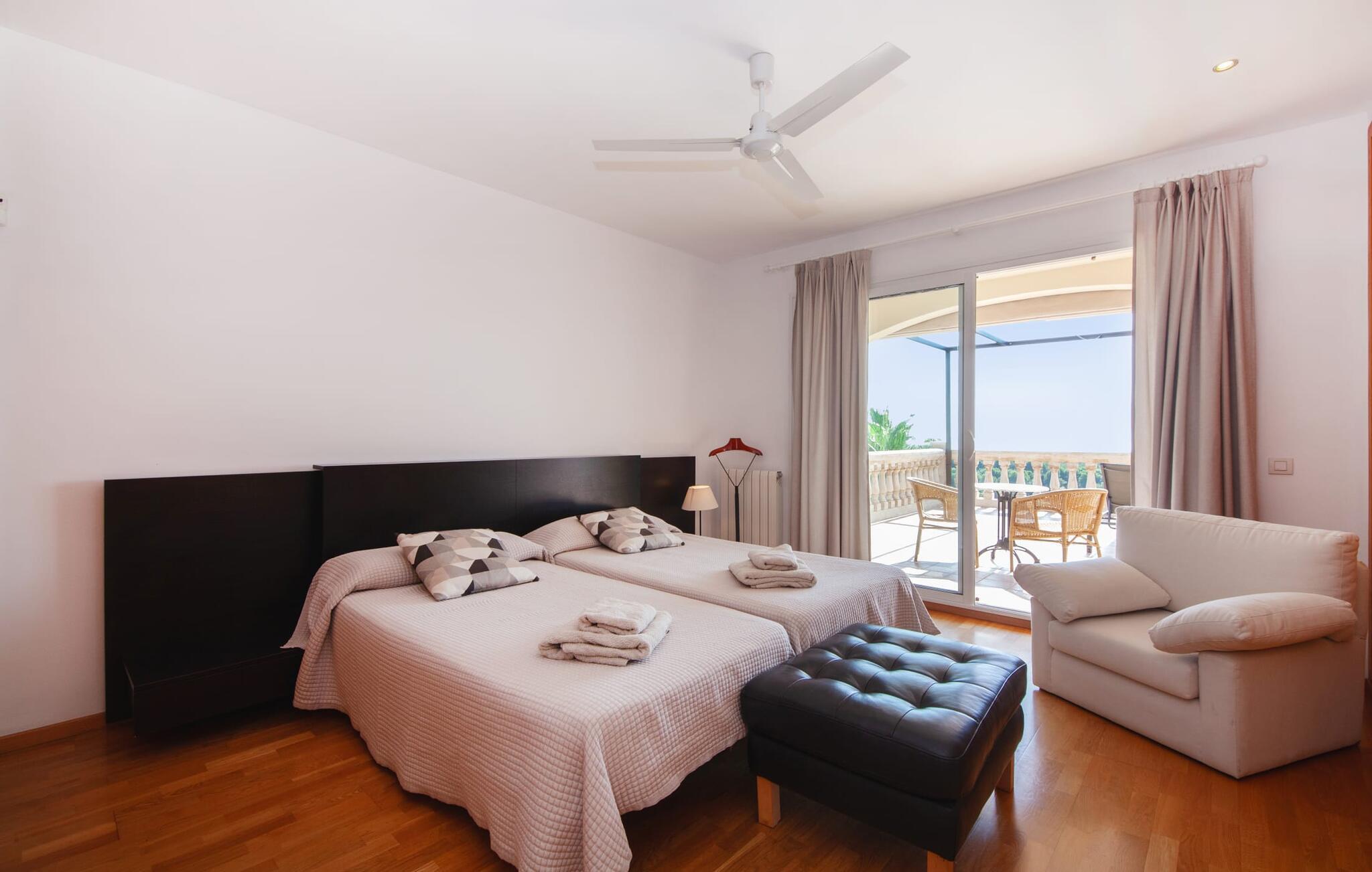 Im Obergeschoss befinden sich drei geräumige Doppelzimmer, eines davon mit eigenem Bad, sowie zwei weitere Badezimmer. Alle Schlafzimmer haben direkten Zugang zur oberen Terrasse. Die nach Süden ausgerichteten Fenster sind mit Fensterläden aus Holz ausgestattet und sowohl das Erdgeschoss als auch ein Schlafzimmer im Obergeschoss verfügen über Deckenventilatoren. Die Villa ist auf jeder Etage mit einer Klimaanlage ausgestattet, die für Komfort während Ihres gesamten Aufenthalts sorgt.