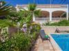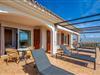 Den ersten Stock erreichen Sie über einen Aufzug in der Garage oder eine Außentreppe. Eine große, überdachte Balkonterrasse bietet einen herrlichen Blick über den Pool und das Mittelmeer, ideal für Mahlzeiten im Freien mit einem mobilen Grill. Die erhöhte, mit Sonnenliegen geschmückte und von Palmen beschattete Poolterrasse unterstreicht den mediterranen Charme der Villa.